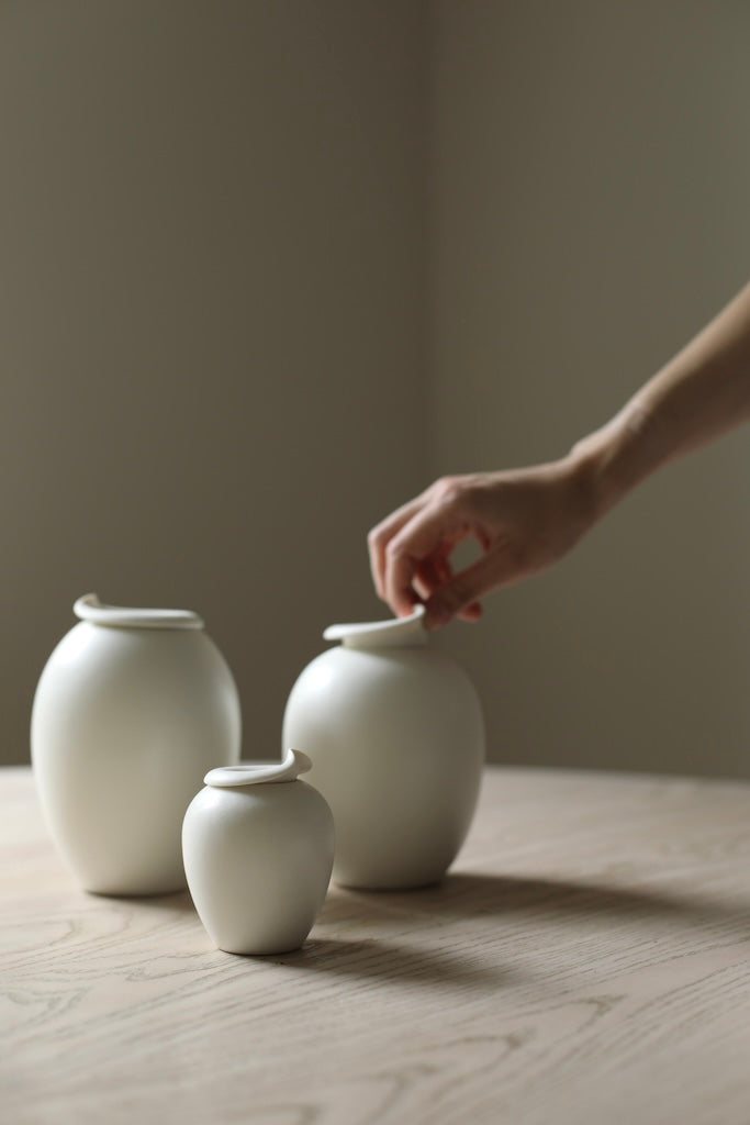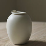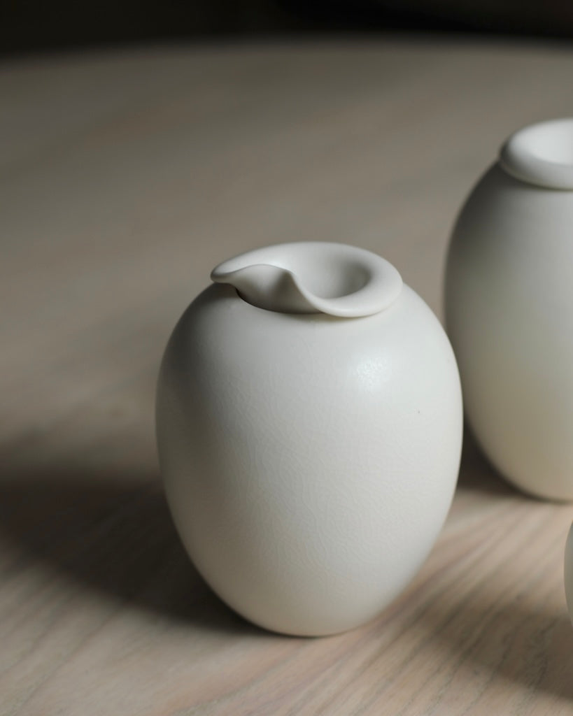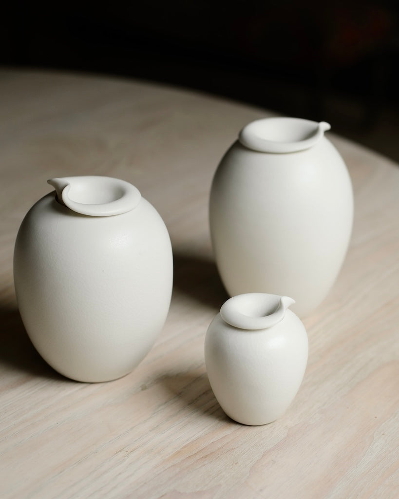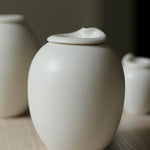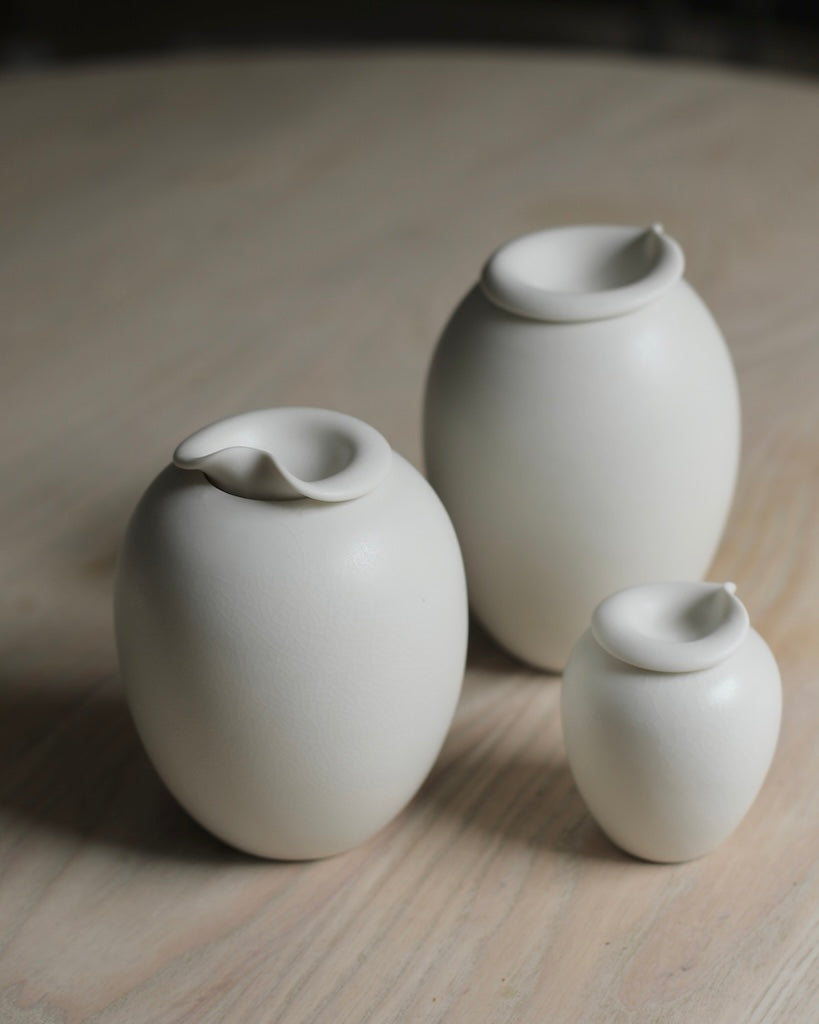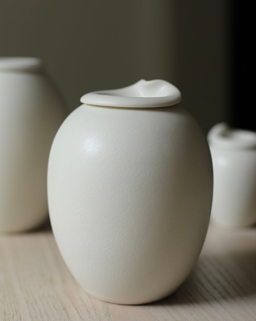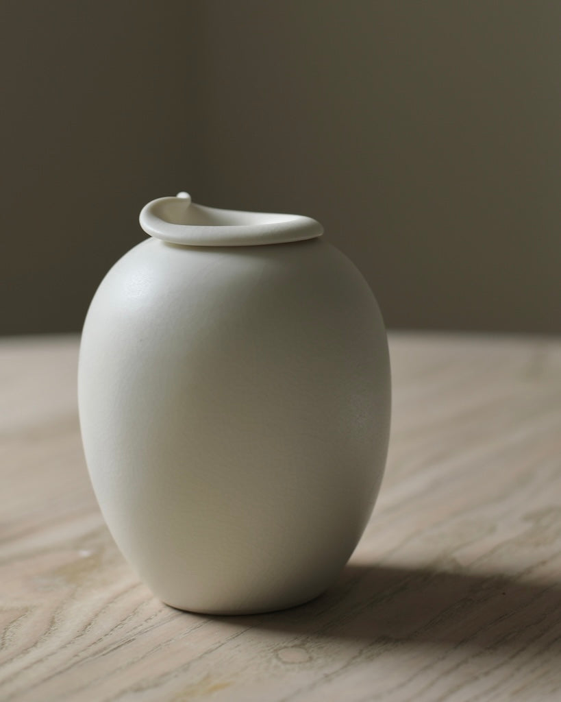 A softly contoured porcelain jar with a fluid, organic form. The subtly curved lid fits seamlessly into the vessel, creating a sense of quiet balance and tactility. Finished with a smooth, matte surface, the piece embodies Jo Davies’ refined approach to simplicity and form. Designed to be both functional and sculptural, it invites touch and integrates effortlessly into everyday life or display.