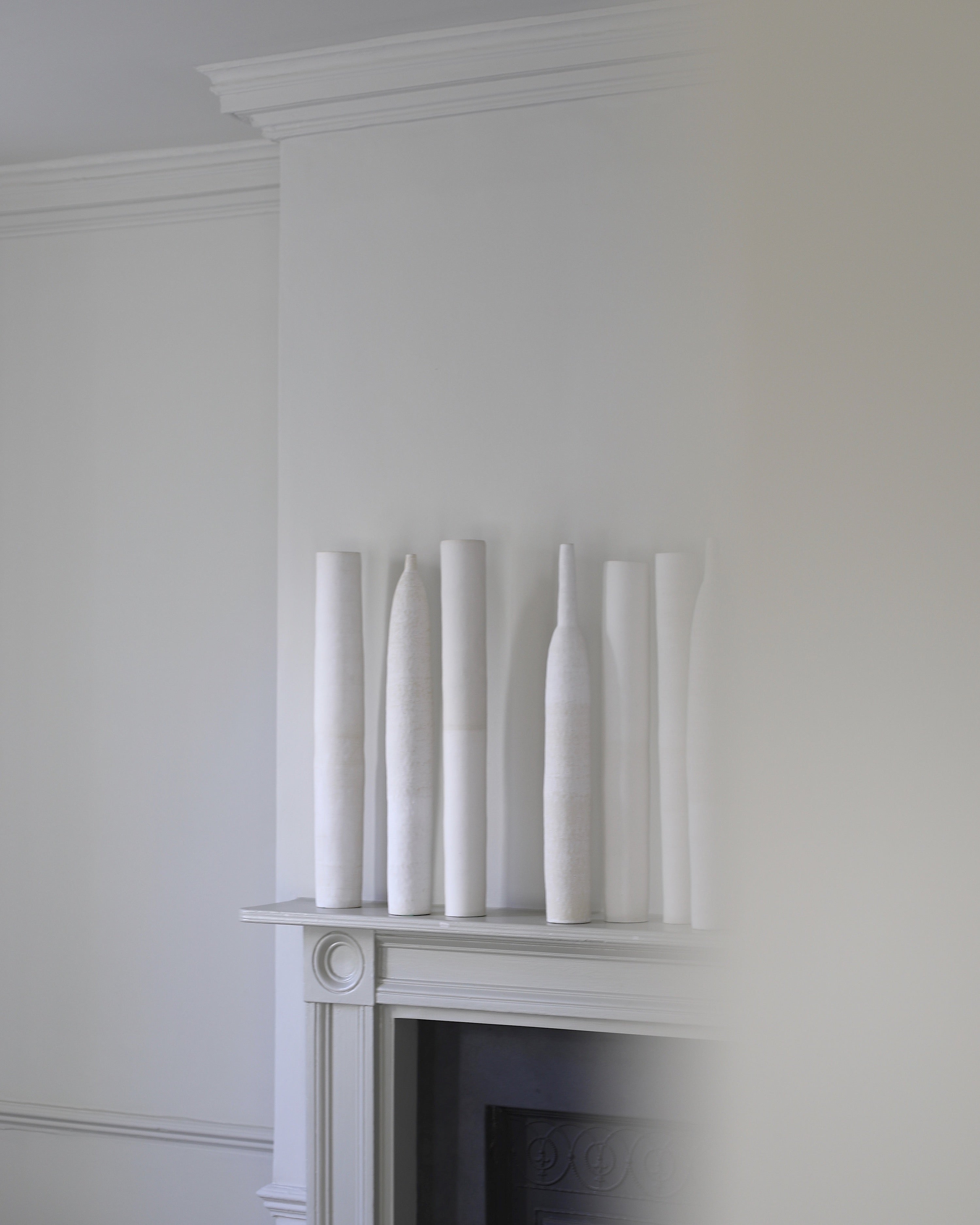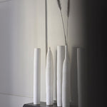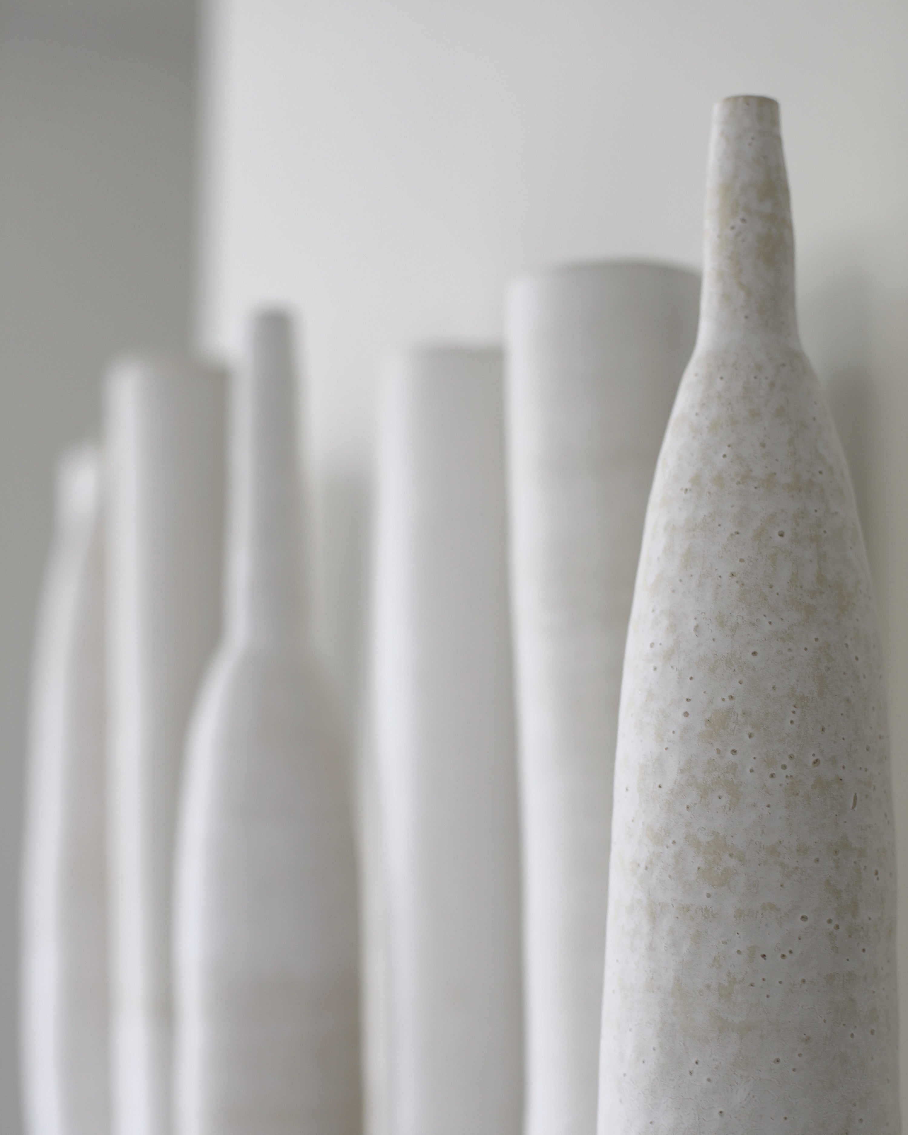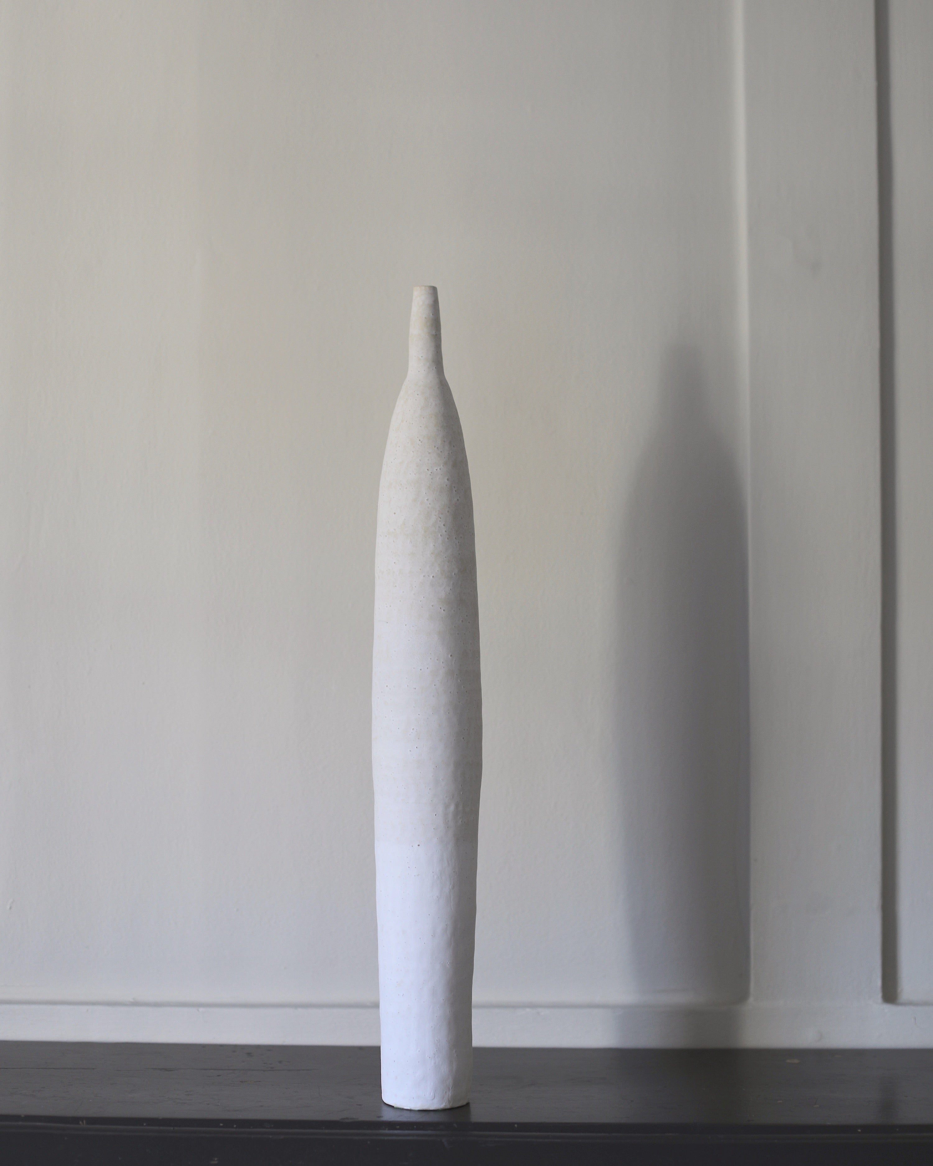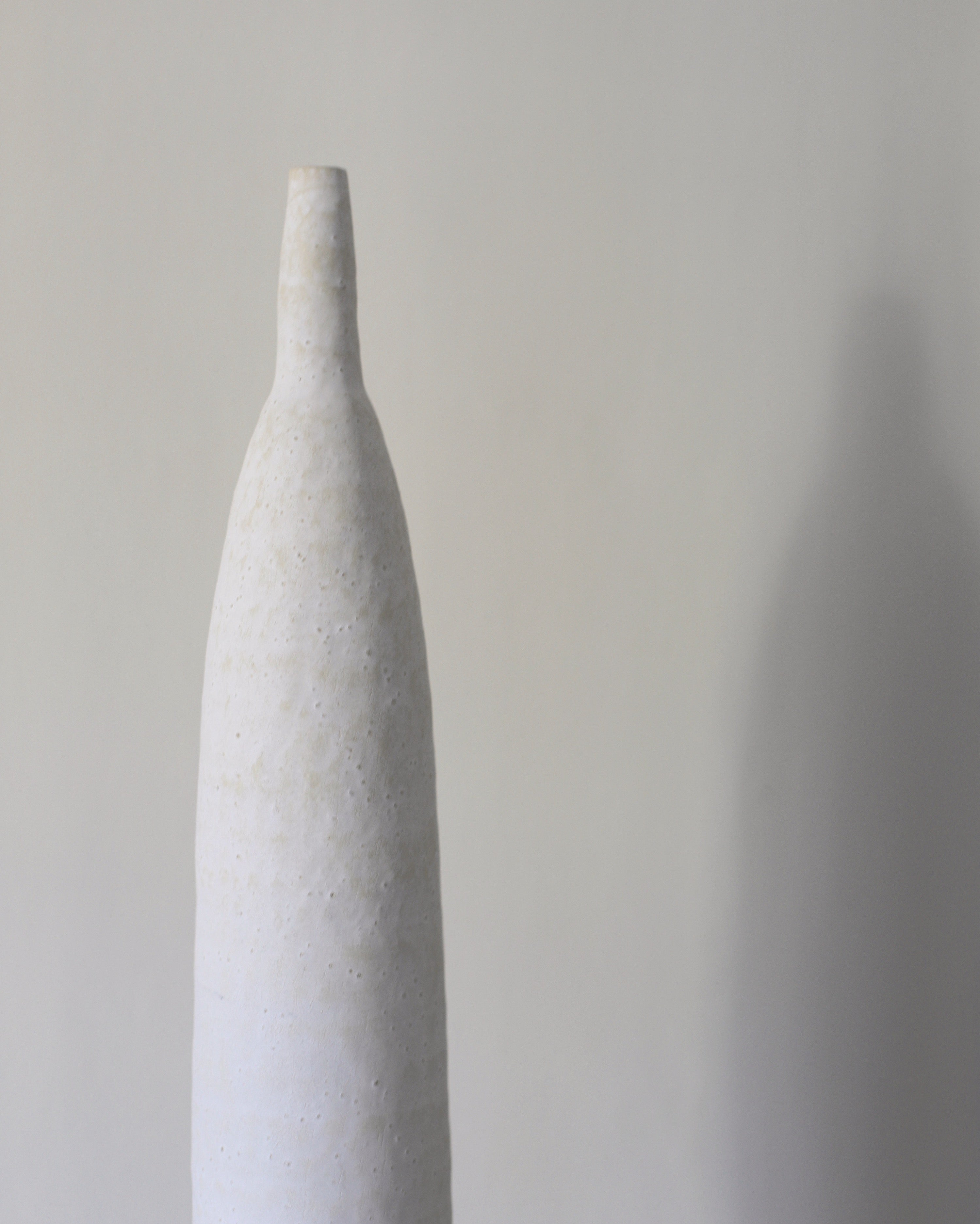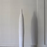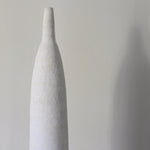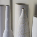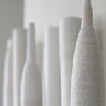 This exquisitely handcrafted vessel exhibits a subtle hue that masterfully sits alongside its balanced and well-proportioned design. The surface of the exterior is adorned with a textured, organic ornamentation that showcases the raw clay and building methods used in its creation. These vessels have a tall, slender form that evokes nature, with each one featuring unique inflexions and subtle differences in height, making them ideal for display on their own or as a group.
