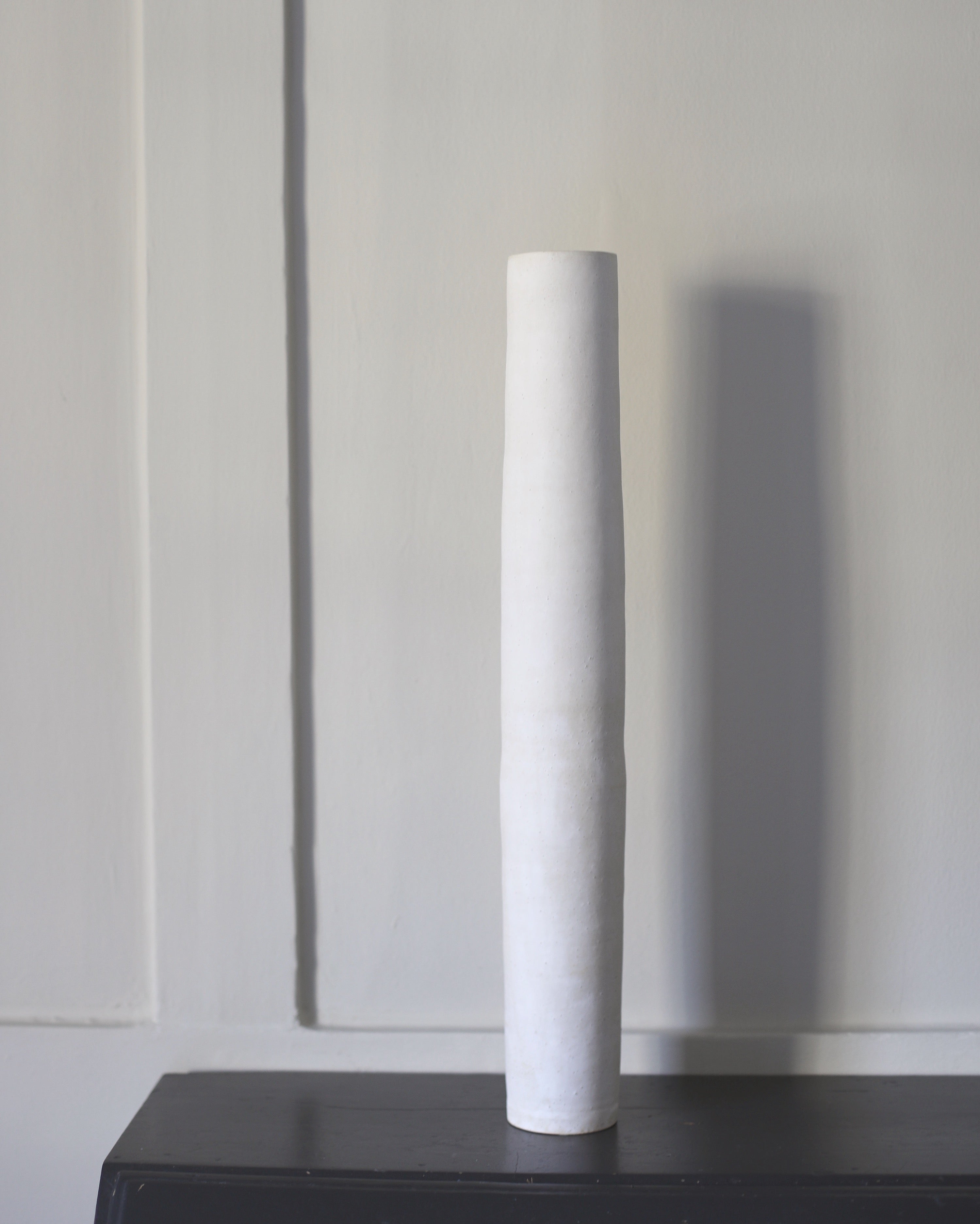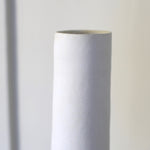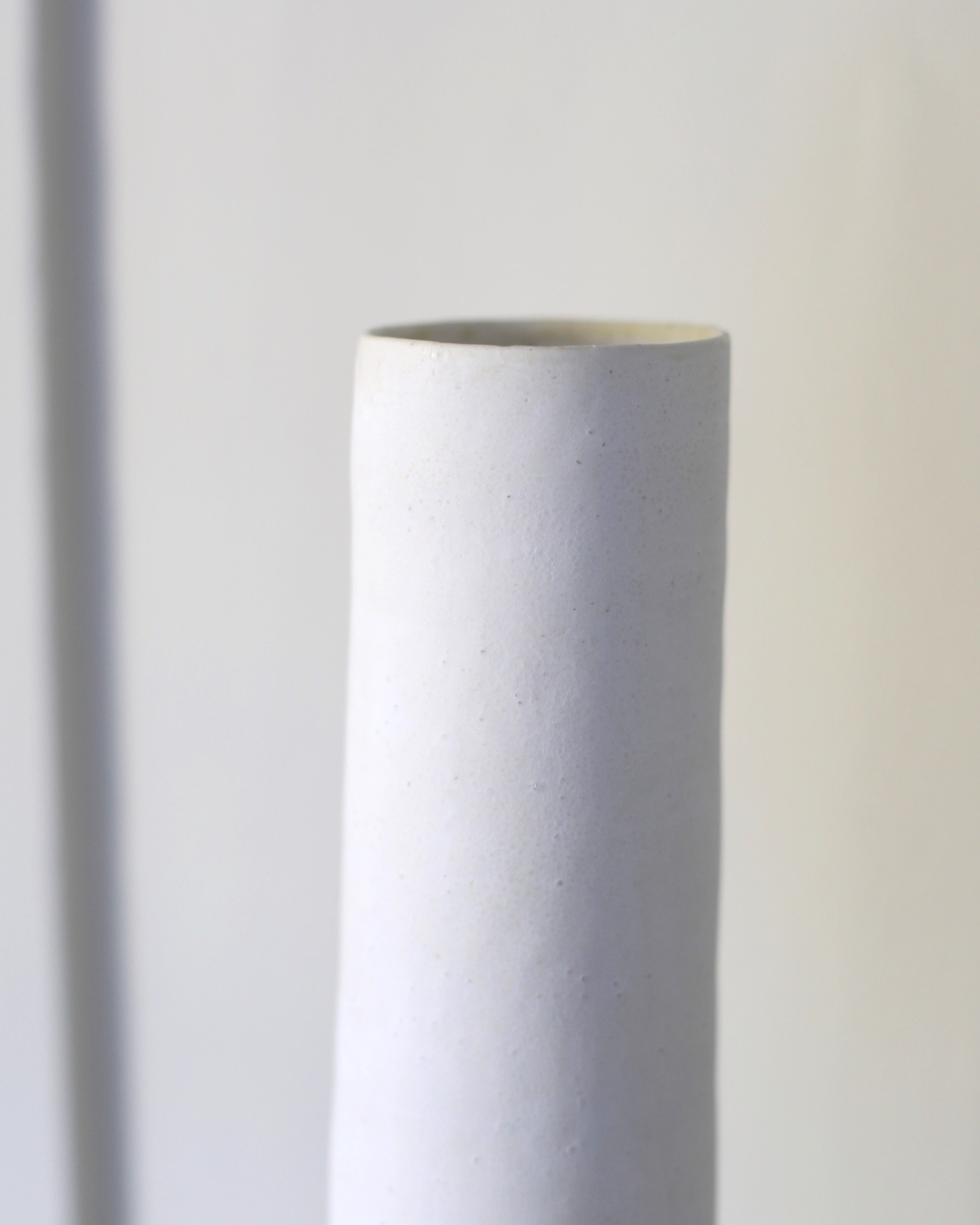 This exquisitely handcrafted vessel exhibits a subtle hue that masterfully sits alongside its balanced and well-proportioned design. The surface of the exterior is adorned with a textured, organic ornamentation that showcases the raw clay and building methods used in its creation. These vessels have a tall, slender form that evokes nature, with each one featuring unique inflexions and subtle differences in height, making them ideal for display on their own or as a group.