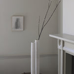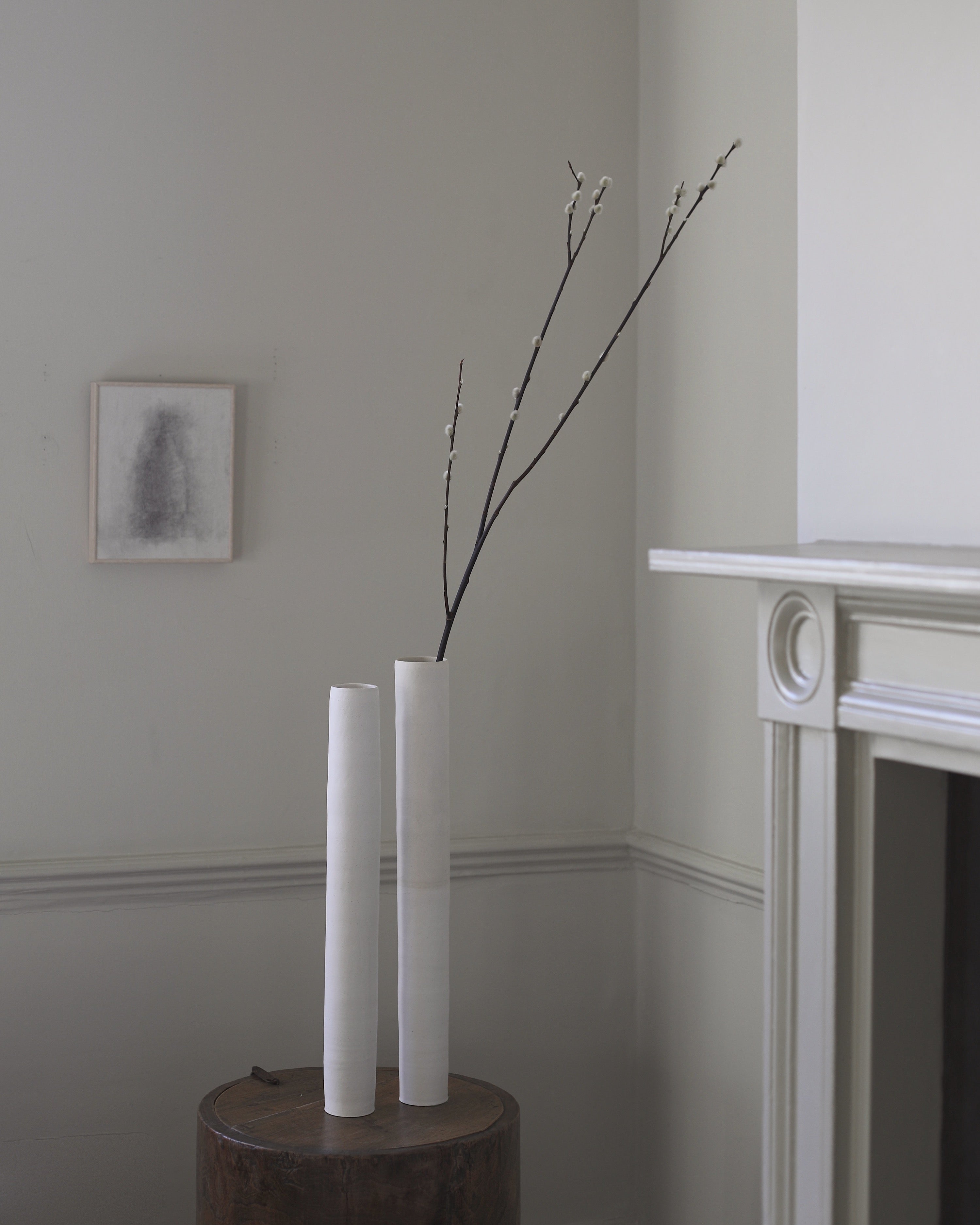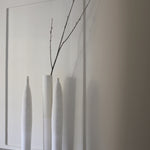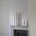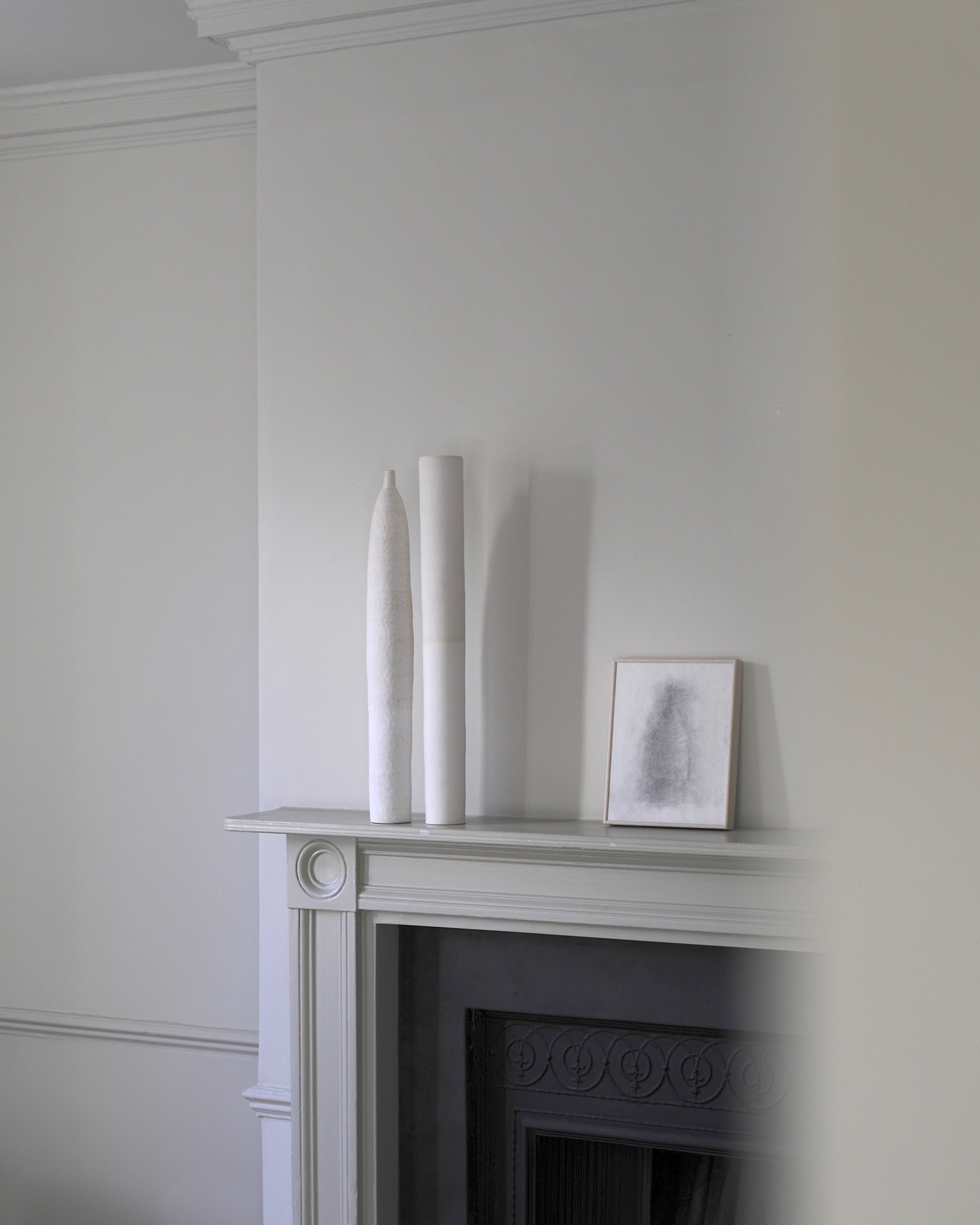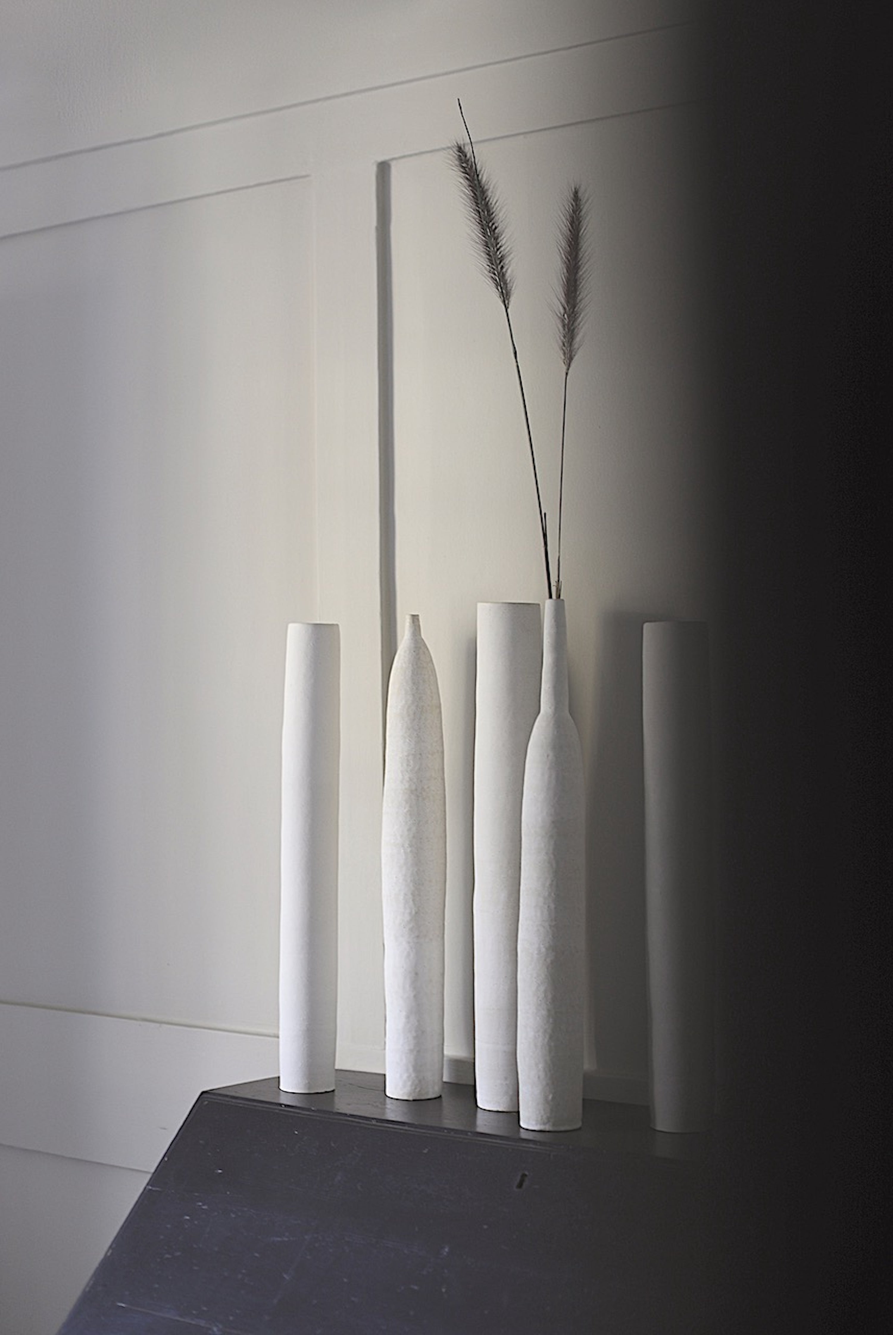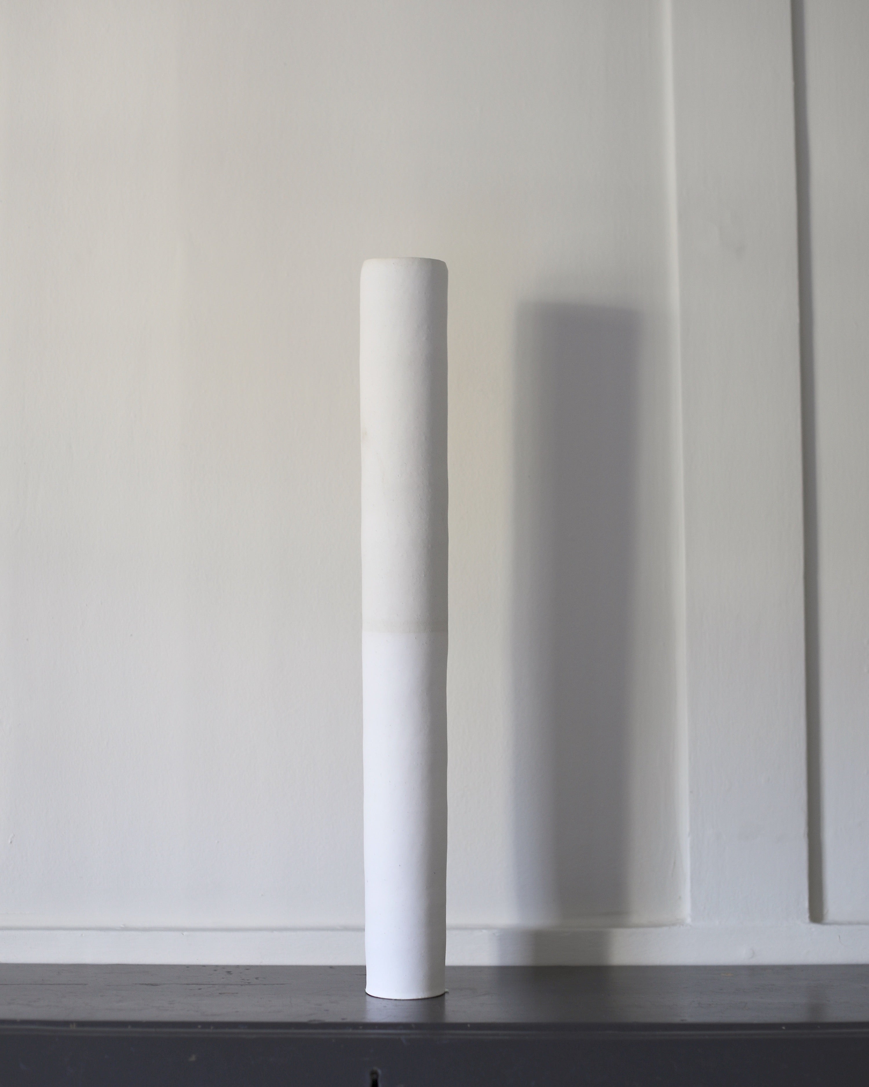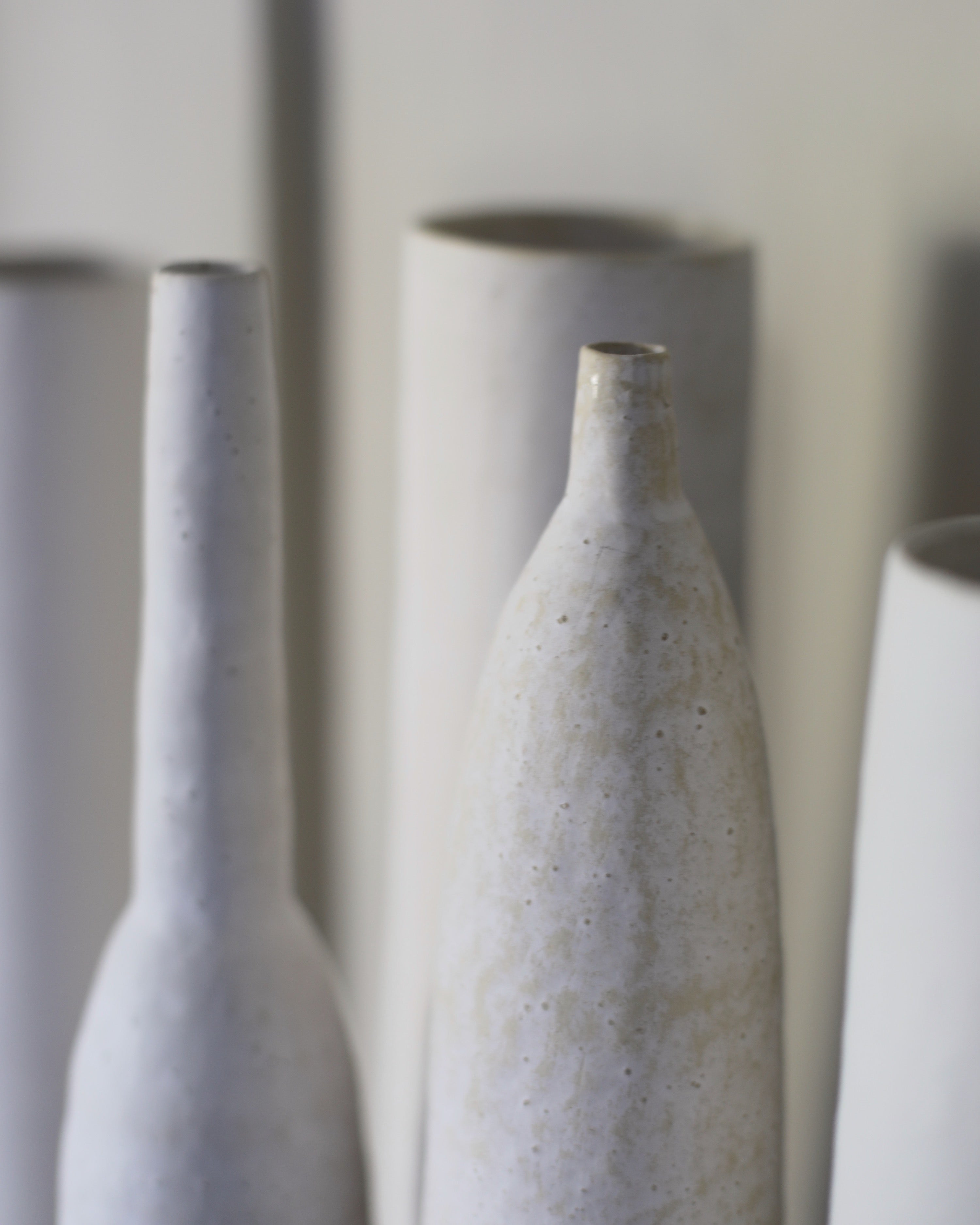 This exquisitely handcrafted vessel exhibits a subtle hue that masterfully sits alongside its balanced and well-proportioned design. The surface of the exterior is adorned with a textured, organic ornamentation that showcases the raw clay and building methods used in its creation. These vessels have a tall, slender form that evokes nature, with each one featuring unique inflexions and subtle differences in height, making them ideal for display on their own or as a group.