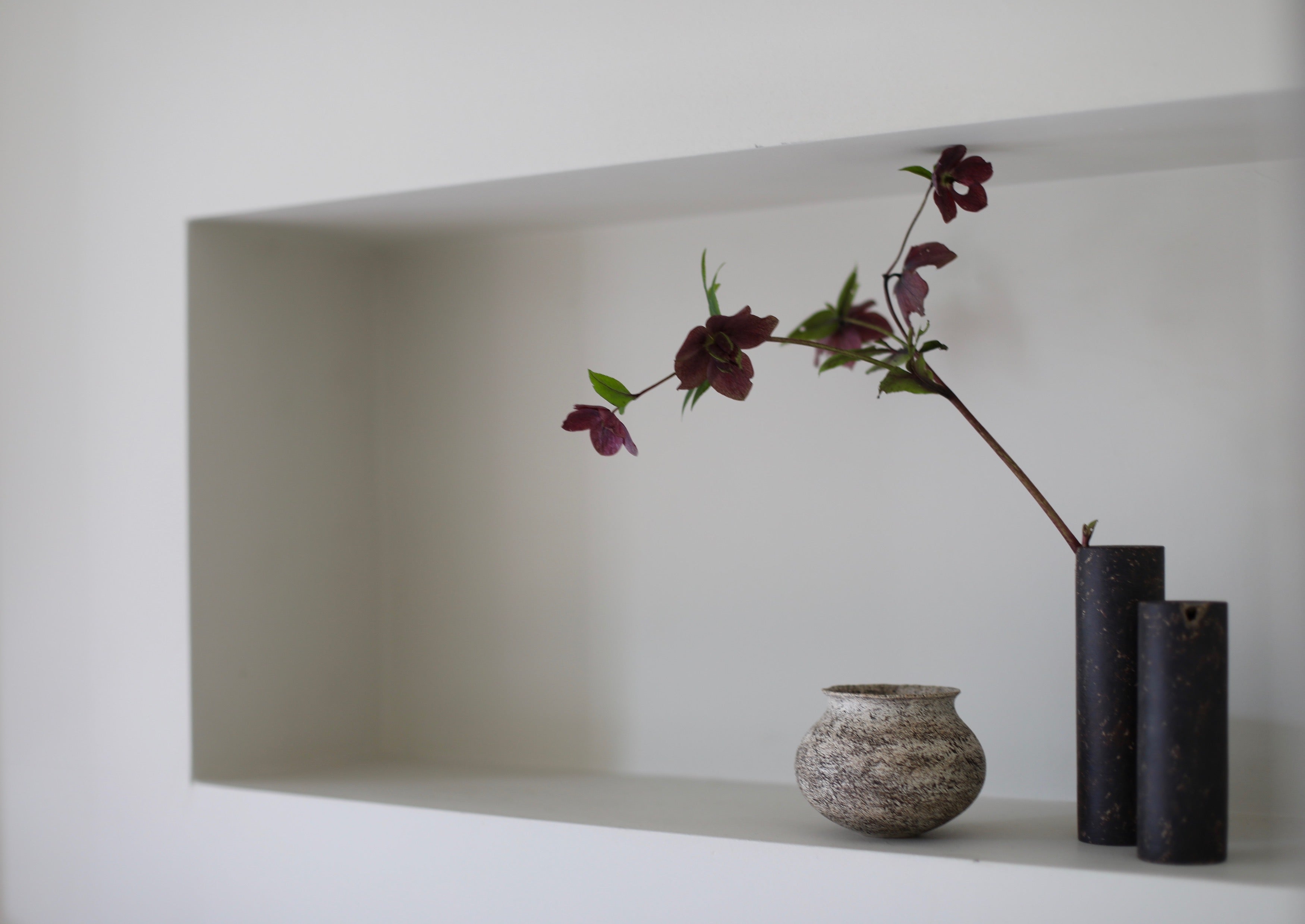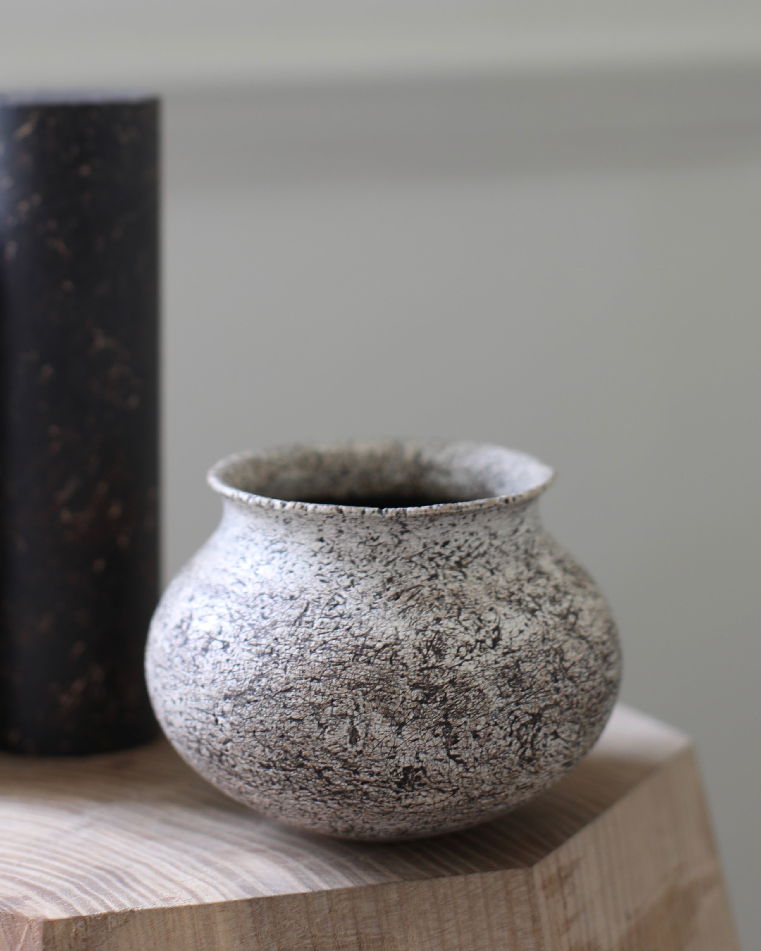 Contemporary ceramicist Kazunori Ohnaka crafted this restrained and distinctive vessel using Shigarki clay. Its finish consists of multiple layers of alternating earthy stone white hues with darker, dappled inclusions, artistically worked by hand and tool to attain a surface with history and depth. A glaze is then applied using a brush, sponge or by the hand of the artist. Ohnaka’s unique and masterful firing process allows him to achieve a sublime and aged surface. The materials chosen by the artist specifically influence the techniques and tools required to realise the work. Ohnaka believes it is a collaborative work between the creator and the user, that the forms are complete when explored and shared. Imbuing these methodologies into his practice has resulted in an original and dynamic body of work. This vessel has a beautifully meditated, stone-like, refined classical body. Its minimalistic burnished surface and deep natural hues give this vase presence.