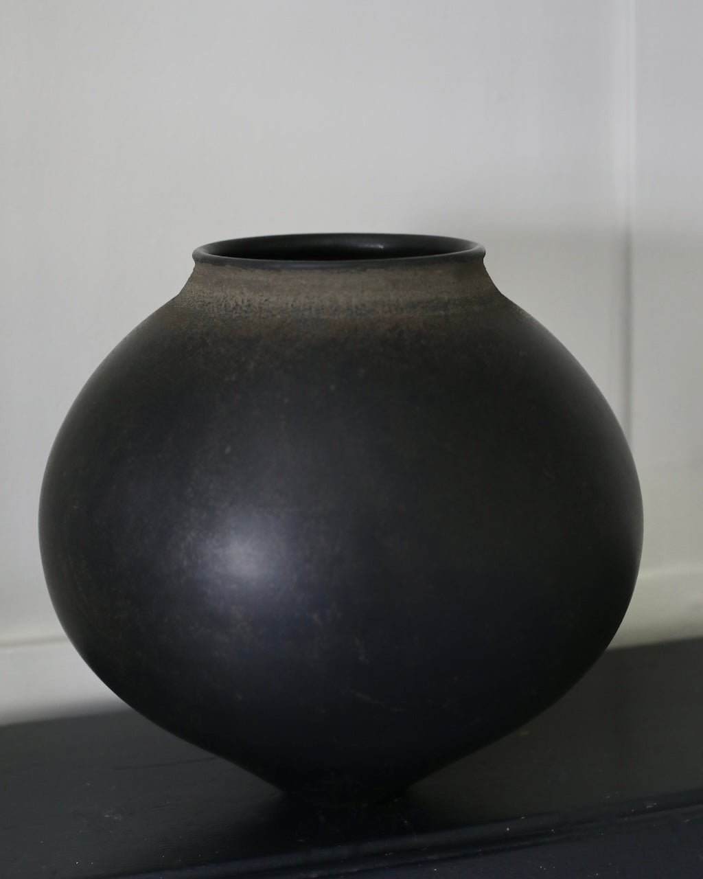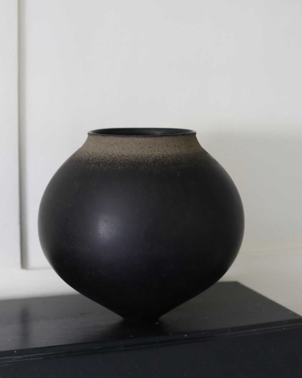 Indicative of the Wabi Sabi aesthetic, this Moon Jar was crafted during a contemplative process, during which Anzai employs a slow craftmaking rhythm. His deliberate approach is dictated by the process of making – firstly carefully layering porcelain, then continuously sandpapering, polishing, and, finally, refining. The soft shape of the vessel embodies the tranquillity that emits from Anzai’s works, while the deep earthy tones embody strength. The subtle dialogue between the delicate shapes and rich tones evokes a serene energy, that invites the viewer for a meditative glance, that focuses on intricate details. By infusing glaze with urushi, a traditional Japanese lacquer derived from the sap of a lacquer tree, Anzai used his perfected skills in ceramics to create an exceptional piece, that is the epitome of perfect balance.