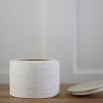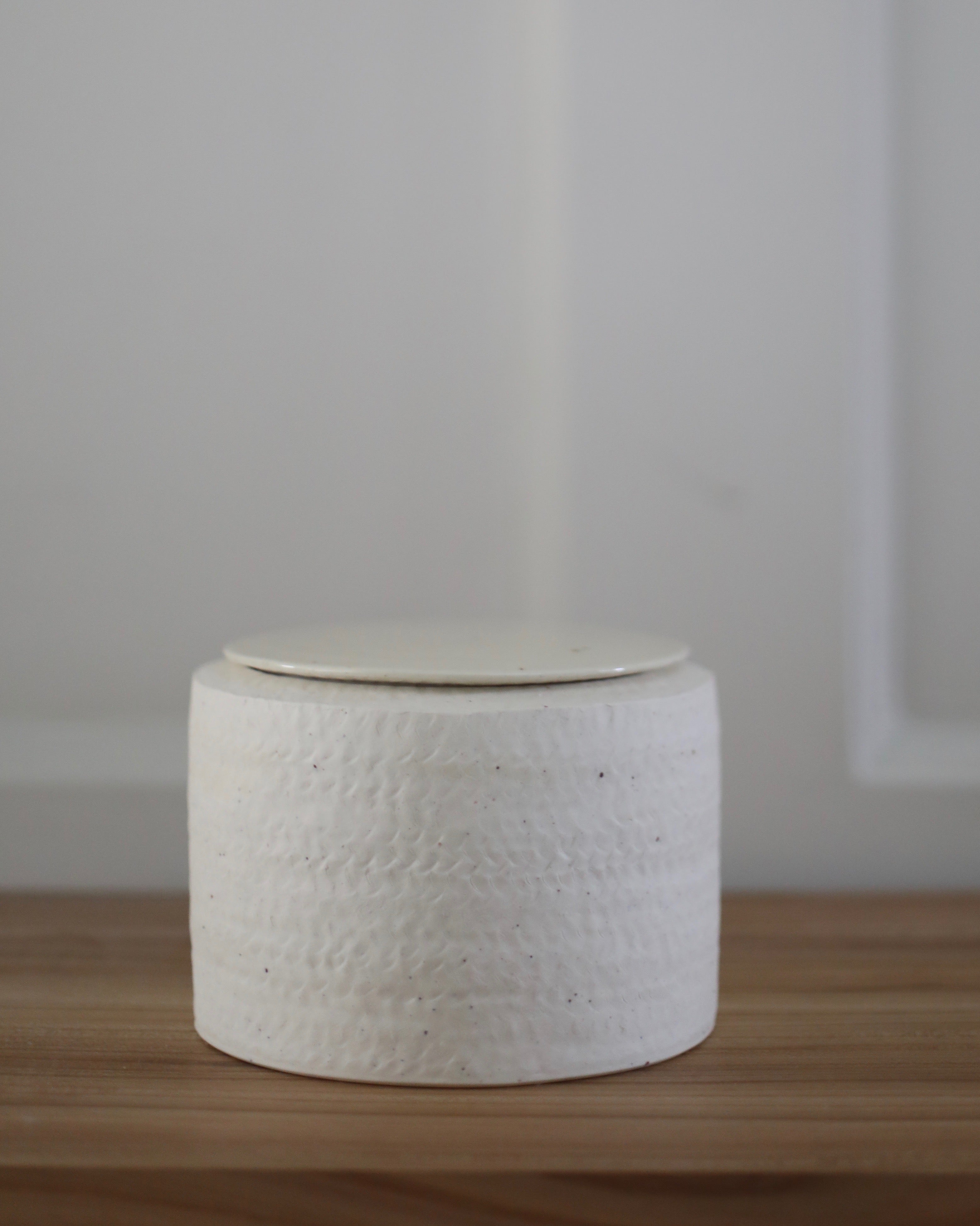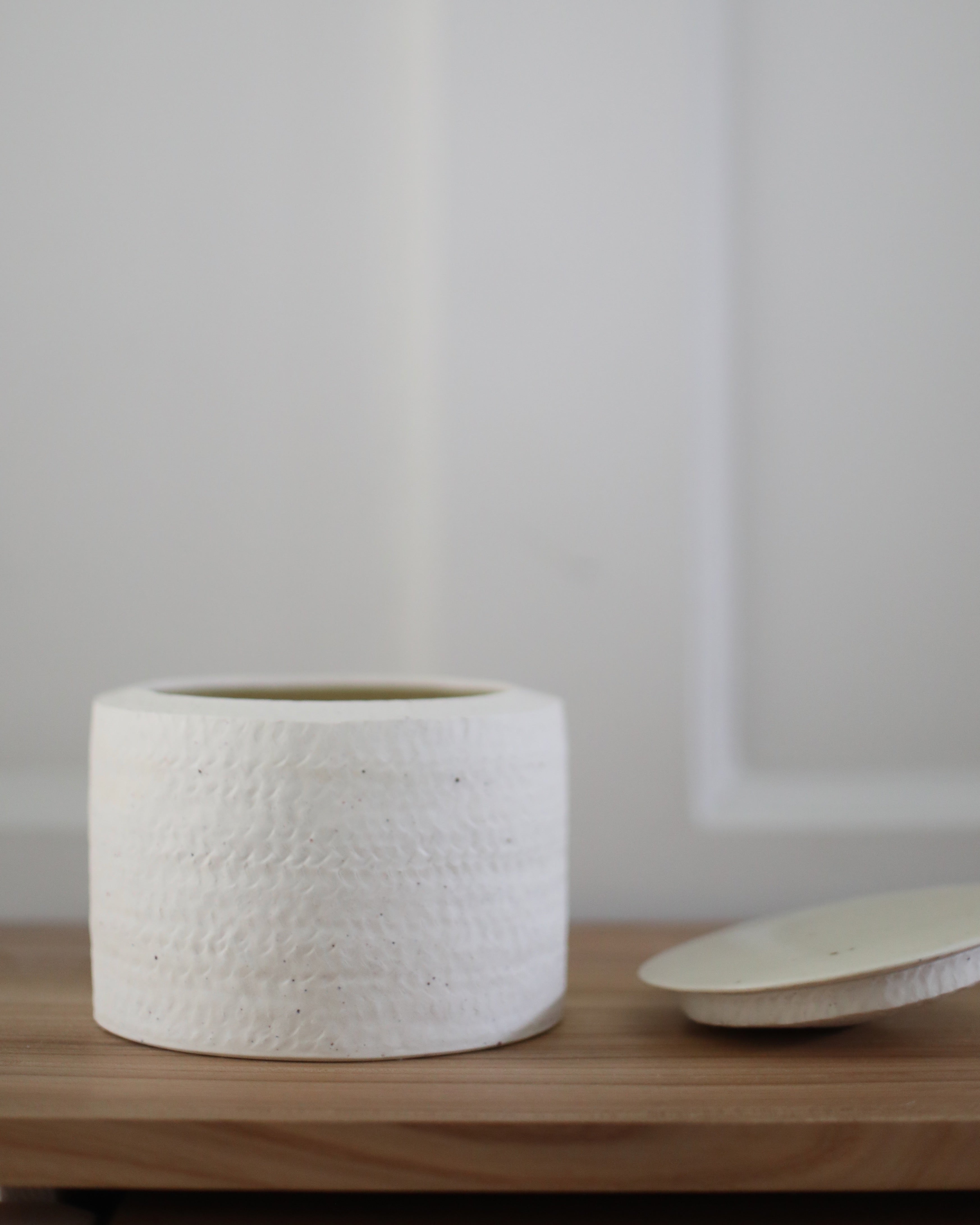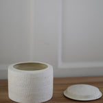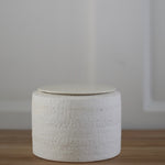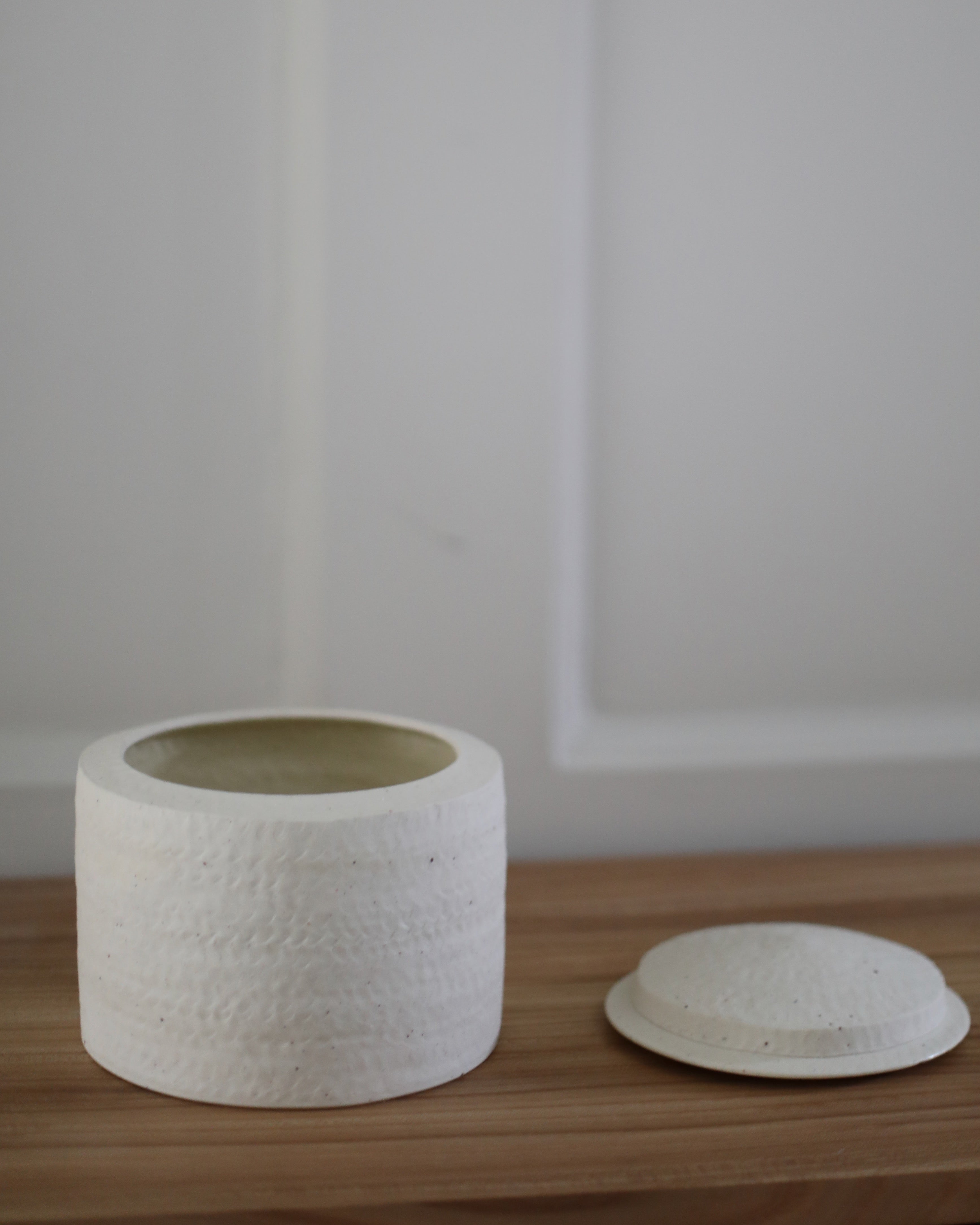 Crafted from a mixture of clays collected in Germany’s volcanic valley, this eloquent container in muted, neutral, soft white is both playful and pure, possessing an earthy texture and geometric form emphasized by the unglazed matte exterior and transparent glazed interior and lid.