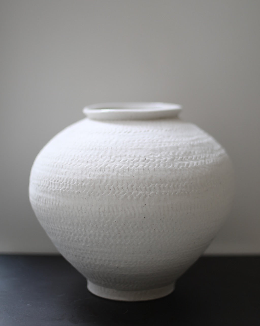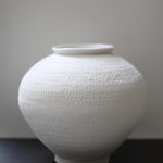 This broad, sculptural moon jar is composed of clays collected in Germany's volcanic valley. Its soft white elegant form is pure, its haptic surface emphasized by an unglazed matte exterior and transparent glazed interior.