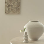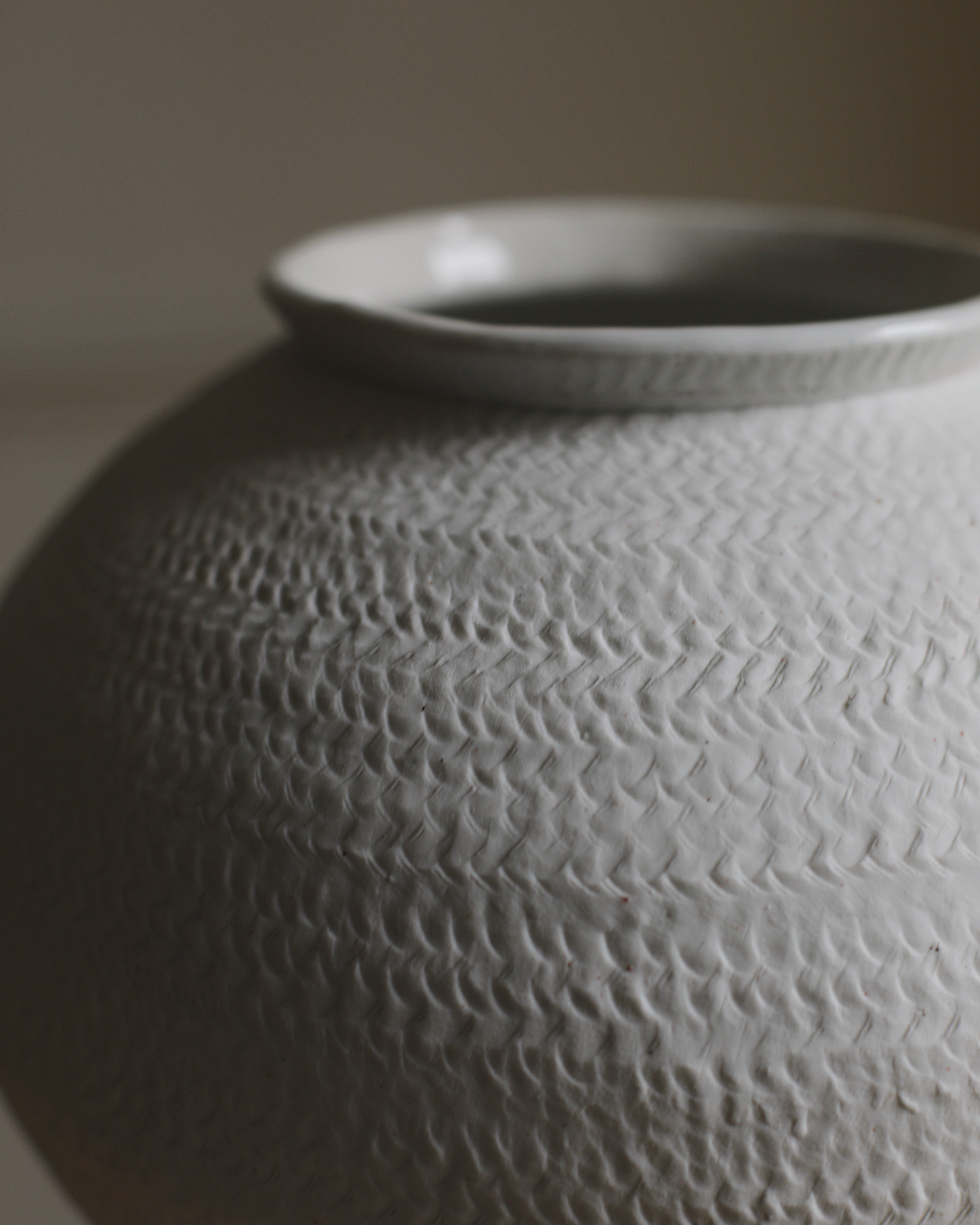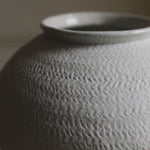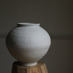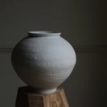 This broad, sculptural moon jar is composed of clays collected in Germany's volcanic valley. Its soft white elegant form is pure, its haptic surface emphasized by an unglazed matte exterior and transparent glazed interior.