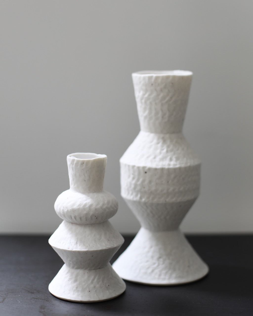 Crafted from a mixture of clays collected in Germany’s volcanic valley, these sculptural vases in white are both playful and pure, possessing an earthy texture and geometric form emphasized by the unglazed matte exteriors and transparent glazed interiors.