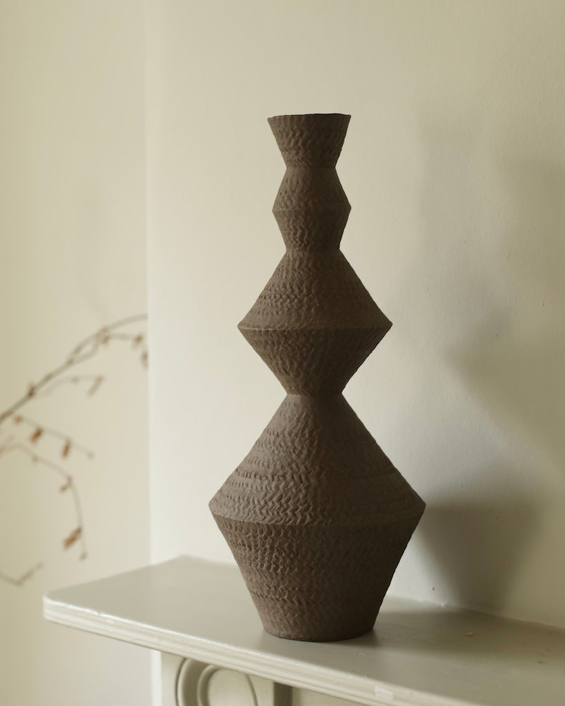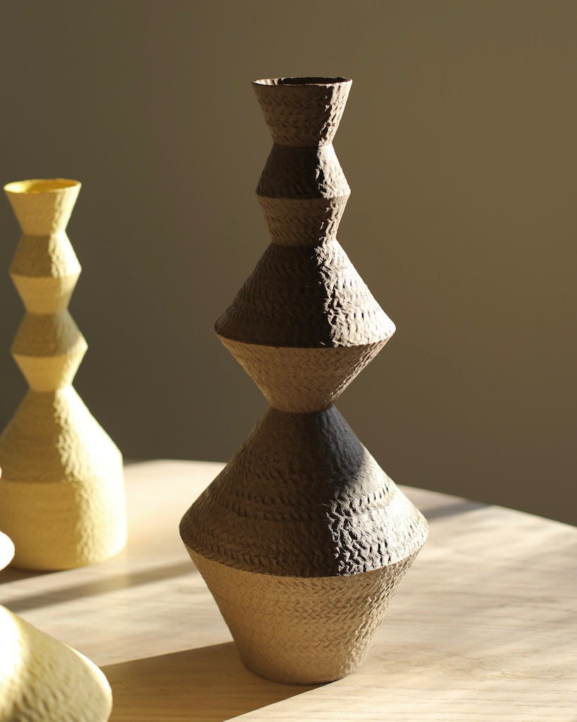 Kiho constructs strictly geometric vessels and tableware by coiling and pinching, slowly building up each piece. Kiho’s ceramics are inspired by memory, architecture and everyday objects. They are both fully functional and aesthetic, created with the user in mind and with the aim of purity. Kiho refrains from adding unnecessary adornments to his pieces to allow the user to experience the texture of the clay, which varies widely due to his practice of mixing clays collected in Germany’s volcanic valleys. This is enhanced by the unglazed matte exteriors combined with transparent glazed interiors, which emphasizes the pure and structural elements of the work.