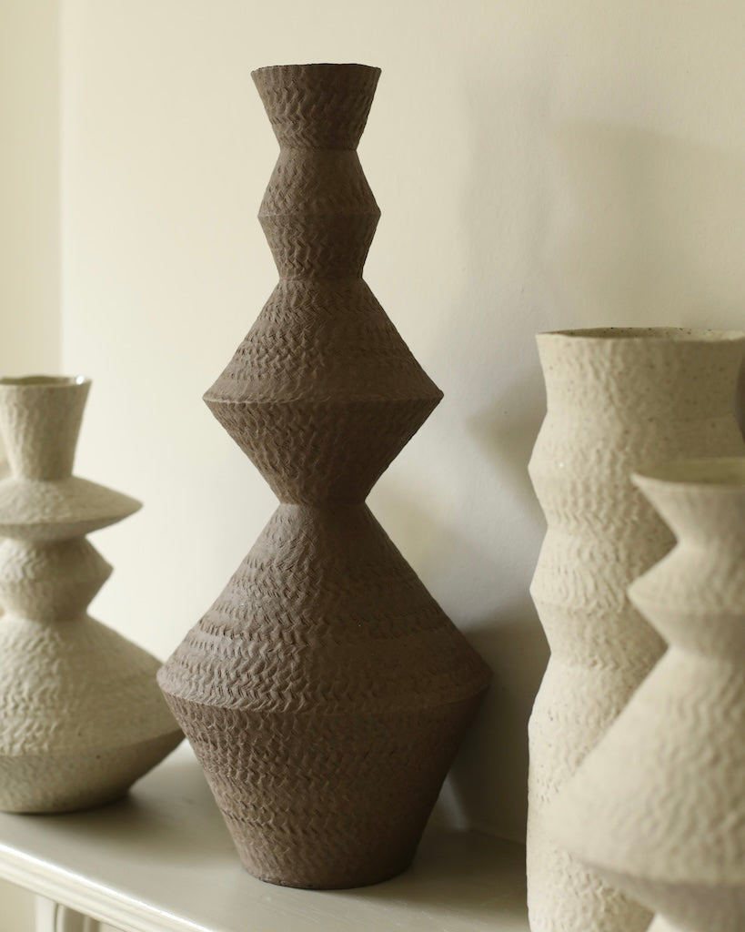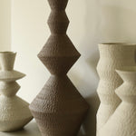 Crafted from a mixture of clays collected in Germany’s volcanic valley, this sculptural vase in muted, neutral, soft white is both playful and pure, possessing an earthy texture and geometric form emphasized by the unglazed matte exterior and transparent glazed interior.