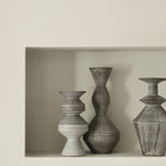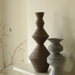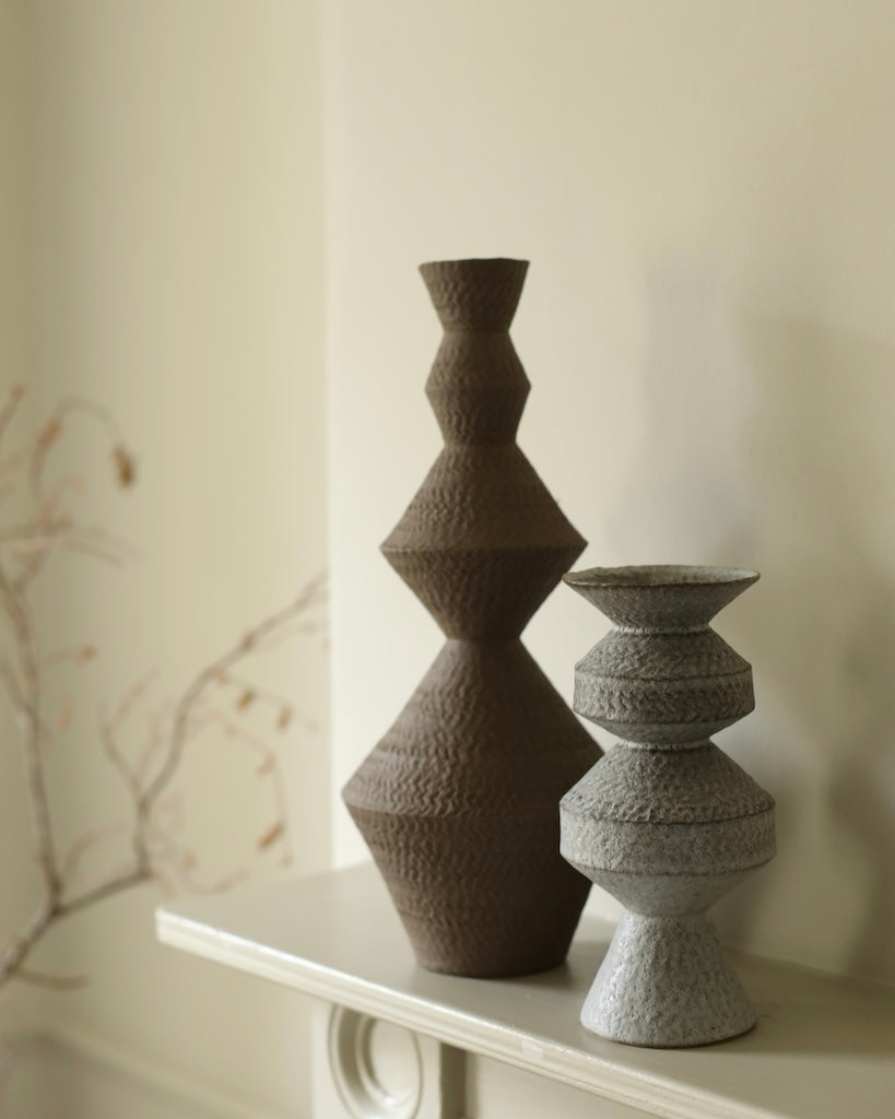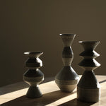Crafted from a mixture of clays collected in Germany’s volcanic valley, this sculptural vase in muted, neutral, soft white is both playful and pure, possessing an earthy texture and geometric form emphasized by the unglazed matte exterior and transparent glazed interior.