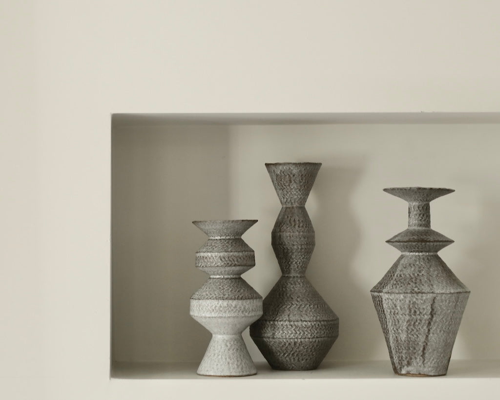 Kiho constructs strictly geometric vessels and tableware by coiling and pinching, slowly building up each piece. Kiho’s ceramics are inspired by memory, architecture and everyday objects. They are both fully functional and aesthetic, created with the user in mind and with the aim of purity. Kiho refrains from adding unnecessary adornments to his pieces to allow the user to experience the texture of the clay, which varies widely due to his practice of mixing clays collected in Germany’s volcanic valleys. This is enhanced by the unglazed matte exteriors combined with transparent glazed interiors, which emphasizes the pure and structural elements of the work.