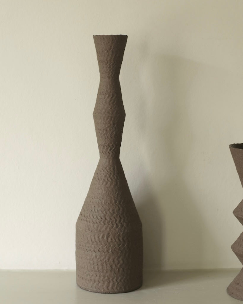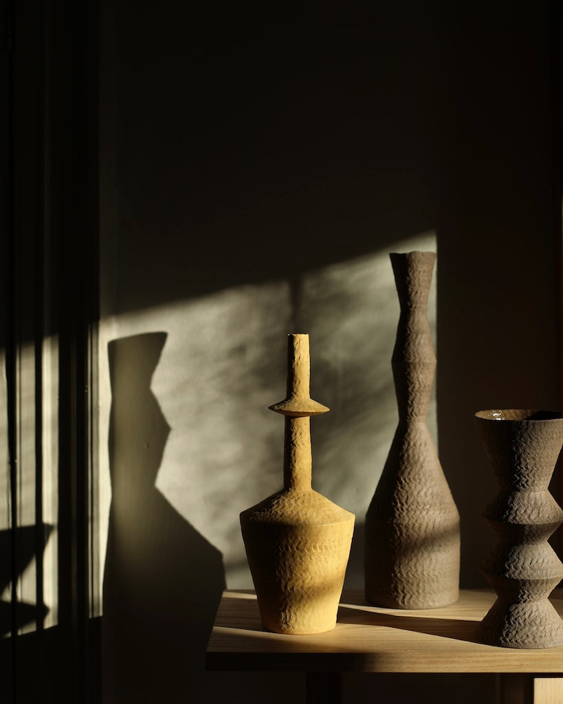 Kiho constructs strictly geometric vessels and tableware by coiling and pinching, slowly building up each piece. Kiho’s ceramics are inspired by memory, architecture and everyday objects. They are both fully functional and aesthetic, created with the user in mind and with the aim of purity. Kiho refrains from adding unnecessary adornments to his pieces to allow the user to experience the texture of the clay, which varies widely due to his practice of mixing clays collected in Germany’s volcanic valleys. This is enhanced by the unglazed matte exteriors combined with transparent glazed interiors, which emphasizes the pure and structural elements of the work.