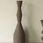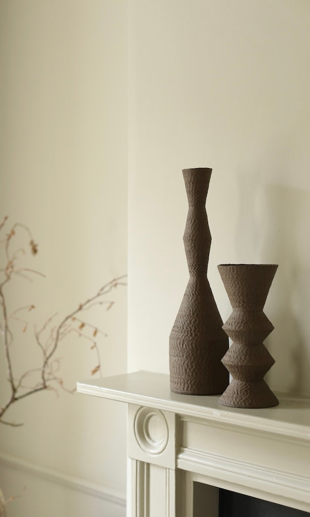 Crafted from a mixture of clays collected in Germany’s volcanic valley, this sculptural vase in muted, neutral, soft white is both playful and pure, possessing an earthy texture and geometric form emphasized by the unglazed matte exterior and transparent glazed interior.