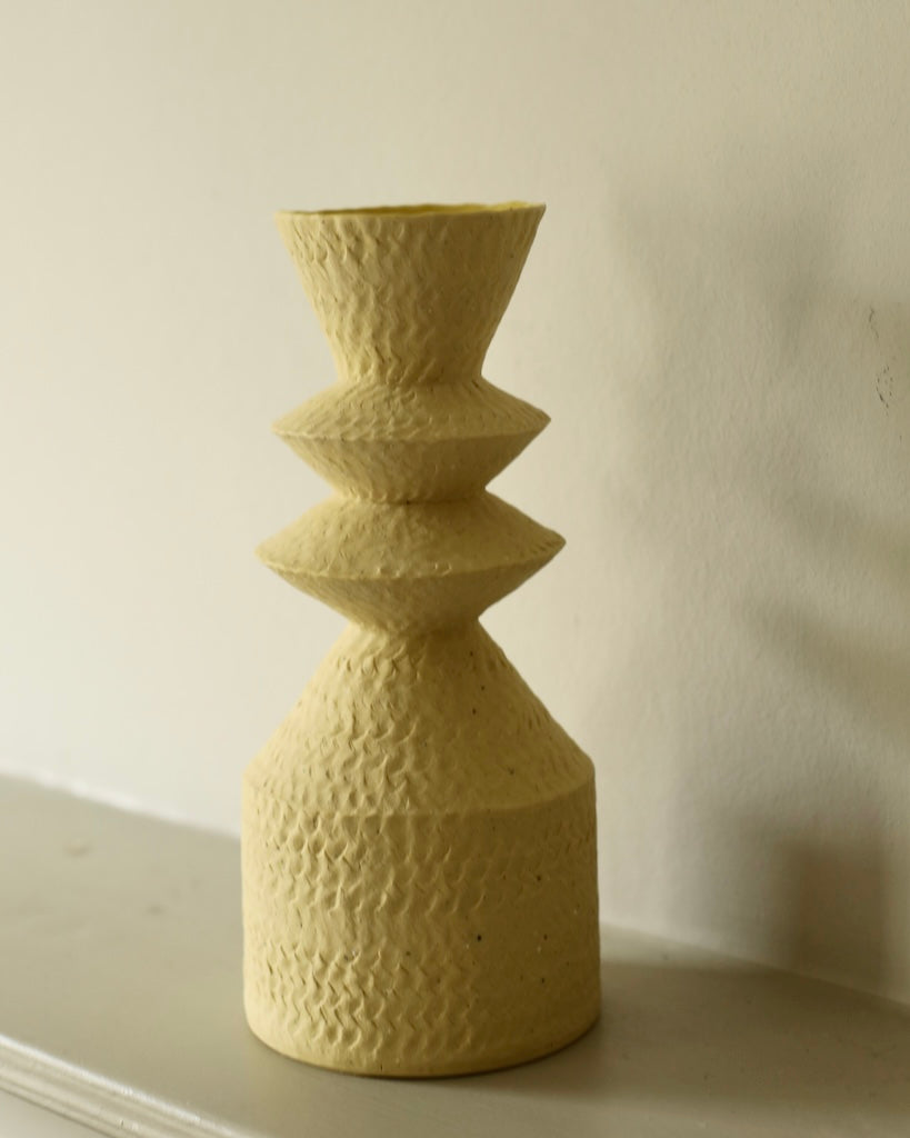 Crafted from a mixture of clays collected in Germany’s volcanic valley, this sculptural vase in muted, neutral, soft white is both playful and pure, possessing an earthy texture and geometric form emphasized by the unglazed matte exterior and transparent glazed interior.