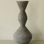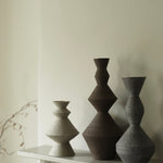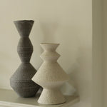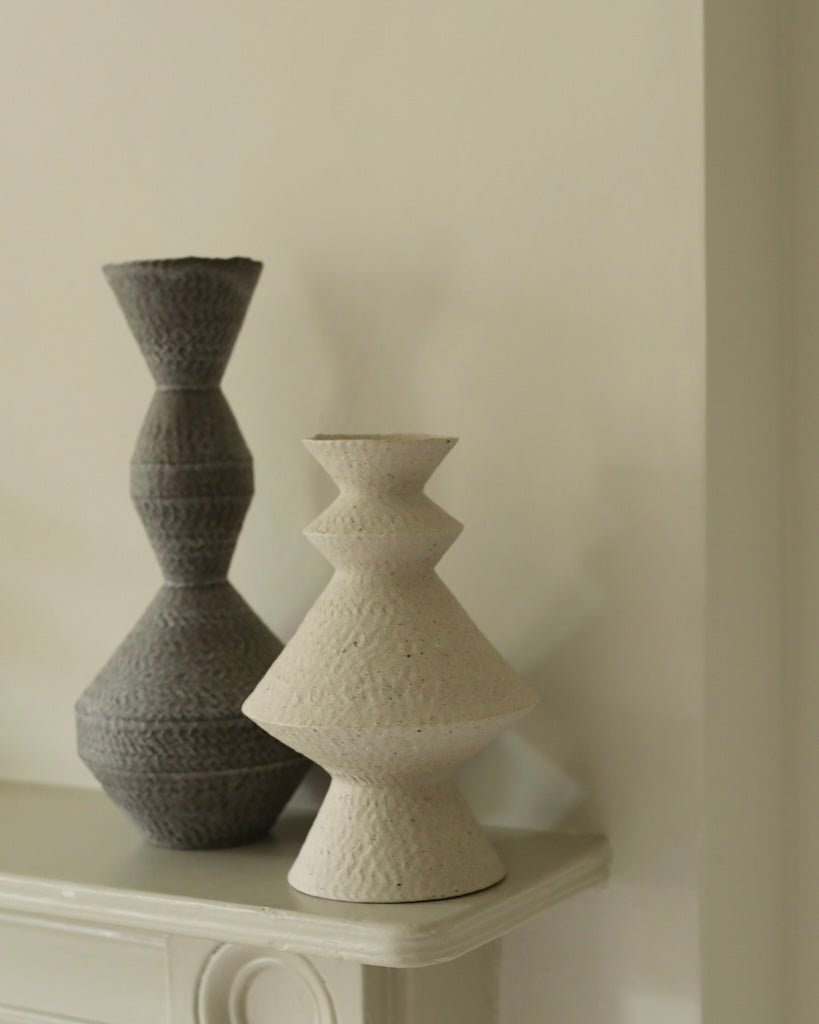 Crafted from a mixture of clays collected in Germany’s volcanic valley, this sculptural vase in muted, neutral, soft white is both playful and pure, possessing an earthy texture and geometric form emphasized by the unglazed matte exterior and transparent glazed interior.