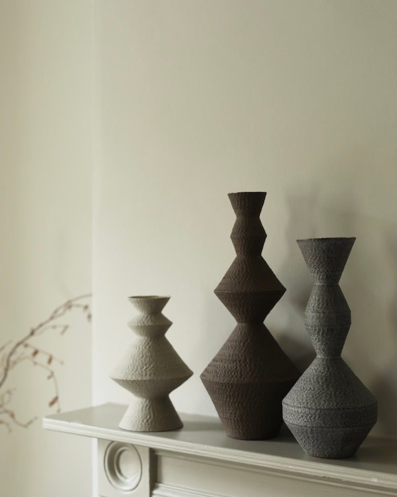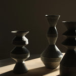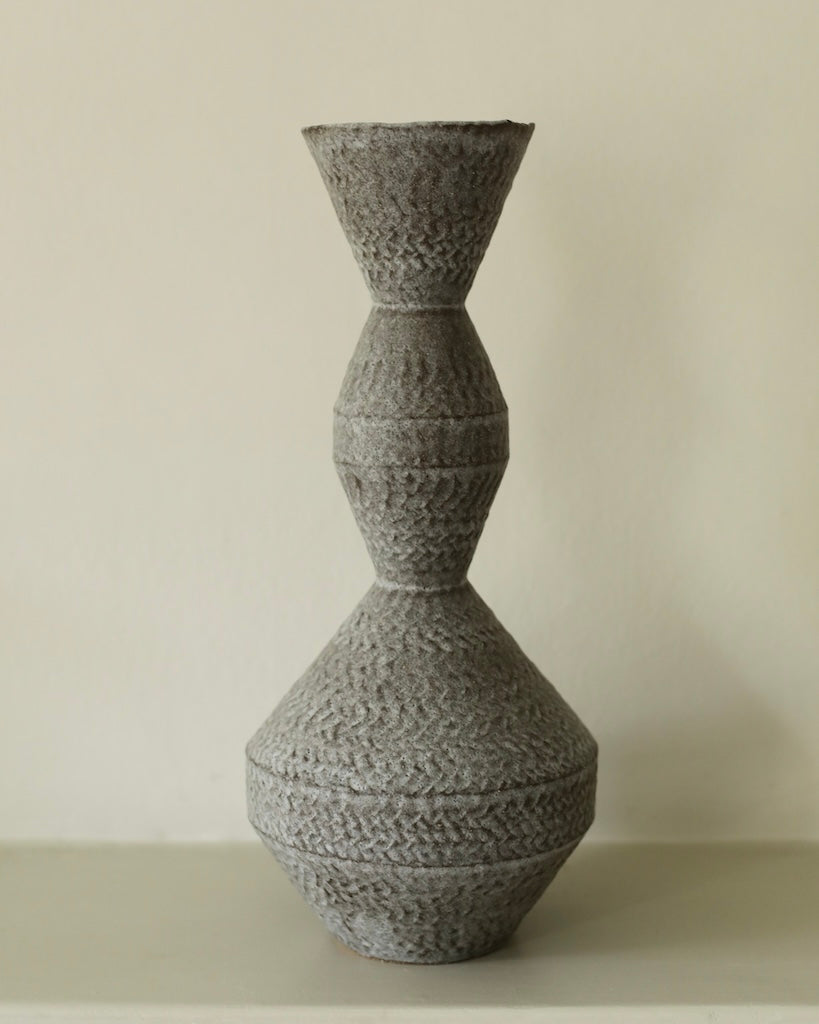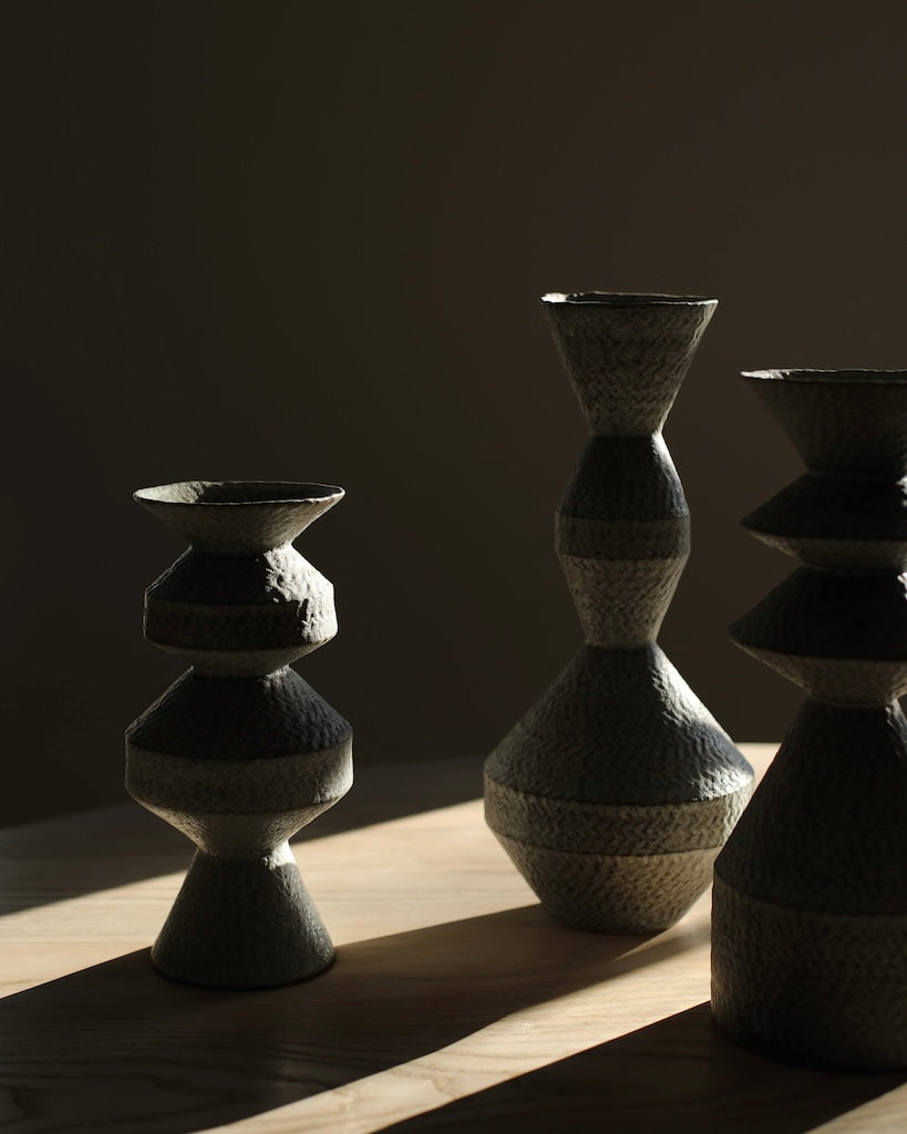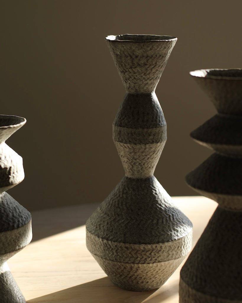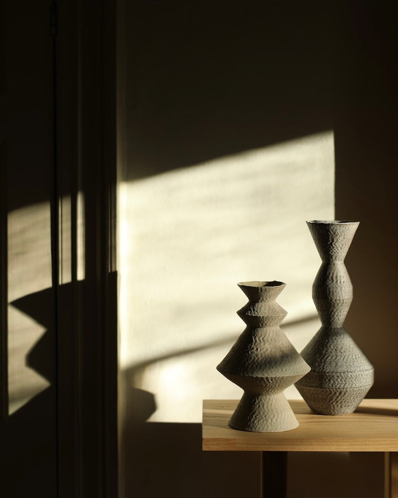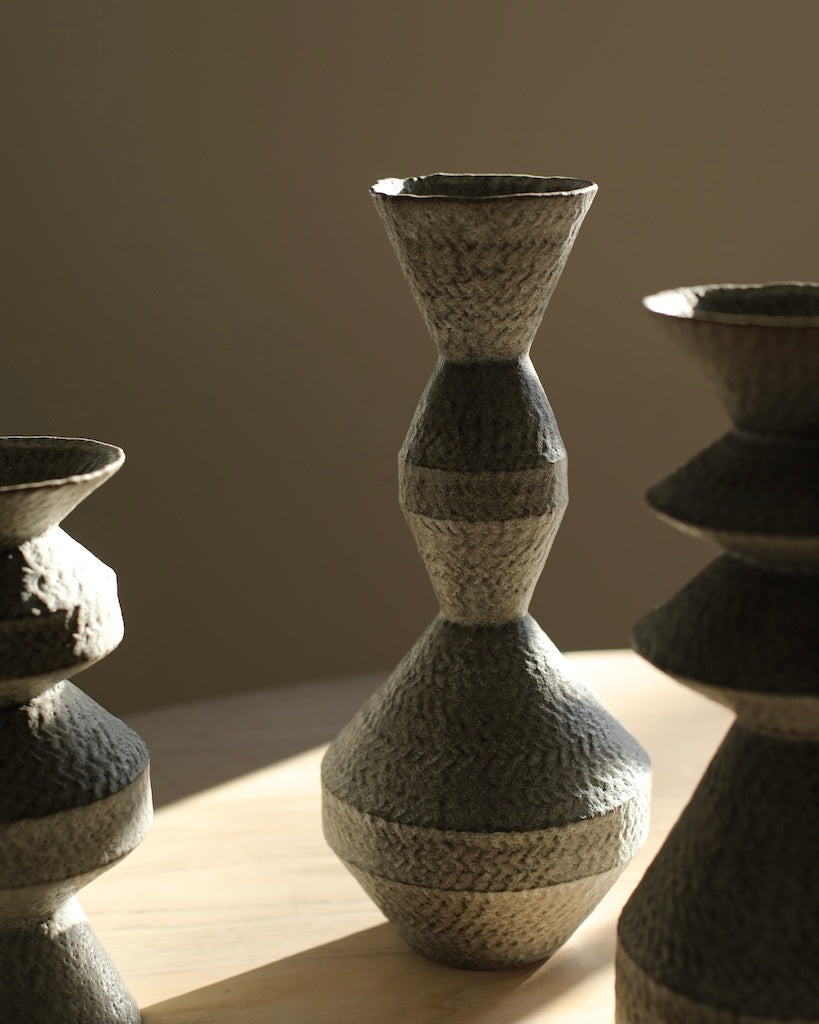 Kiho constructs strictly geometric vessels and tableware by coiling and pinching, slowly building up each piece. Kiho’s ceramics are inspired by memory, architecture and everyday objects. They are both fully functional and aesthetic, created with the user in mind and with the aim of purity. Kiho refrains from adding unnecessary adornments to his pieces to allow the user to experience the texture of the clay, which varies widely due to his practice of mixing clays collected in Germany’s volcanic valleys. This is enhanced by the unglazed matte exteriors combined with transparent glazed interiors, which emphasizes the pure and structural elements of the work.