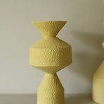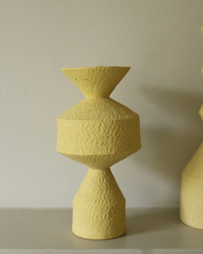 Kiho constructs strictly geometric vessels and tableware by coiling and pinching, slowly building up each piece. Kiho’s ceramics are inspired by memory, architecture and everyday objects. They are both fully functional and aesthetic, created with the user in mind and with the aim of purity. Kiho refrains from adding unnecessary adornments to his pieces to allow the user to experience the texture of the clay, which varies widely due to his practice of mixing clays collected in Germany’s volcanic valleys. This is enhanced by the unglazed matte exteriors combined with transparent glazed interiors, which emphasizes the pure and structural elements of the work.