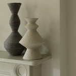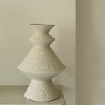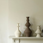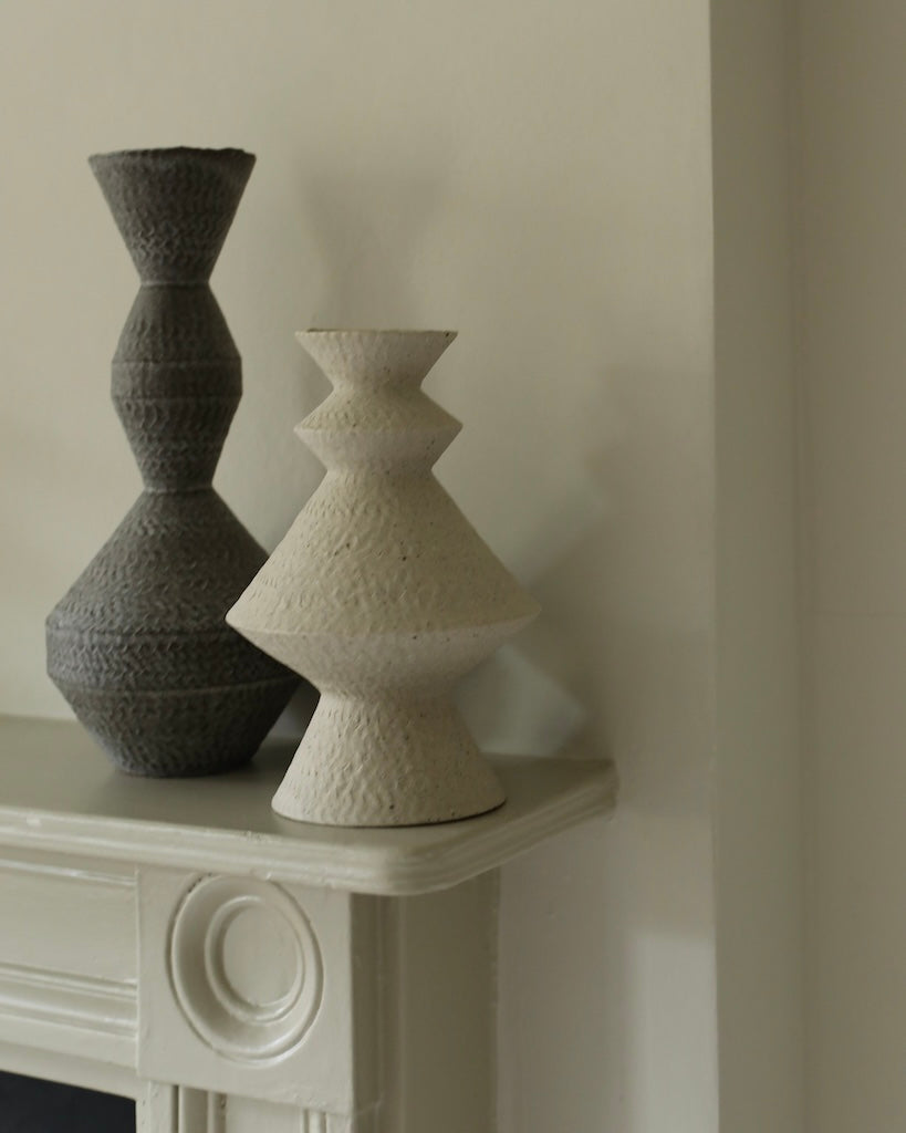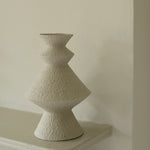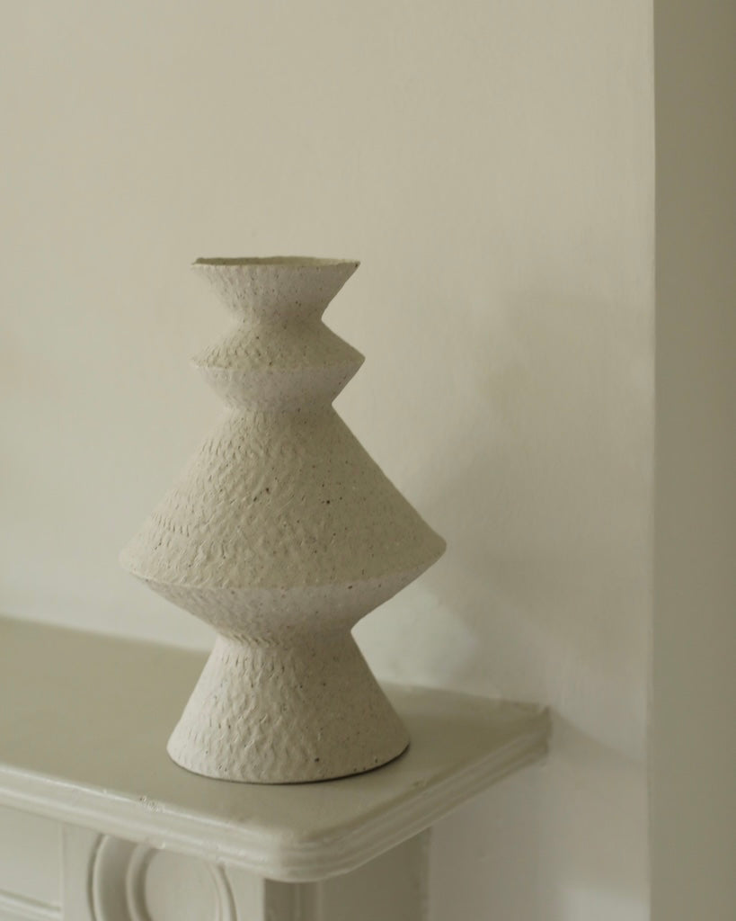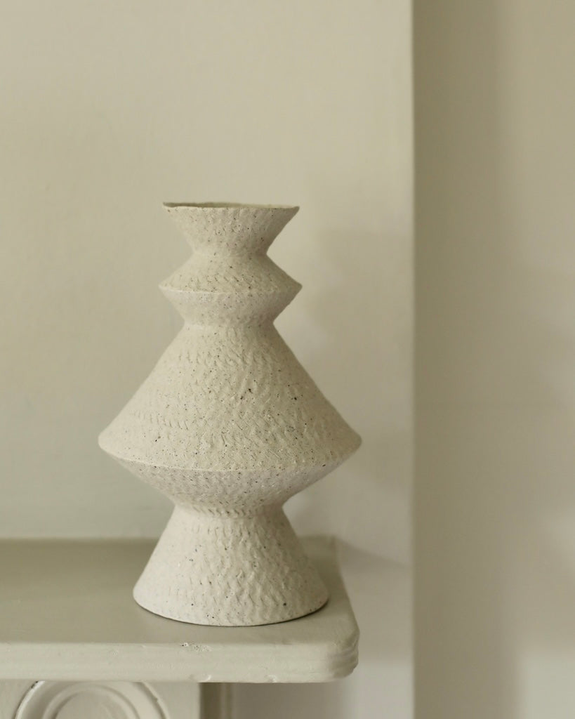 Crafted from a mixture of clays collected in Germany’s volcanic valley, this sculptural vase in muted, neutral, soft white is both playful and pure, possessing an earthy texture and geometric form emphasized by the unglazed matte exterior and transparent glazed interior.