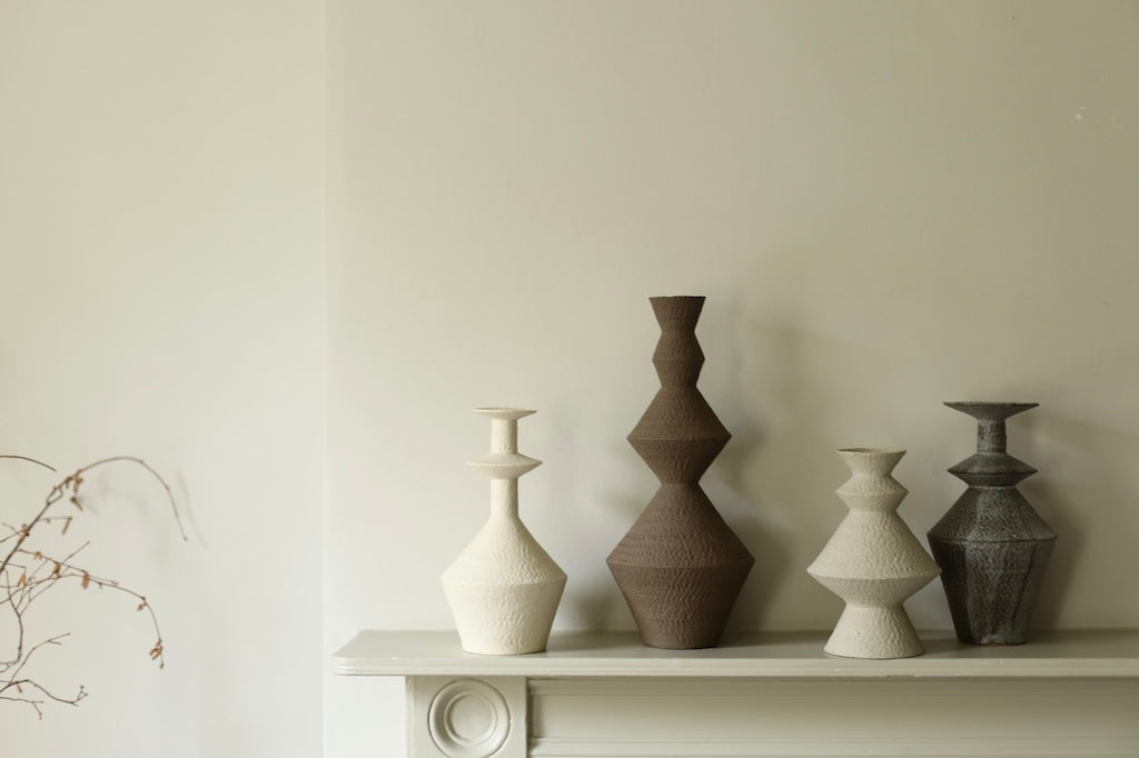 Kiho constructs strictly geometric vessels and tableware by coiling and pinching, slowly building up each piece. Kiho’s ceramics are inspired by memory, architecture and everyday objects. They are both fully functional and aesthetic, created with the user in mind and with the aim of purity. Kiho refrains from adding unnecessary adornments to his pieces to allow the user to experience the texture of the clay, which varies widely due to his practice of mixing clays collected in Germany’s volcanic valleys. This is enhanced by the unglazed matte exteriors combined with transparent glazed interiors, which emphasizes the pure and structural elements of the work.