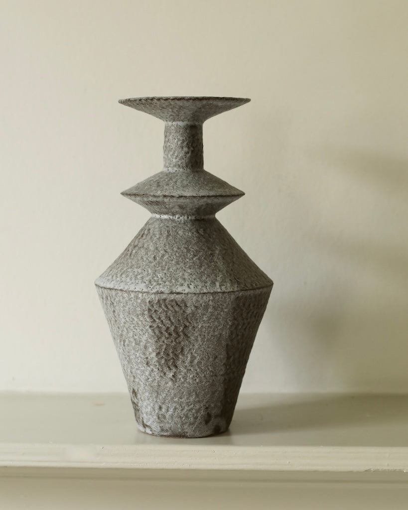 Crafted from a mixture of clays collected in Germany’s volcanic valley, this sculptural vase in muted, neutral, soft white is both playful and pure, possessing an earthy texture and geometric form emphasized by the unglazed matte exterior and transparent glazed interior.