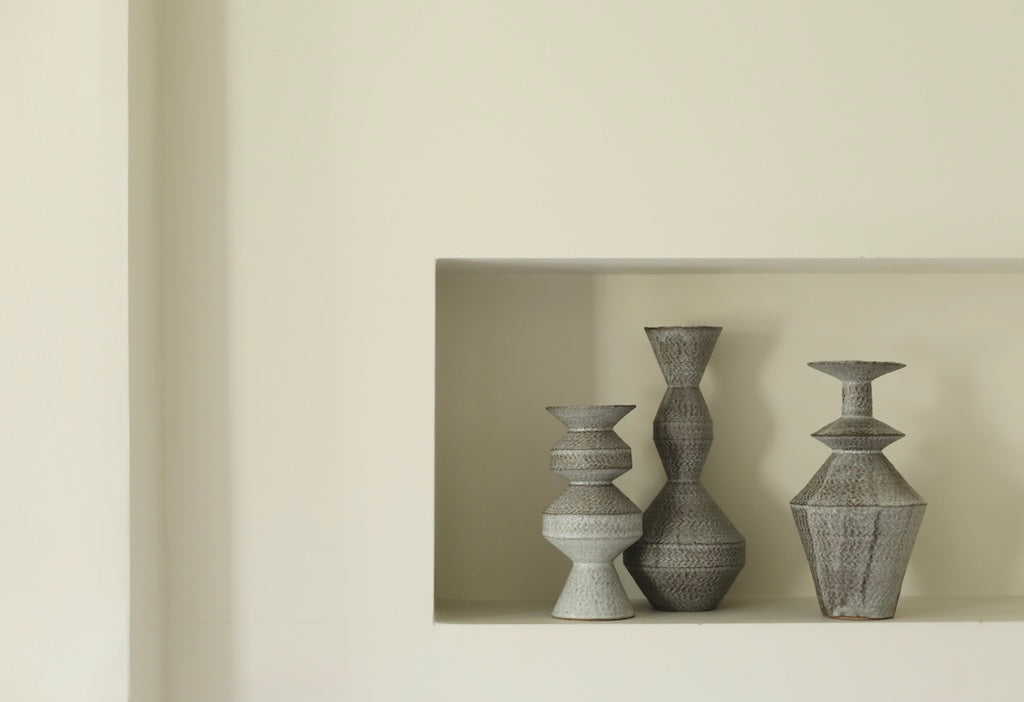 Kiho constructs strictly geometric vessels and tableware by coiling and pinching, slowly building up each piece. Kiho’s ceramics are inspired by memory, architecture and everyday objects. They are both fully functional and aesthetic, created with the user in mind and with the aim of purity. Kiho refrains from adding unnecessary adornments to his pieces to allow the user to experience the texture of the clay, which varies widely due to his practice of mixing clays collected in Germany’s volcanic valleys. This is enhanced by the unglazed matte exteriors combined with transparent glazed interiors, which emphasizes the pure and structural elements of the work.