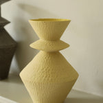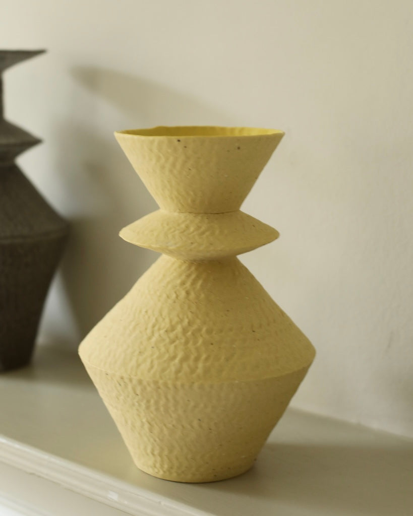 Crafted from a mixture of clays collected in Germany’s volcanic valley, this sculptural vase in muted, neutral, soft white is both playful and pure, possessing an earthy texture and geometric form emphasized by the unglazed matte exterior and transparent glazed interior.