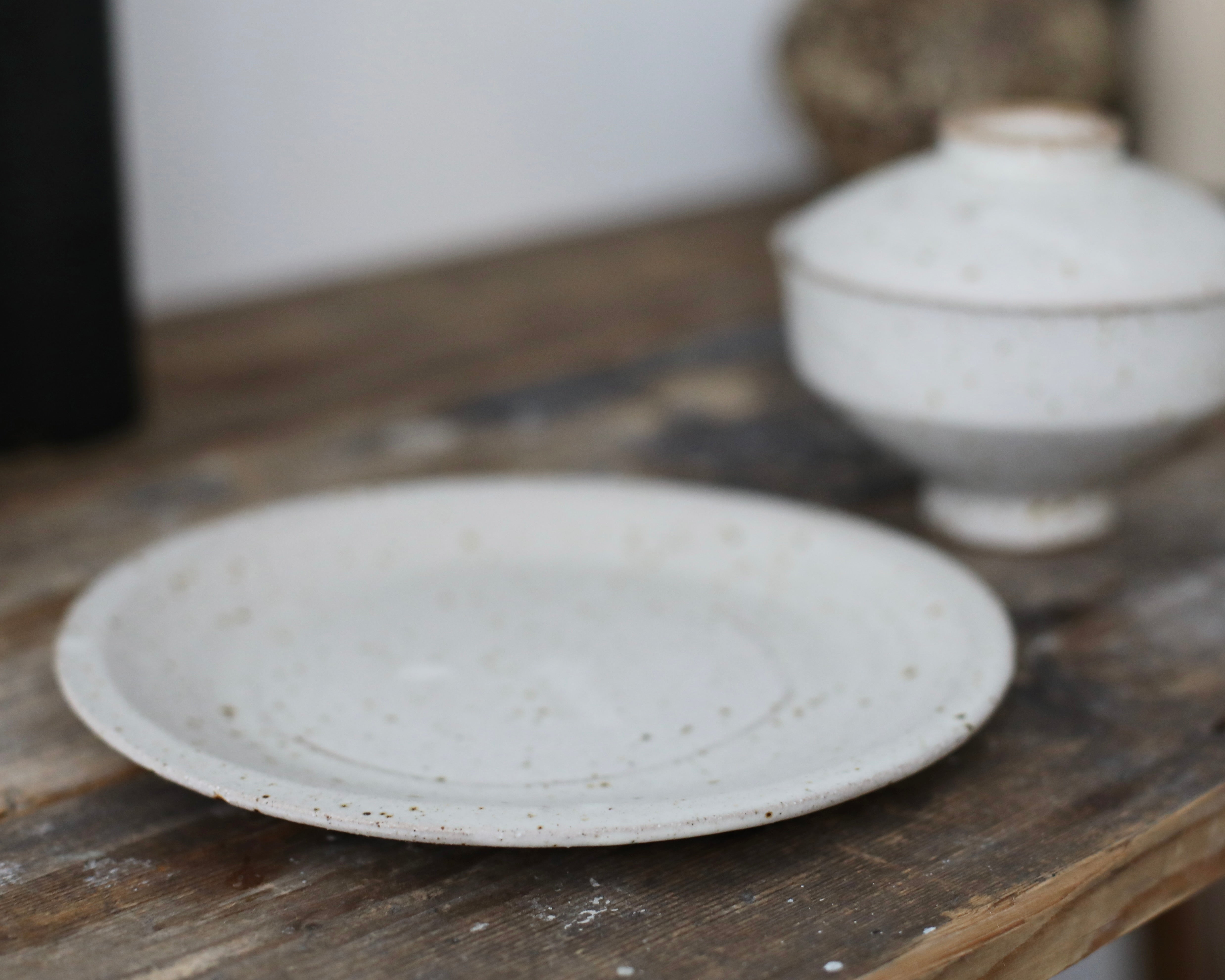 A smooth, white plate subtly flecked, adding a touch of texture and character to its minimalist design.