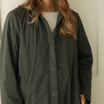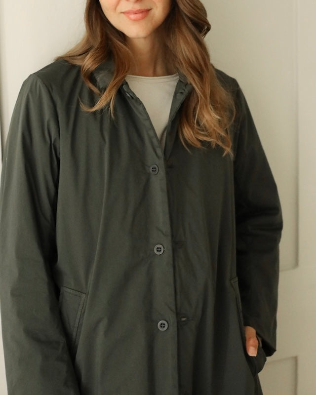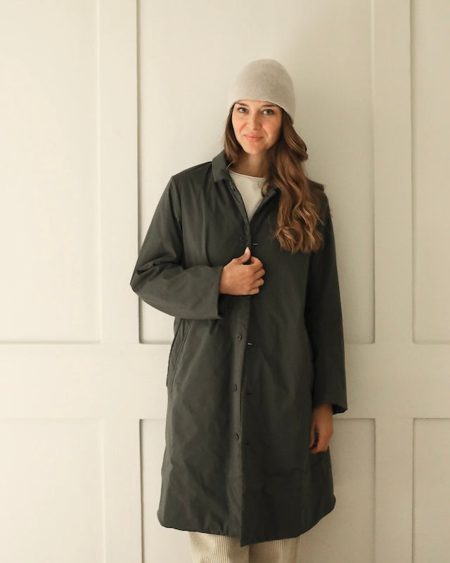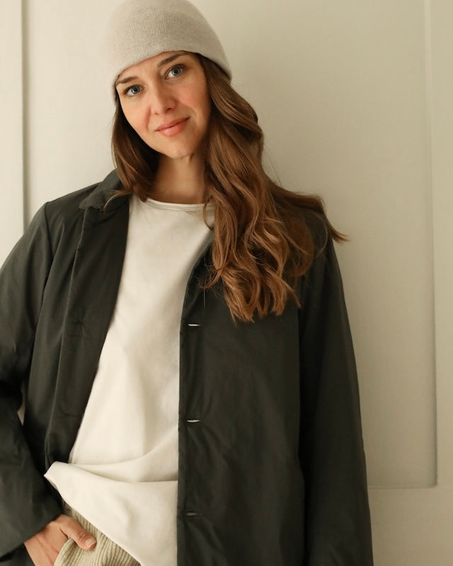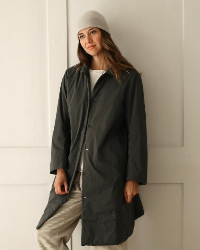 The Giacca Davis is a mid-length, lightly padded jacket crafted from a garment-dyed cotton blend with a water-repellent finish. Designed for both function and form, it features a pointed collar, front button closure, and dropped shoulders that create a softly oversized, boxy silhouette.