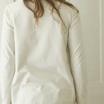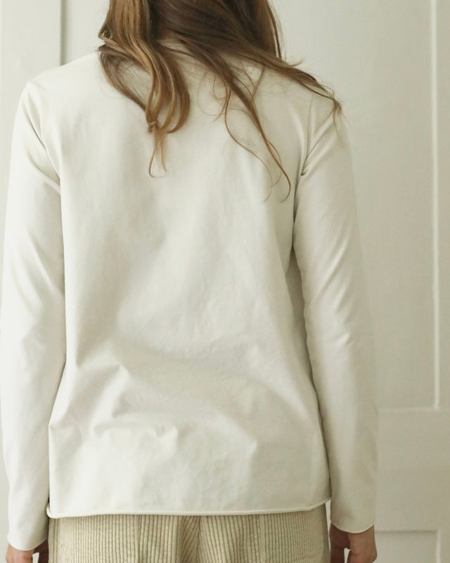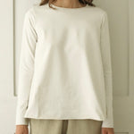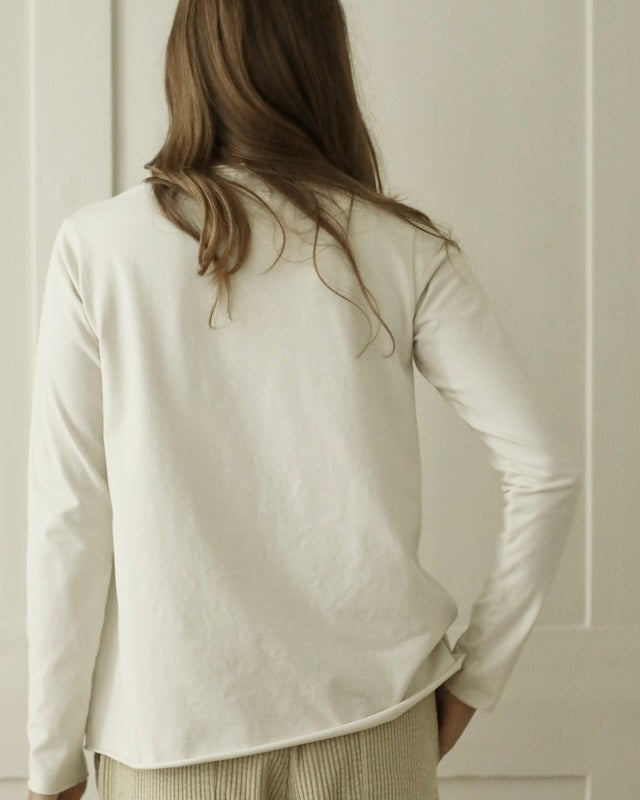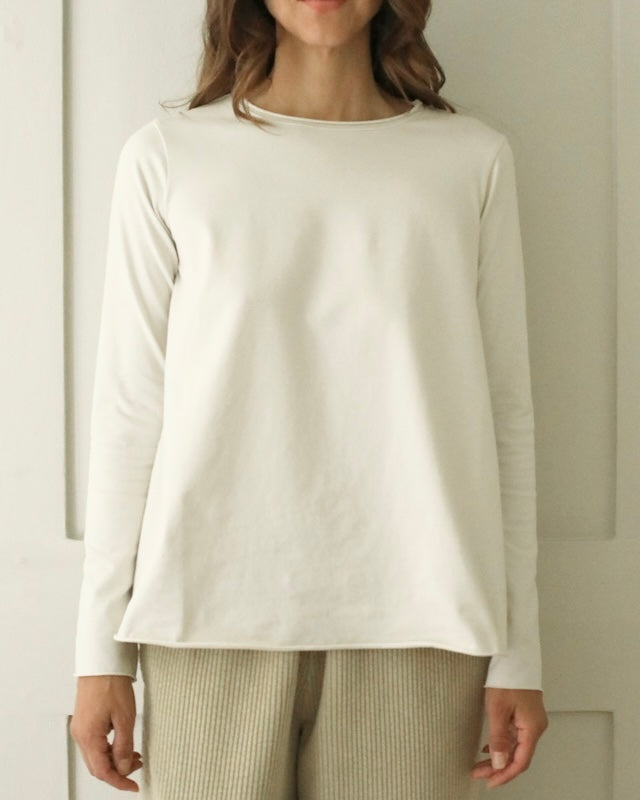 The Maglia Jeppe is a longline A-line top cut from soft cotton jersey, offering gentle structure with a fluid, easy drape. It features a softly rolled neckline and raw, unhemmed edges at the sleeves and hem, adding a subtle touch of texture and ease.