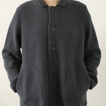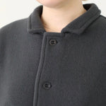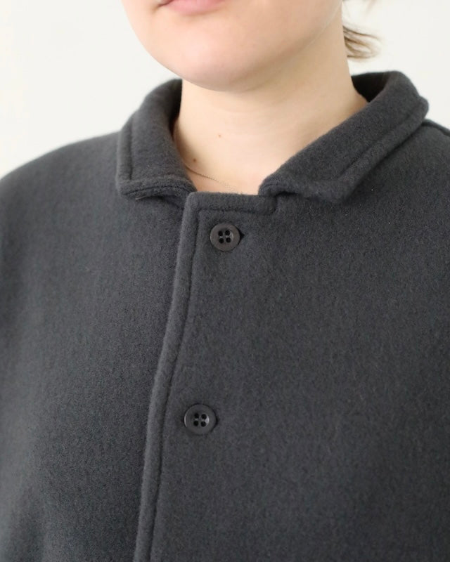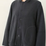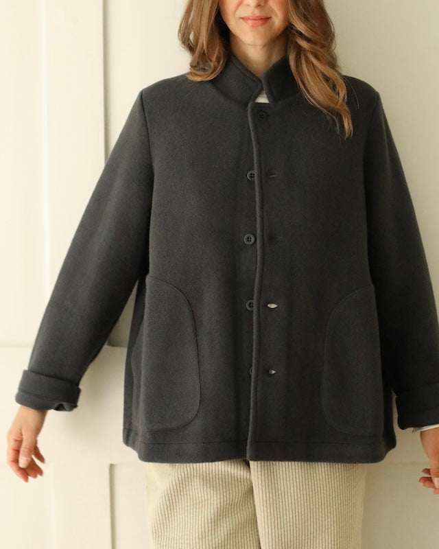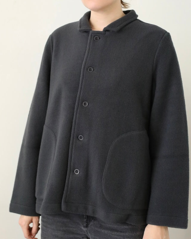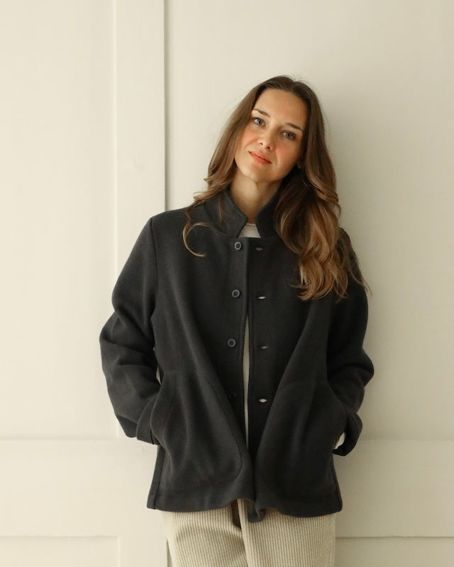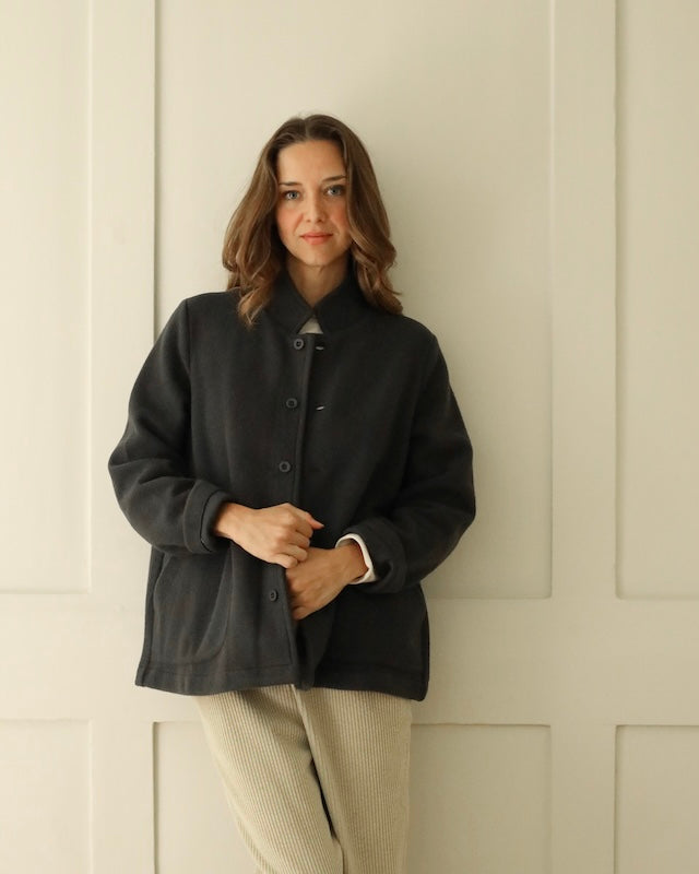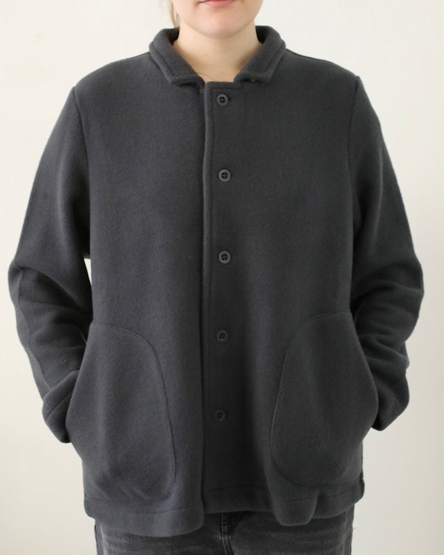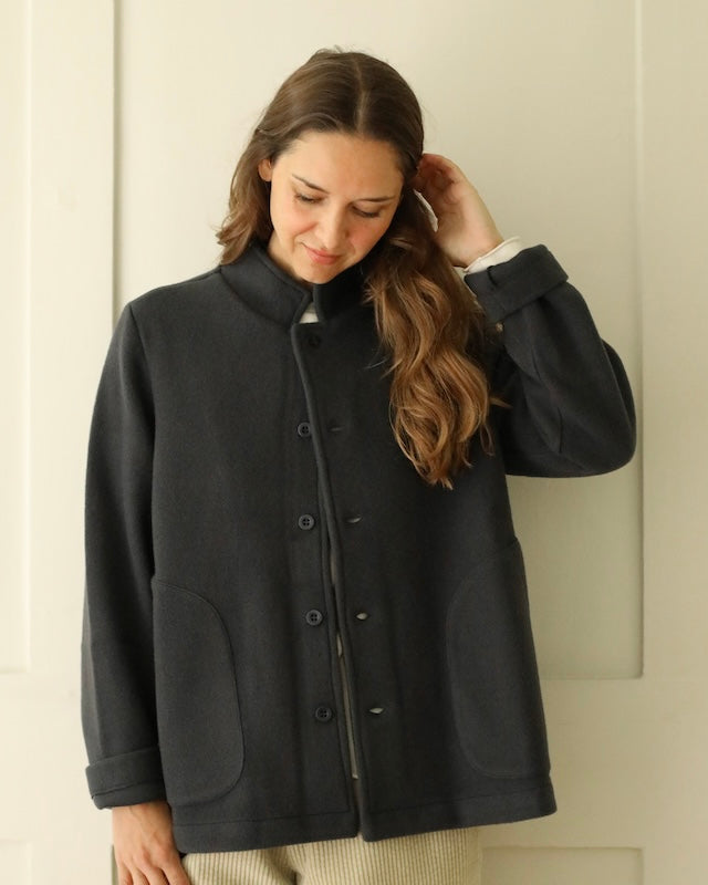 The Giacca Minos is a structured yet soft jacket crafted from warm felted wool fleece, offering comfort with a clean, architectural silhouette. It features a small collar, tonal button front, and set-in sleeves for a tailored feel, while angled patch pockets and a straight hem add thoughtful, functional details.