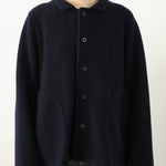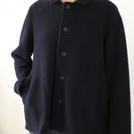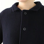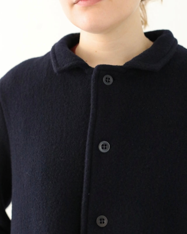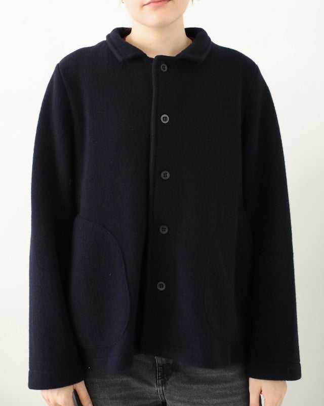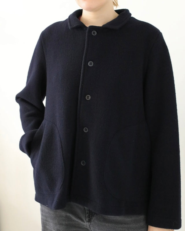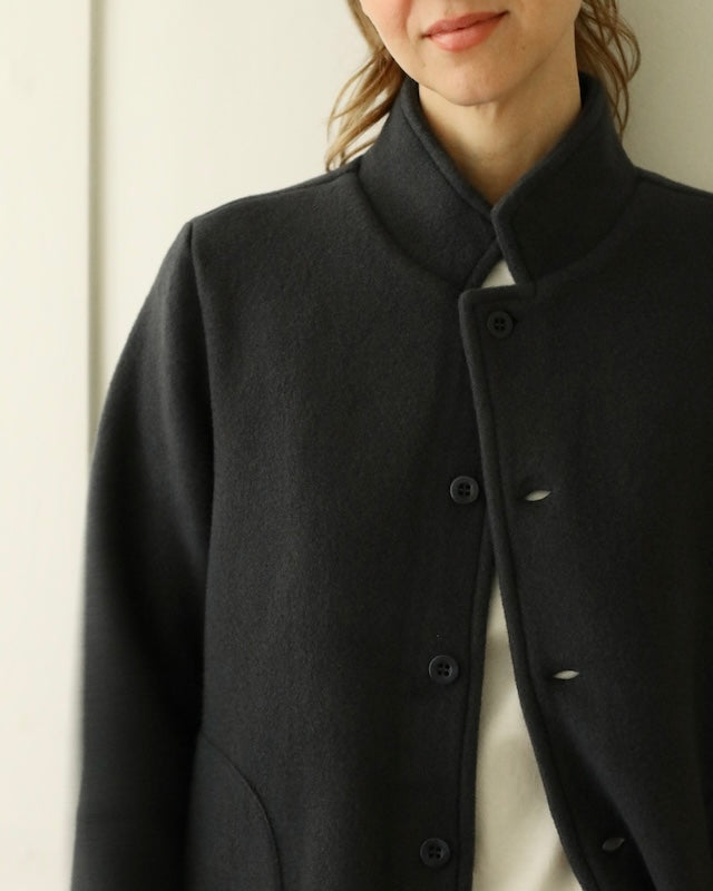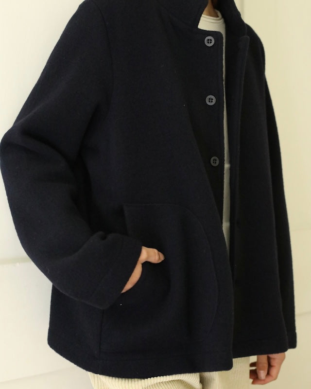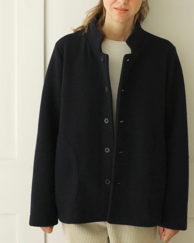 The Giacca Minos is a structured yet soft jacket crafted from warm felted wool fleece, offering comfort with a clean, architectural silhouette. It features a small collar, tonal button front, and set-in sleeves for a tailored feel, while angled patch pockets and a straight hem add thoughtful, functional details.