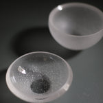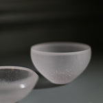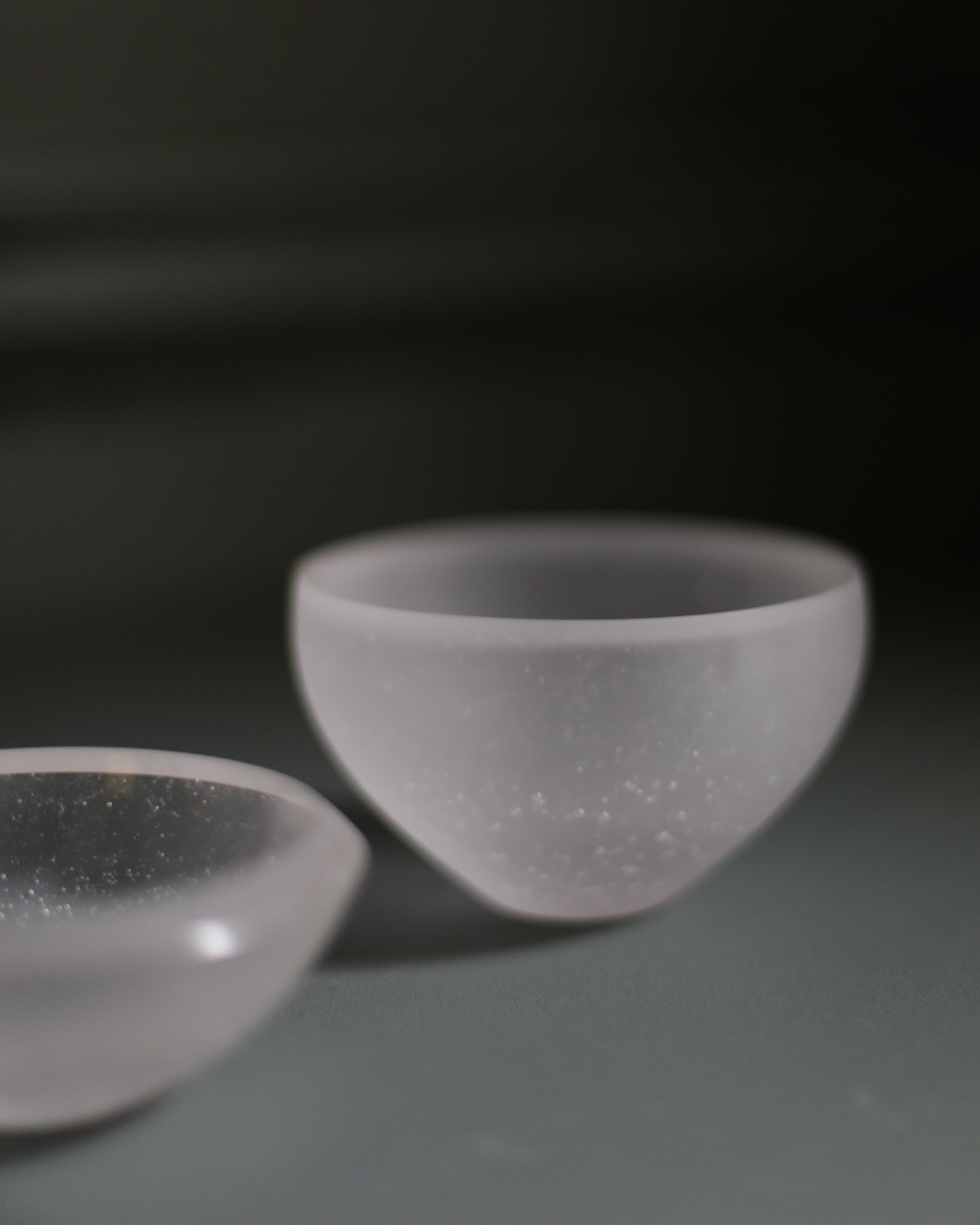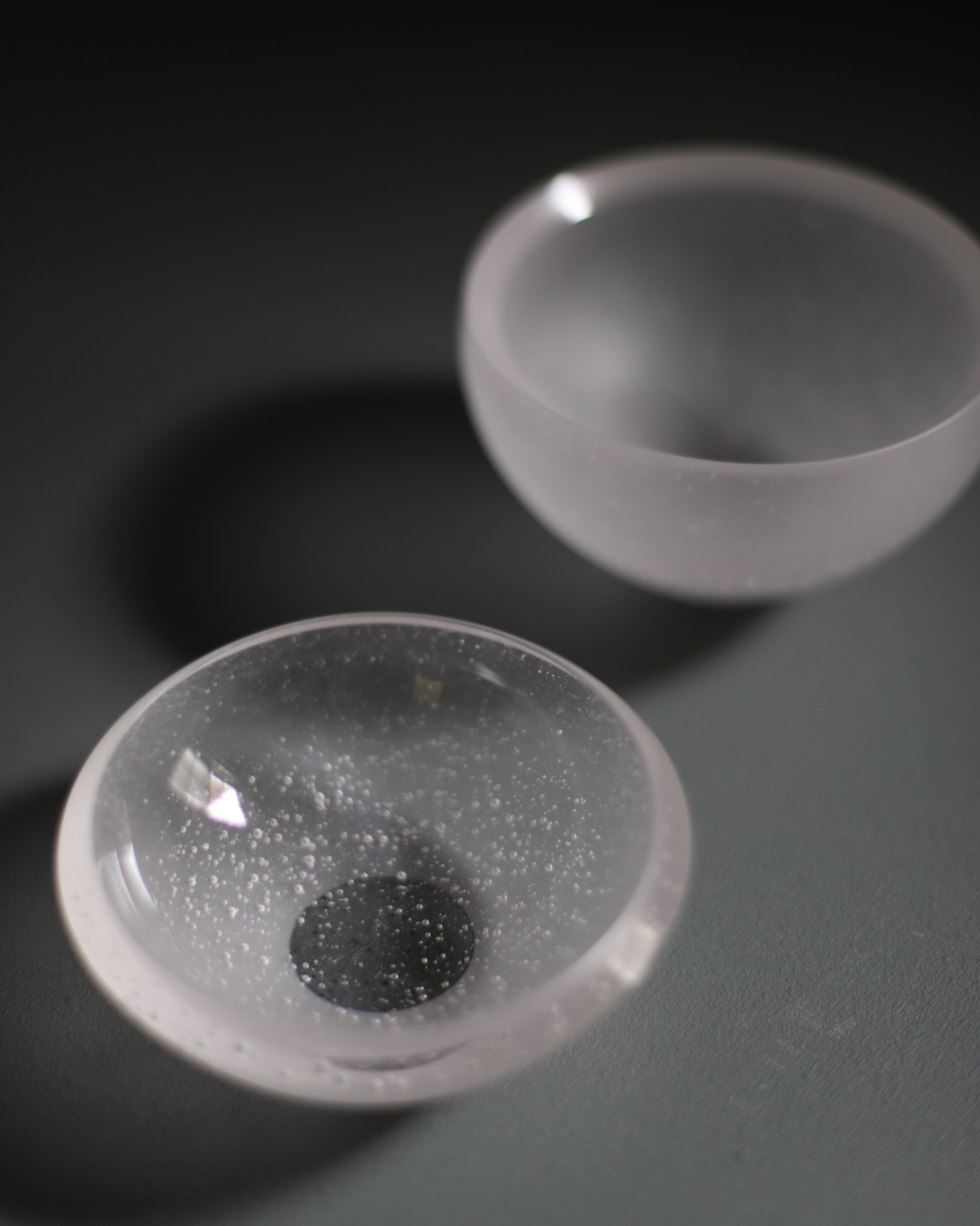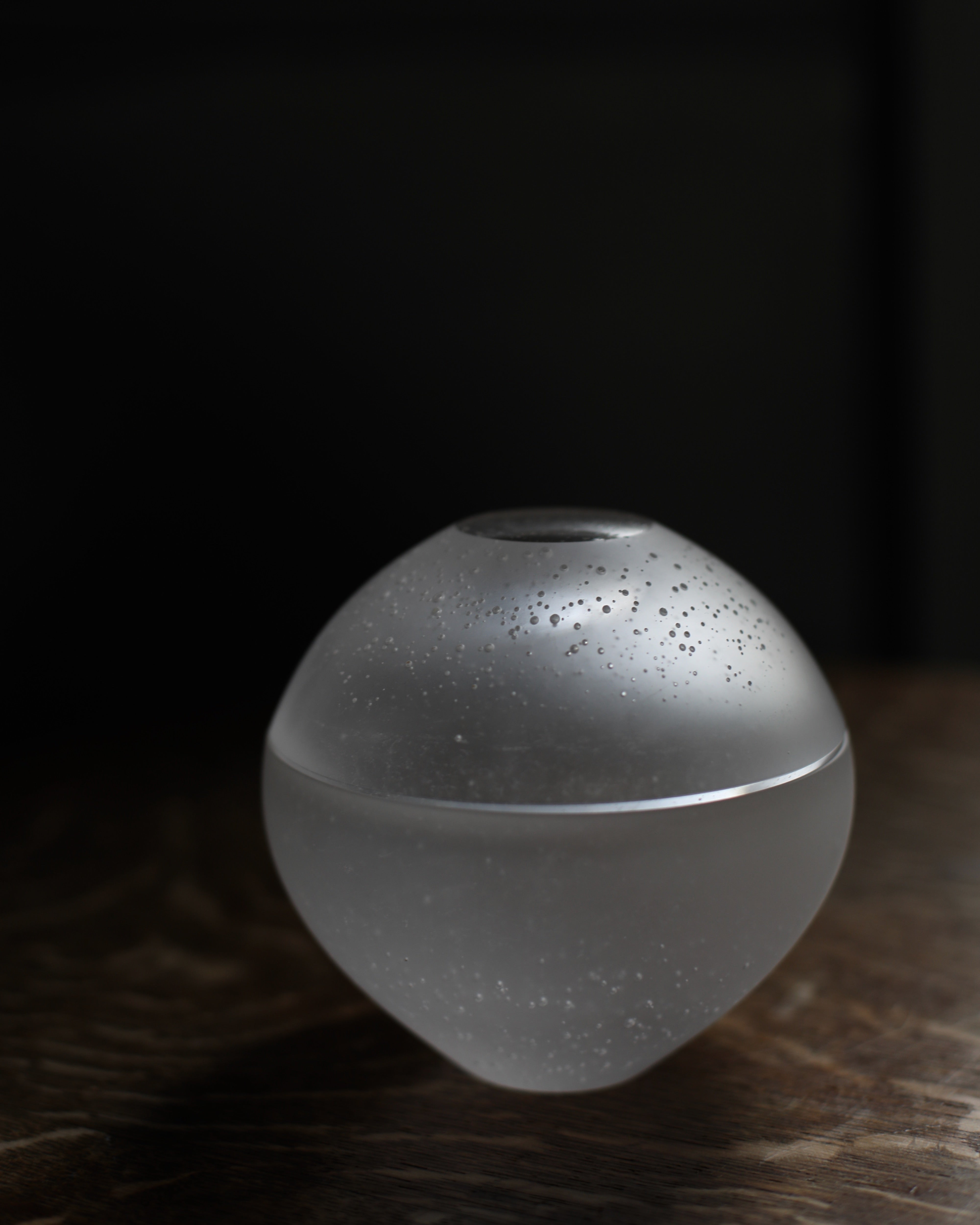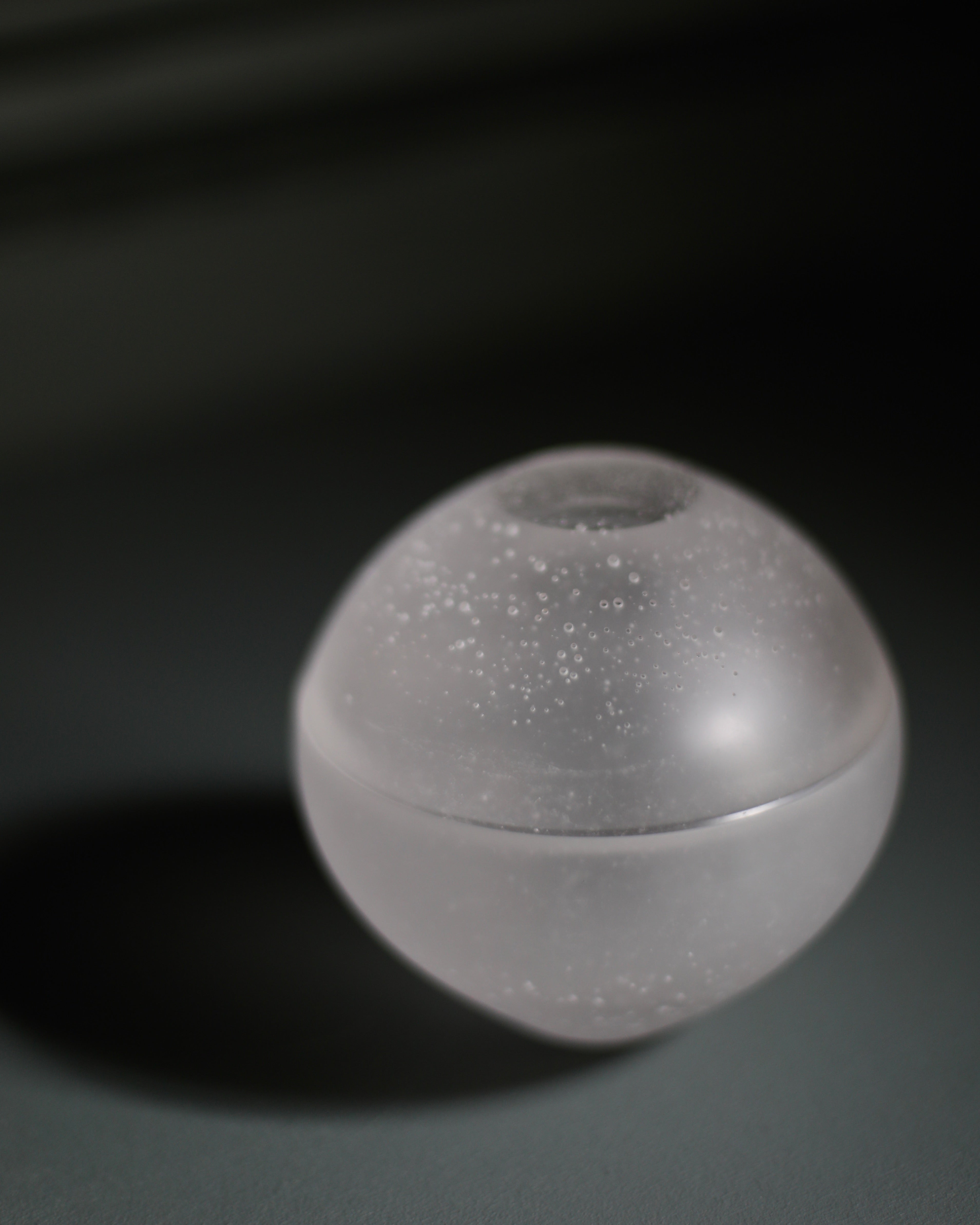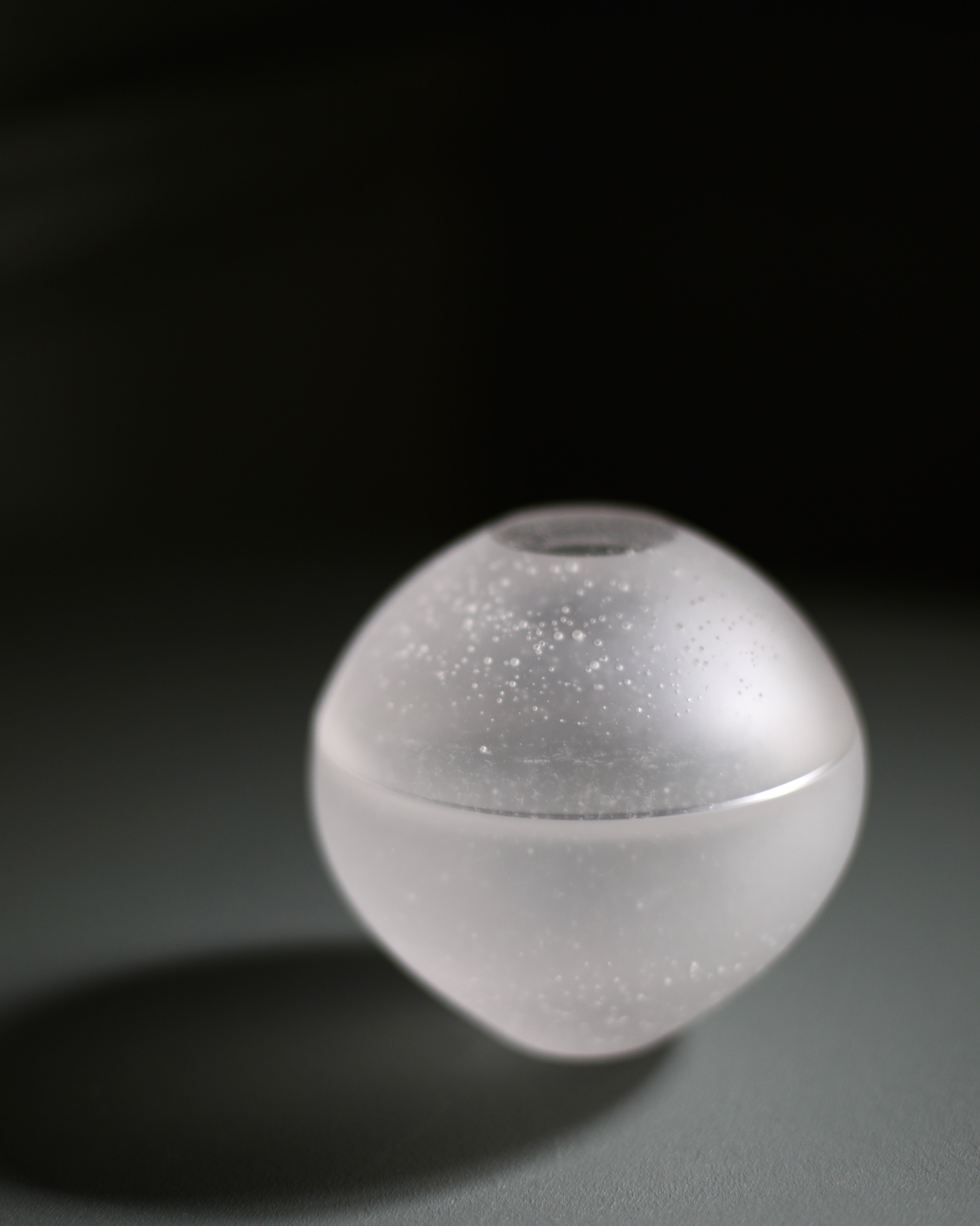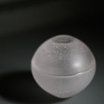 An exploration into glass's ability to simultaneously conceal and reveal, this kiln-formed spherical glass vessel with a rounded lid has been handworked and polished to recall the 'ocular'. With a silky and matte finish, this translucent and dynamic vessel subtly hints at what is kept inside, heightening the act of looking. This 'Lens Container' possesses a frosted exterior contrasted with glossy interiors and energetic air bubble details resulting in a sophisticated luminosity. Small enough to fit in one's hands, the concave lensing in the peephole creates an illusion of distance, making everything miniature. This lensing creates an otherworldly dimension, a tiny precious space where something of emotional value can be kept.