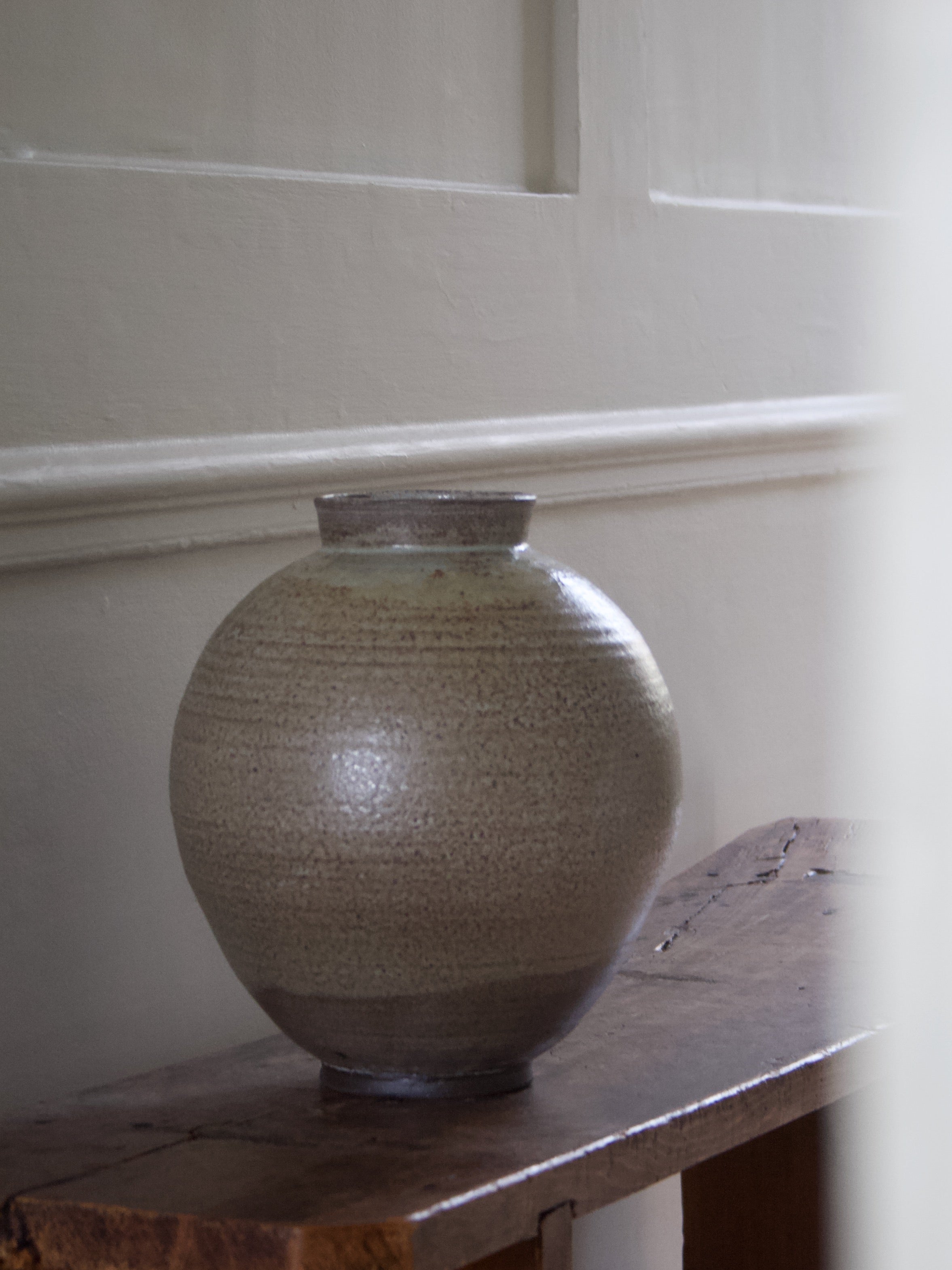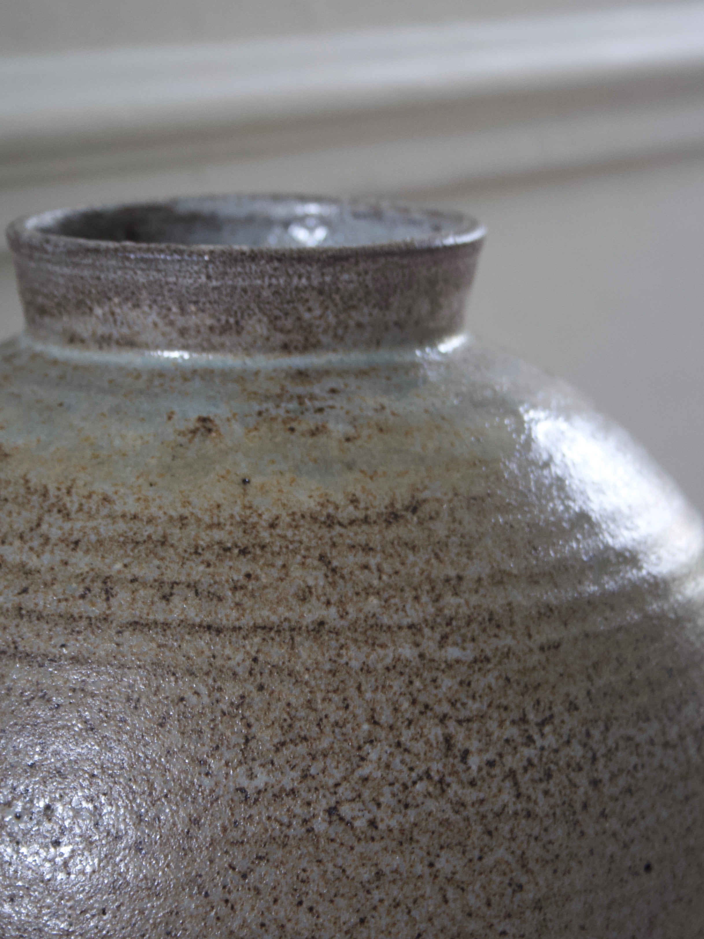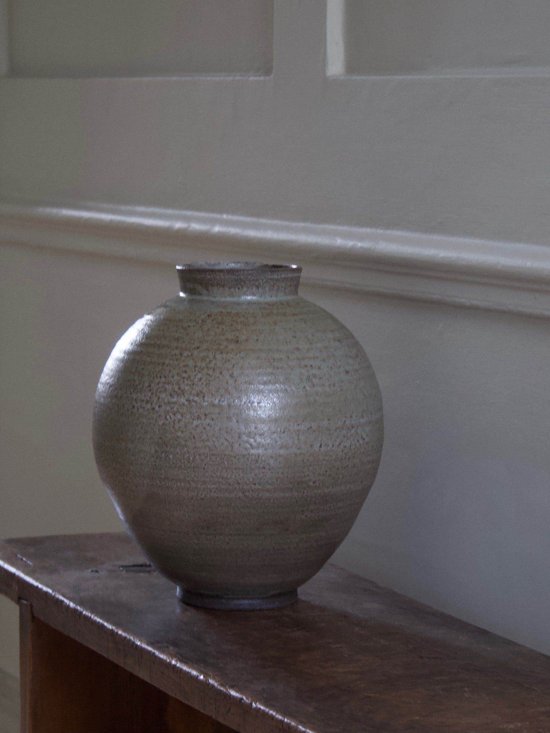 A bold silhouette with elegant neck and beautifully smooth, pure surface. With an enticing surface coated with a soft semi translucent greenish glaze that Louise worked on for over two years, this bold form is a timeless piece with great presence.