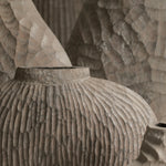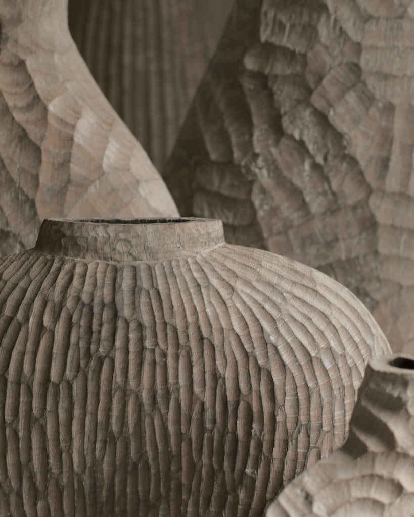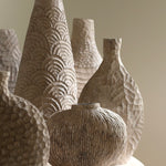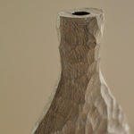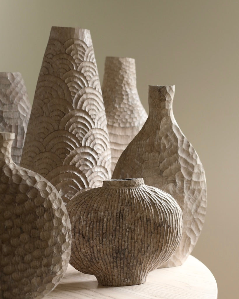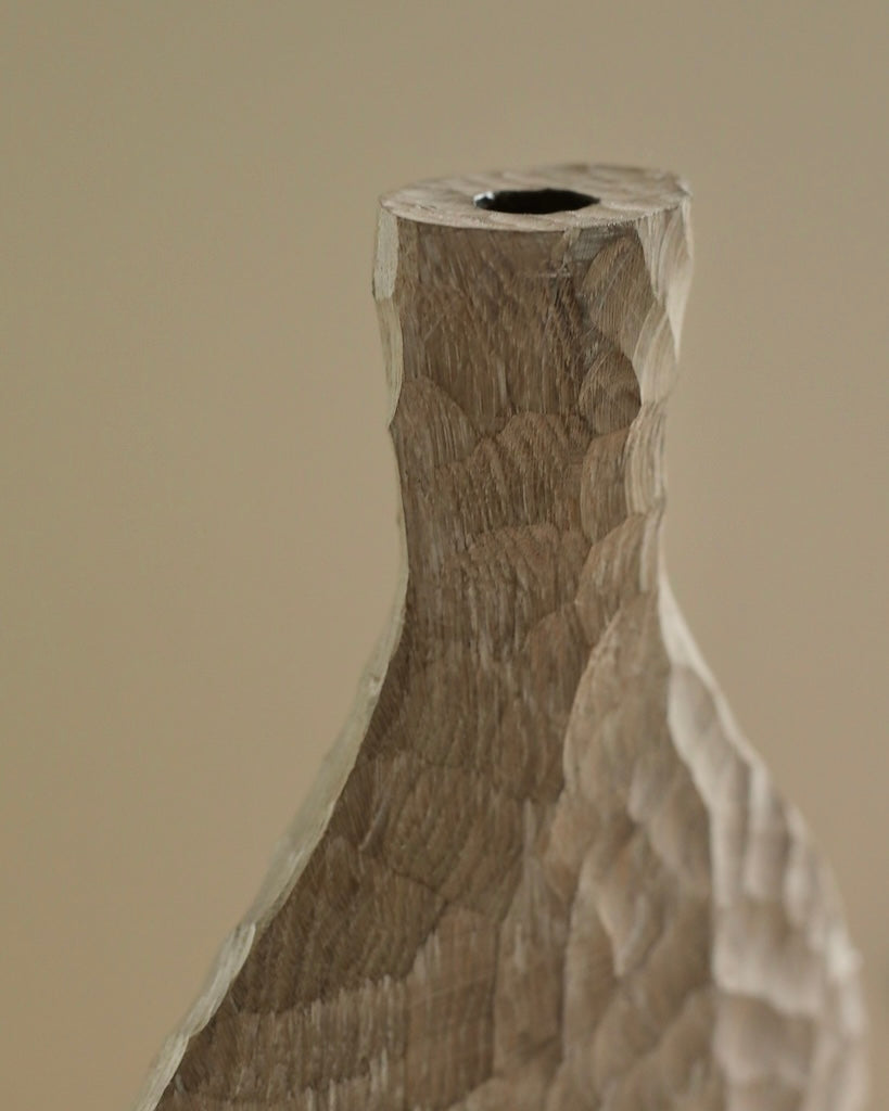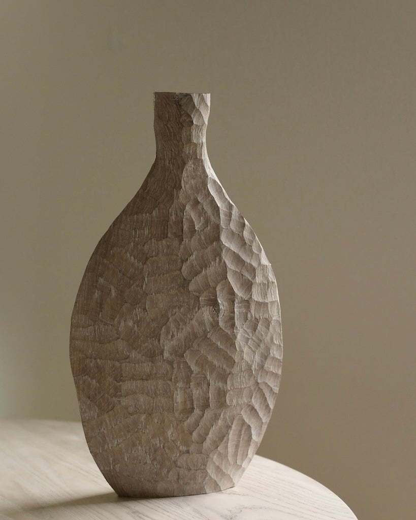 Beautifully made by Malcolm Martin and Gaynor Dowling, this tall bottle was carved using limed and scorched oak, by working with traditional hand-tool techniques. The wood is light in colour, with striking grooves on the outer layer that move horizontally from the base to the peak. With an elongated neck, this piece stands tall, resting flawlessly in any room. The repeated ridges offer an intriguingly tactile surface that is distinct to Martin and Dowling’s extraordinary works of art.