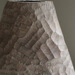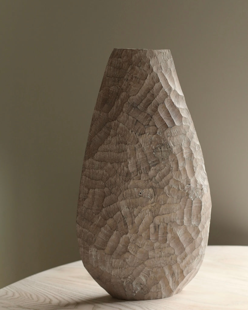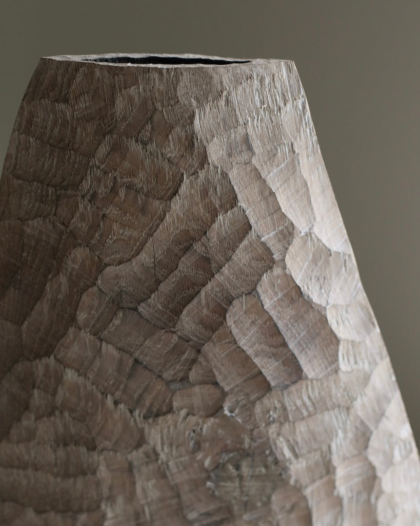 Beautifully made by Malcolm Martin and Gaynor Dowling, this tall bottle was carved using limed and scorched oak, by working with traditional hand-tool techniques. The wood is light in colour, with striking grooves on the outer layer that move horizontally from the base to the peak. With an elongated neck, this piece stands tall, resting flawlessly in any room. The repeated ridges offer an intriguingly tactile surface that is distinct to Martin and Dowling’s extraordinary works of art.