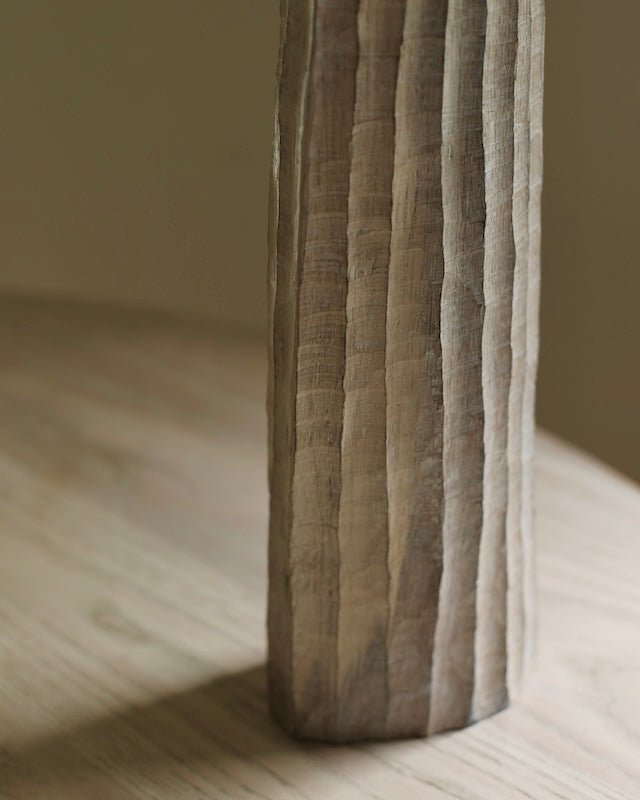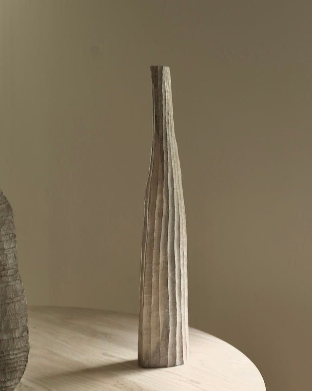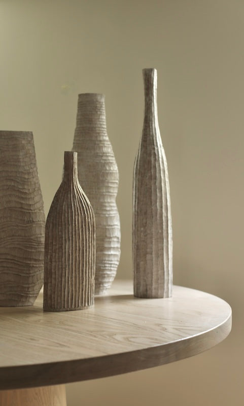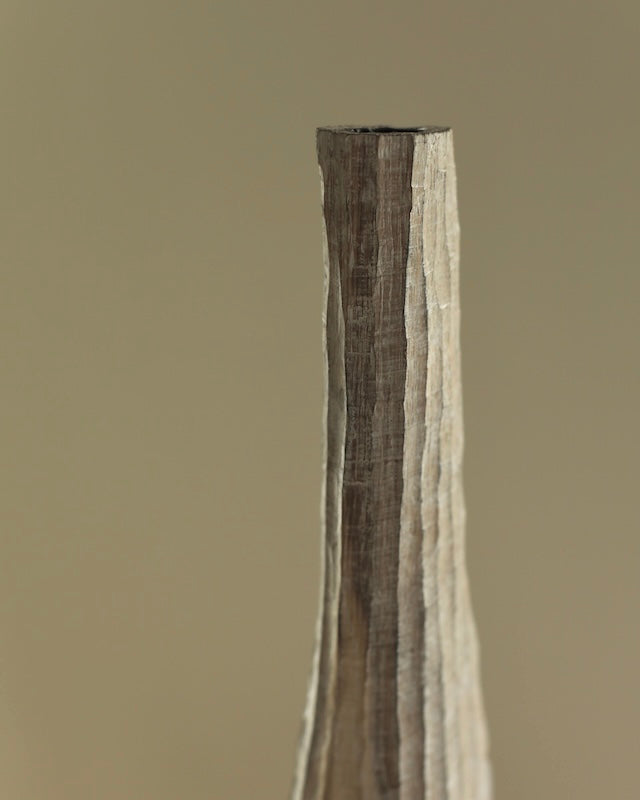 Beautifully made by Malcolm Martin and Gaynor Dowling, this tall bottle was carved using limed and scorched oak, by working with traditional hand-tool techniques. The wood is light in colour, with striking grooves on the outer layer that move horizontally from the base to the peak. With an elongated neck, this piece stands tall, resting flawlessly in any room. The repeated ridges offer an intriguingly tactile surface that is distinct to Martin and Dowling’s extraordinary works of art.