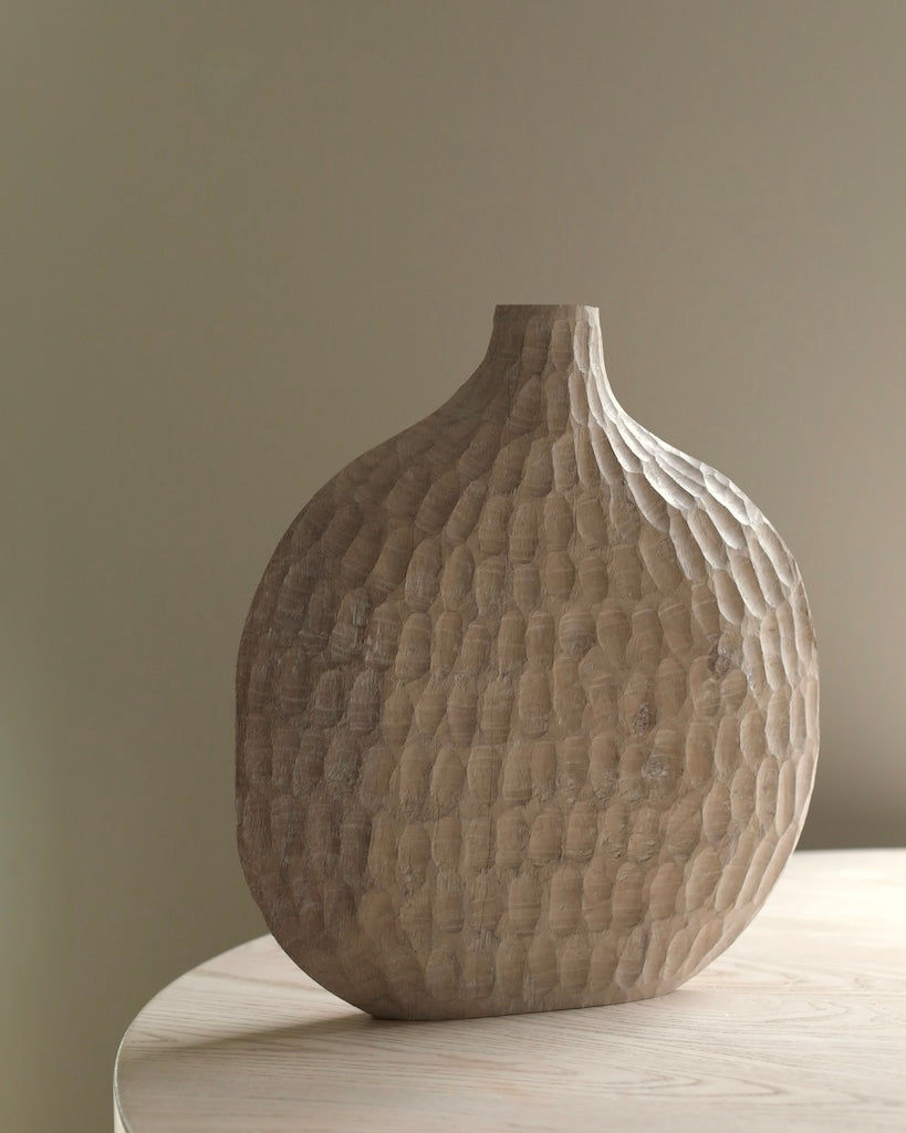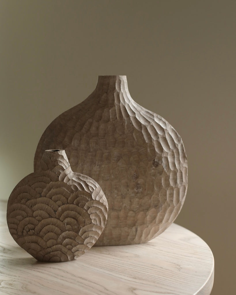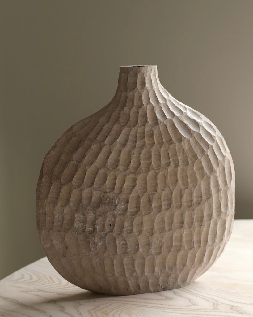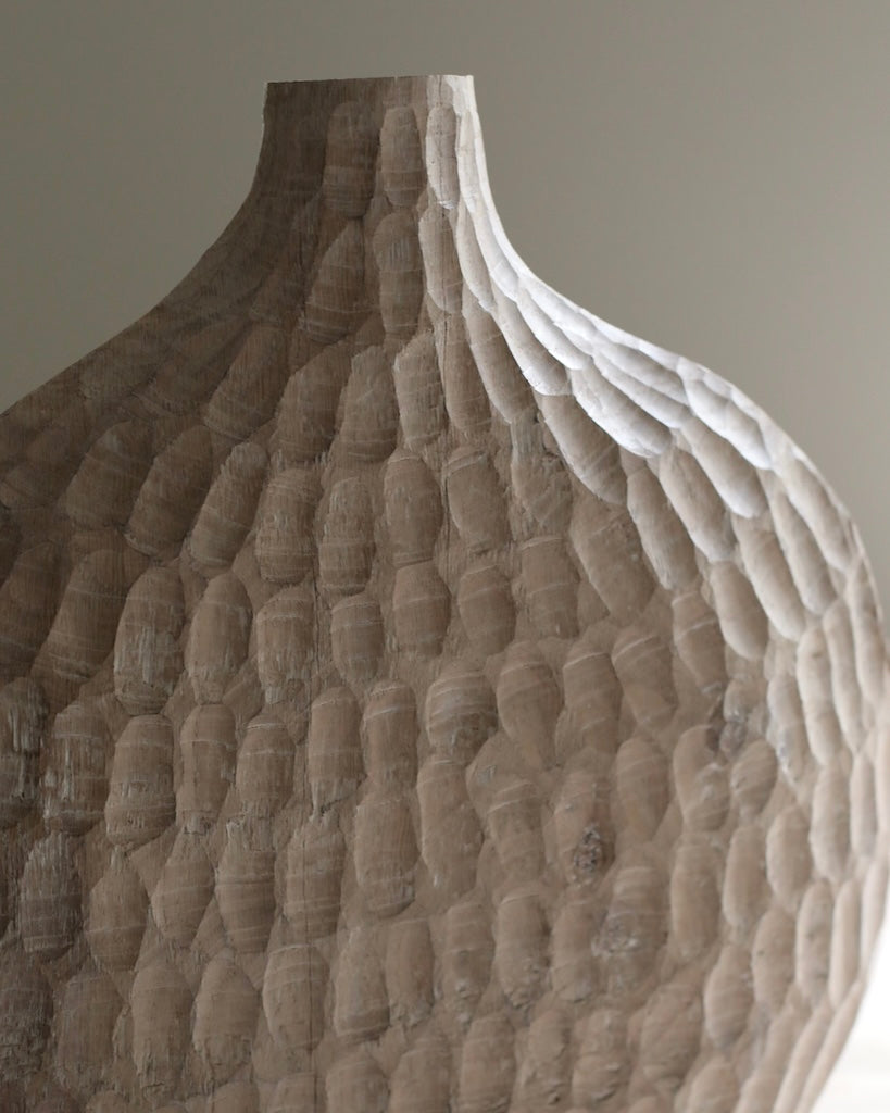 Beautifully made by Malcolm Martin and Gaynor Dowling, this tall bottle was carved using limed and scorched oak, by working with traditional hand-tool techniques. The wood is light in colour, with striking grooves on the outer layer that move horizontally from the base to the peak. With an elongated neck, this piece stands tall, resting flawlessly in any room. The repeated ridges offer an intriguingly tactile surface that is distinct to Martin and Dowling’s extraordinary works of art.