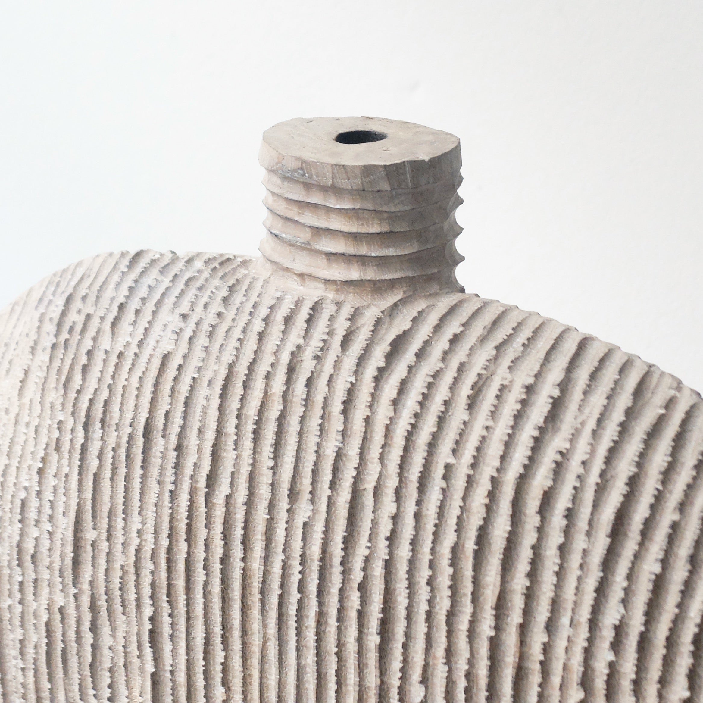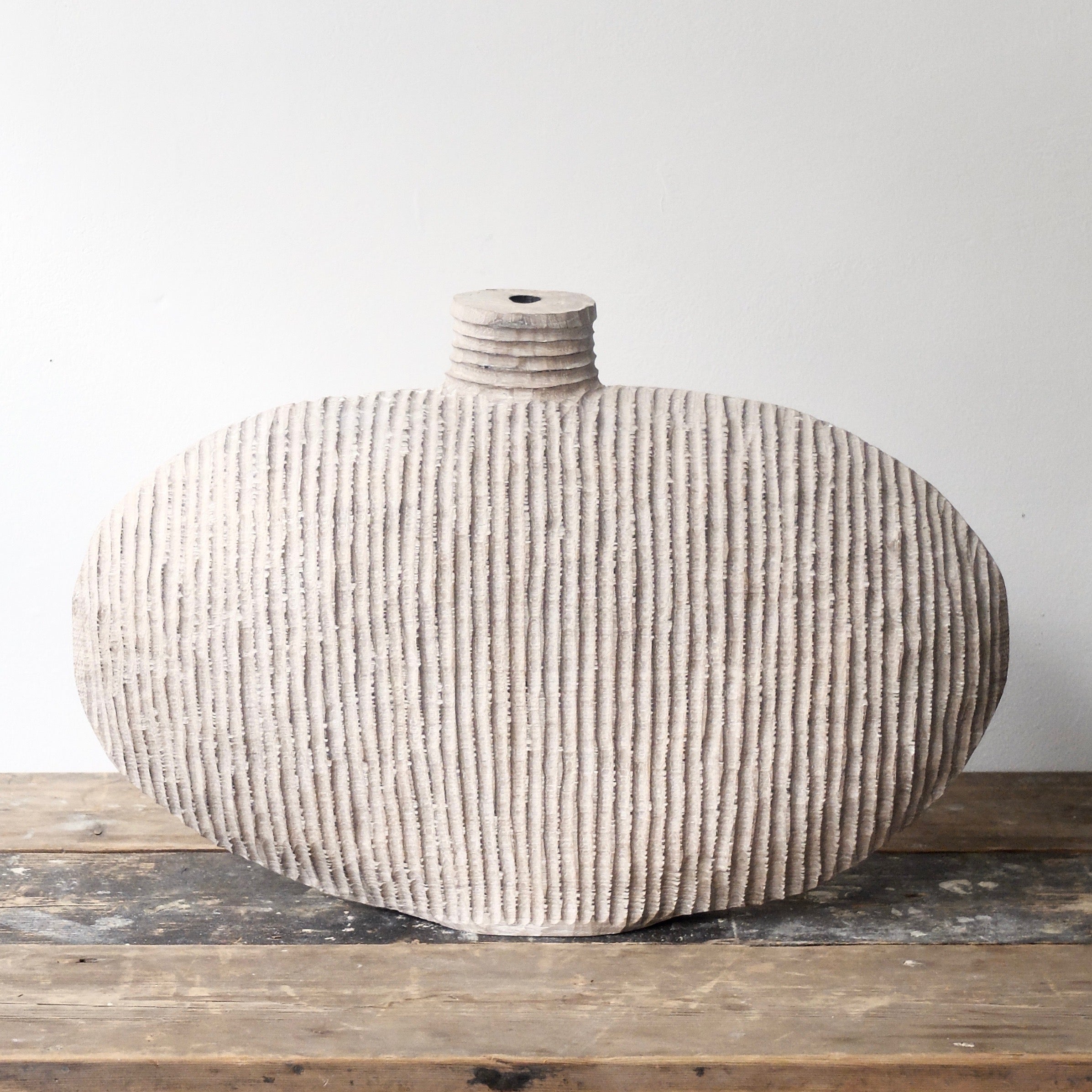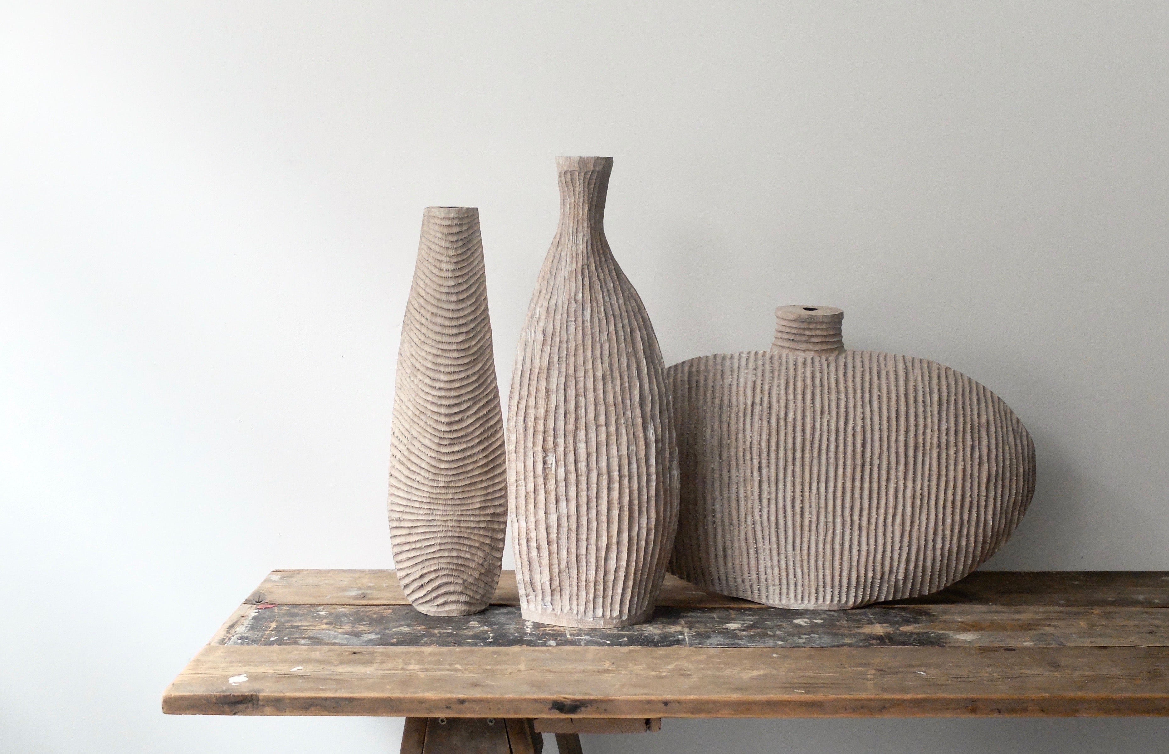 Malcolm Martin and Gaynor Dowling are collaborative wood artists who have lived and worked together in Stroud, Gloucestershire, since 1997. Their different artistic backgrounds, in Fine Art and Textiles respectively, inform a practice that is simultaneously sculpture and craft. Martin and Dowling’s vessel-sculptures, which explore dimensionality and vary significantly in size and shape, are made with traditional hand-tool techniques. Meticulous and repeated carving, in a manner similar to drawing, results in the textured and patterned surfaces which celebrate their making-process.