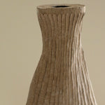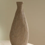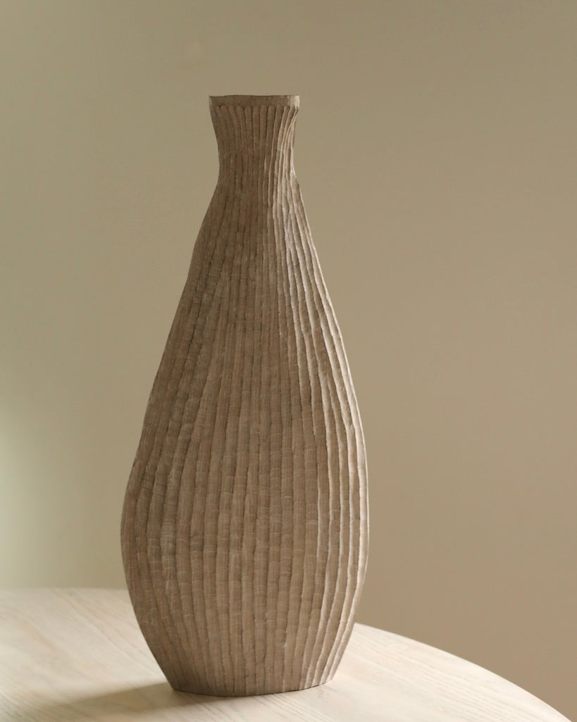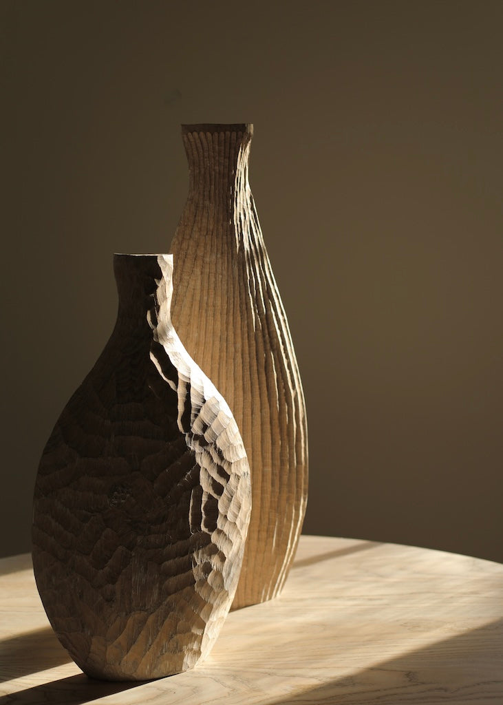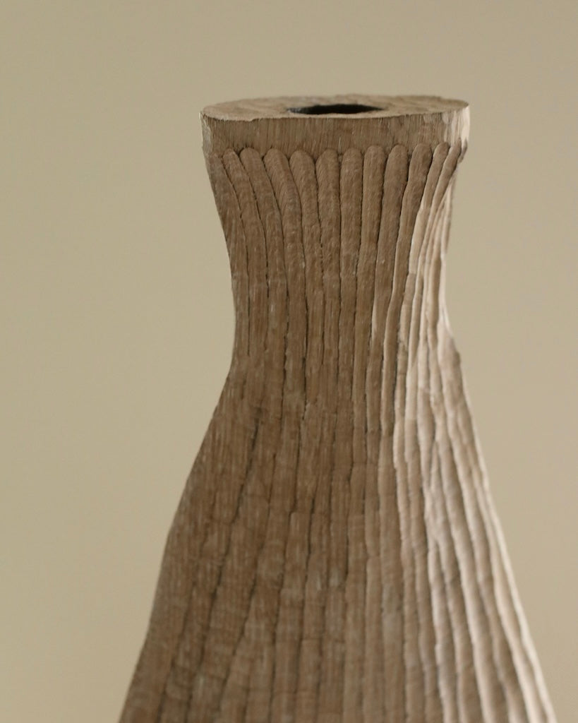 Beautifully made by Malcolm Martin and Gaynor Dowling, this tall bottle was carved using limed and scorched oak, by working with traditional hand-tool techniques. The wood is light in colour, with striking grooves on the outer layer that move horizontally from the base to the peak. With an elongated neck, this piece stands tall, resting flawlessly in any room. The repeated ridges offer an intriguingly tactile surface that is distinct to Martin and Dowling’s extraordinary works of art.