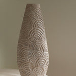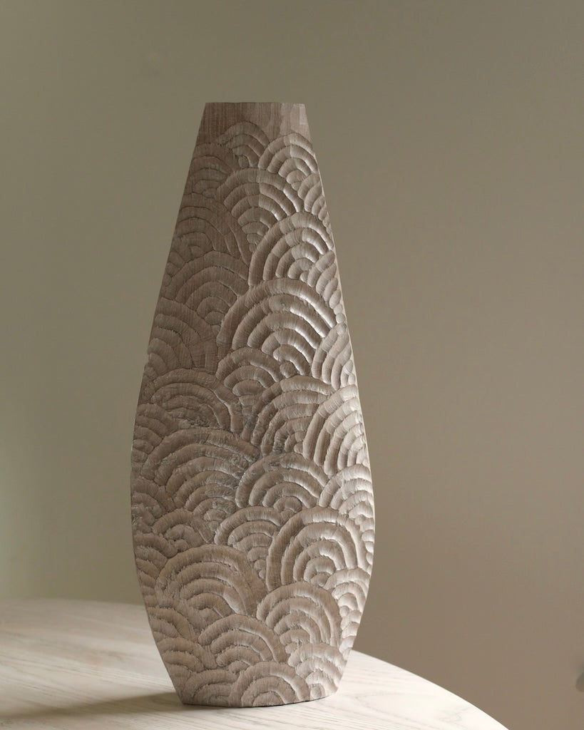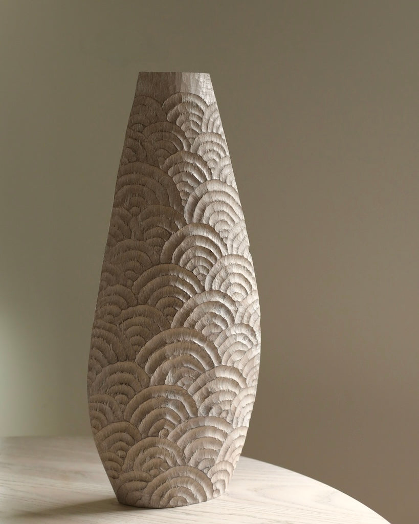 Beautifully made by Malcolm Martin and Gaynor Dowling, this tall bottle was carved using limed and scorched oak, by working with traditional hand-tool techniques. The wood is light in colour, with striking grooves on the outer layer that move horizontally from the base to the peak. With an elongated neck, this piece stands tall, resting flawlessly in any room. The repeated ridges offer an intriguingly tactile surface that is distinct to Martin and Dowling’s extraordinary works of art.
