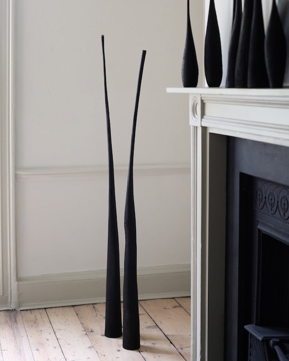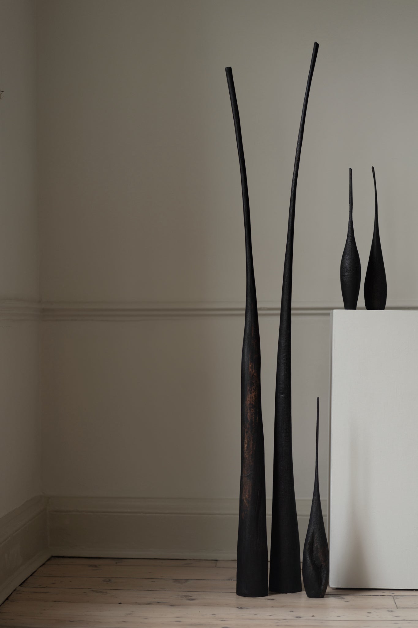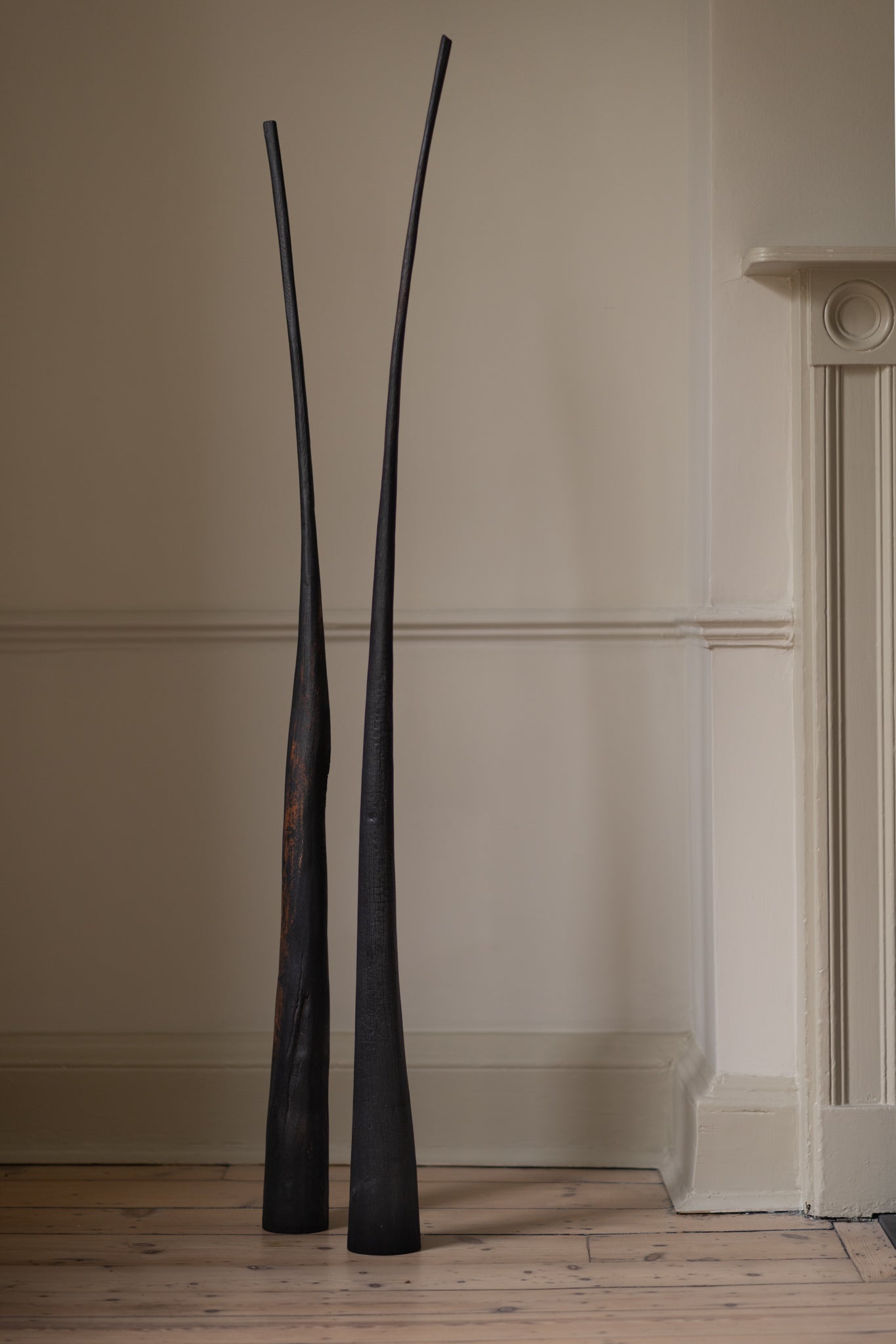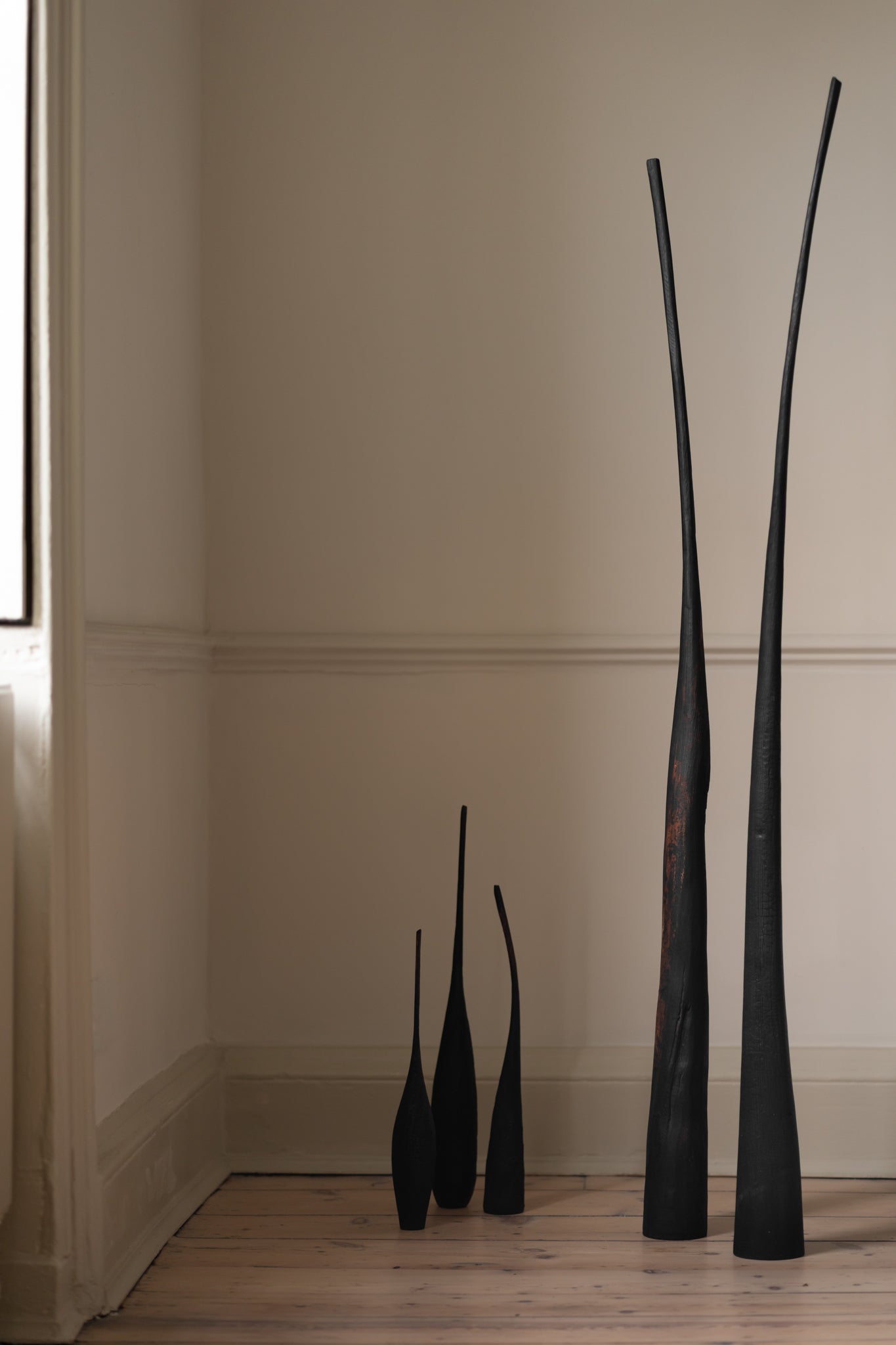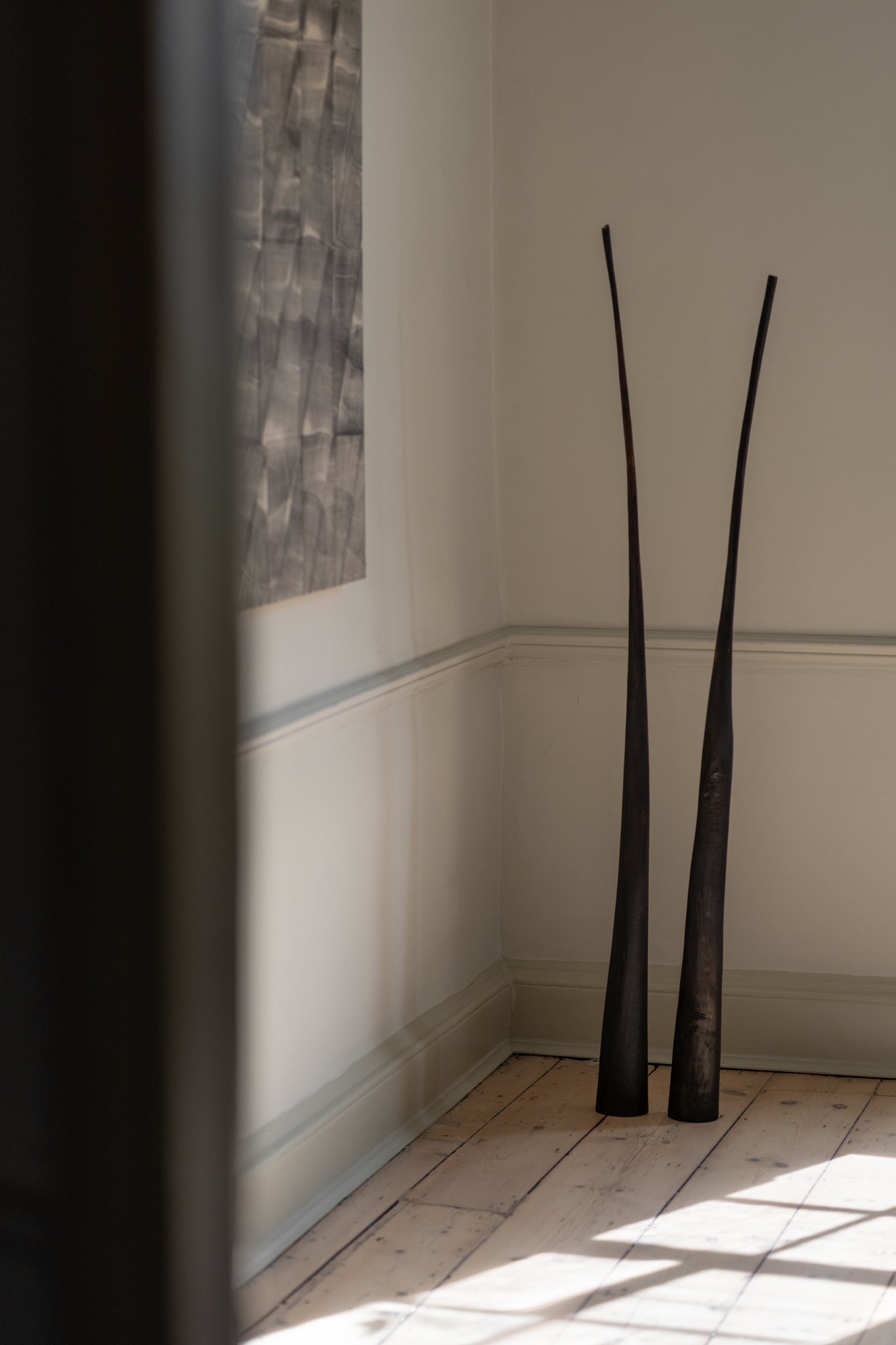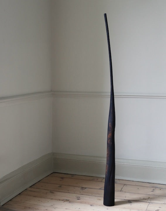 This conical wooden sculpture gracefully stretches upwards, evoking natural forms such as a sprouting plant. While large in scale, this piece seems to defy gravity with its elegant arch. Titled “Muluvenice” from the Etruscan word meaning "(has been) dedicated to” this series draws inspiration from the dark Underworlds of the ancient cultures (from Etruscans and other Italic populations, to even earlier pre-neolithic cultures) and their desire to elevate their prayers to the heavens, hence dark textured surfaces, red stains and long necks pointing skywards.
