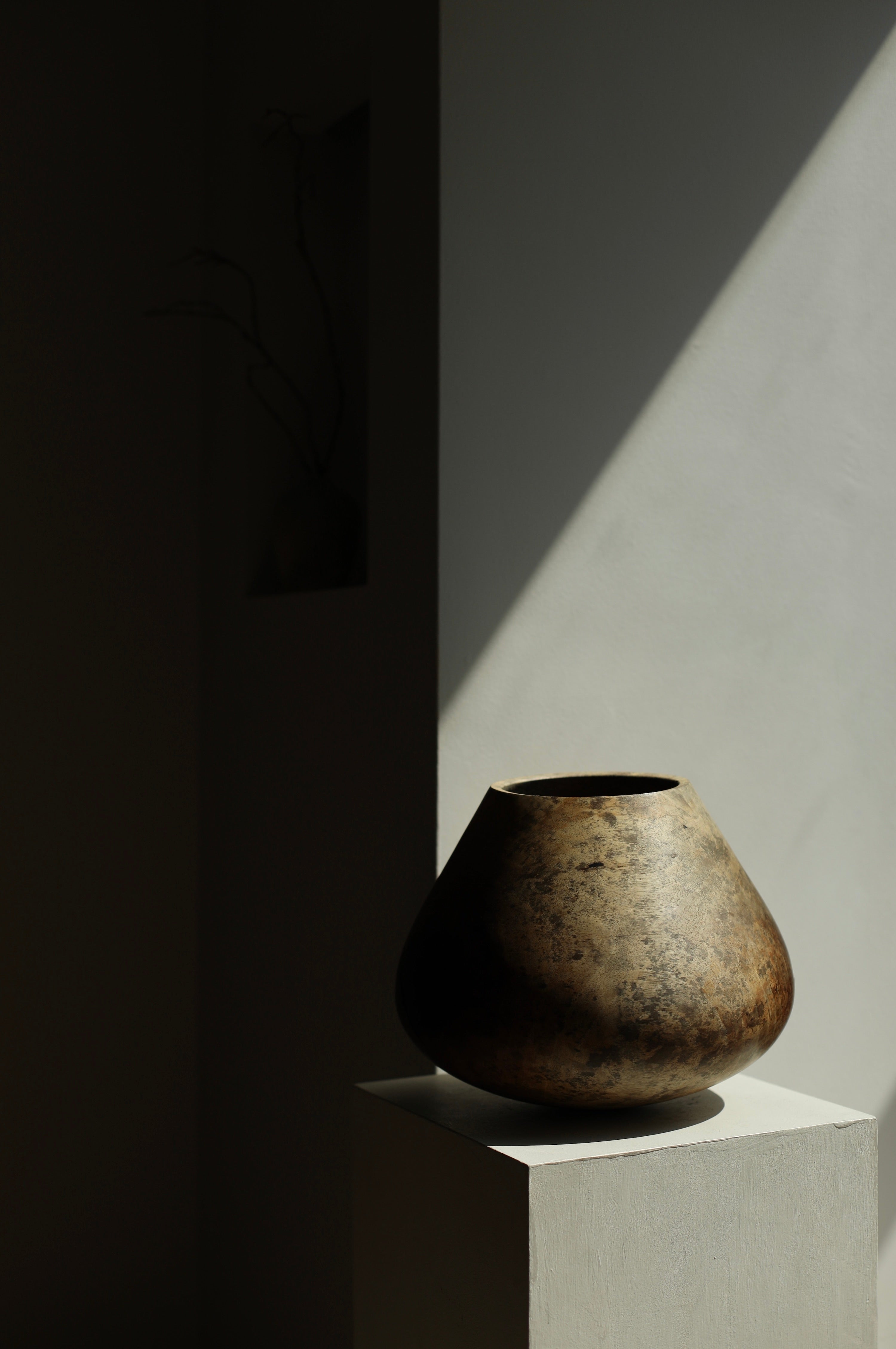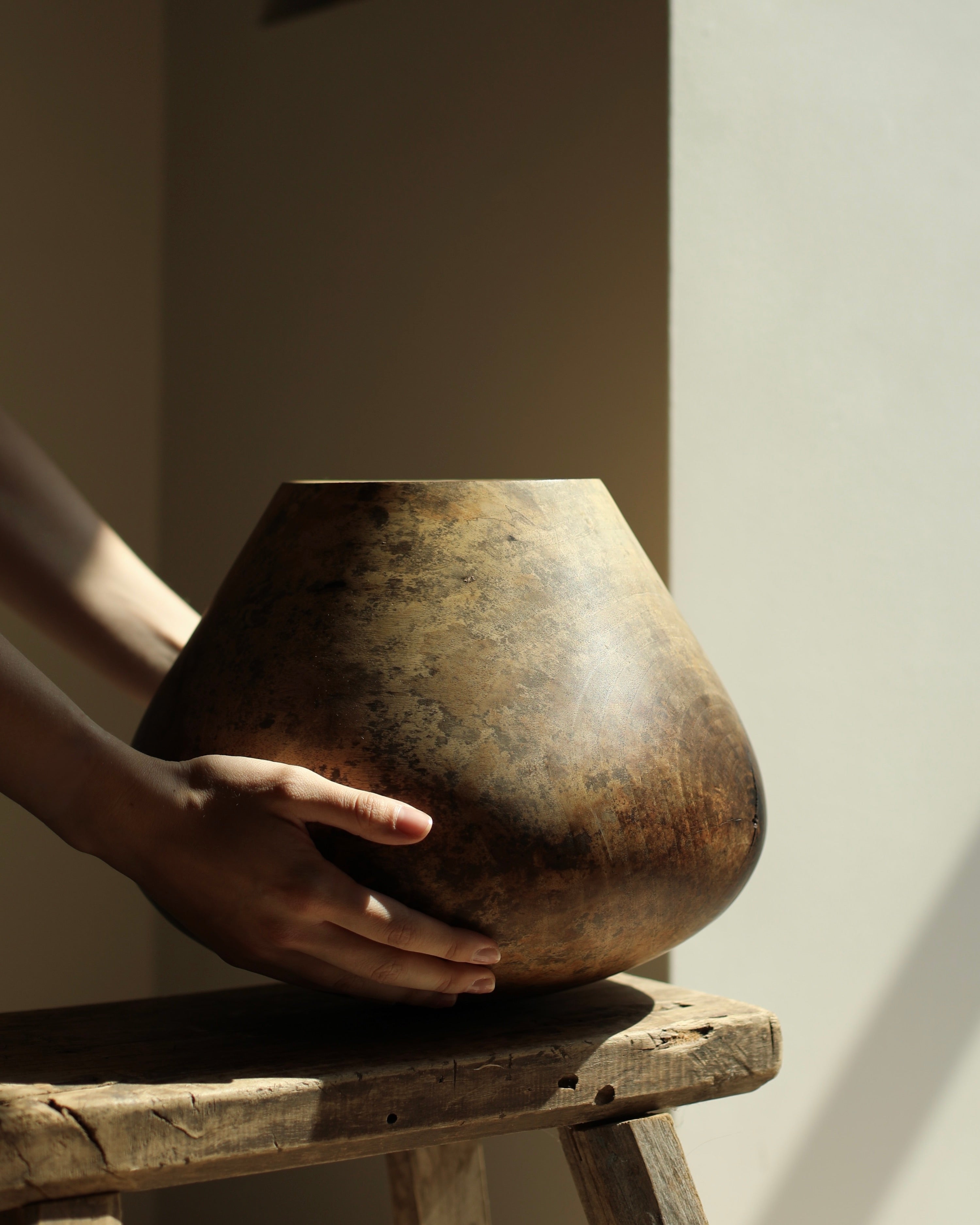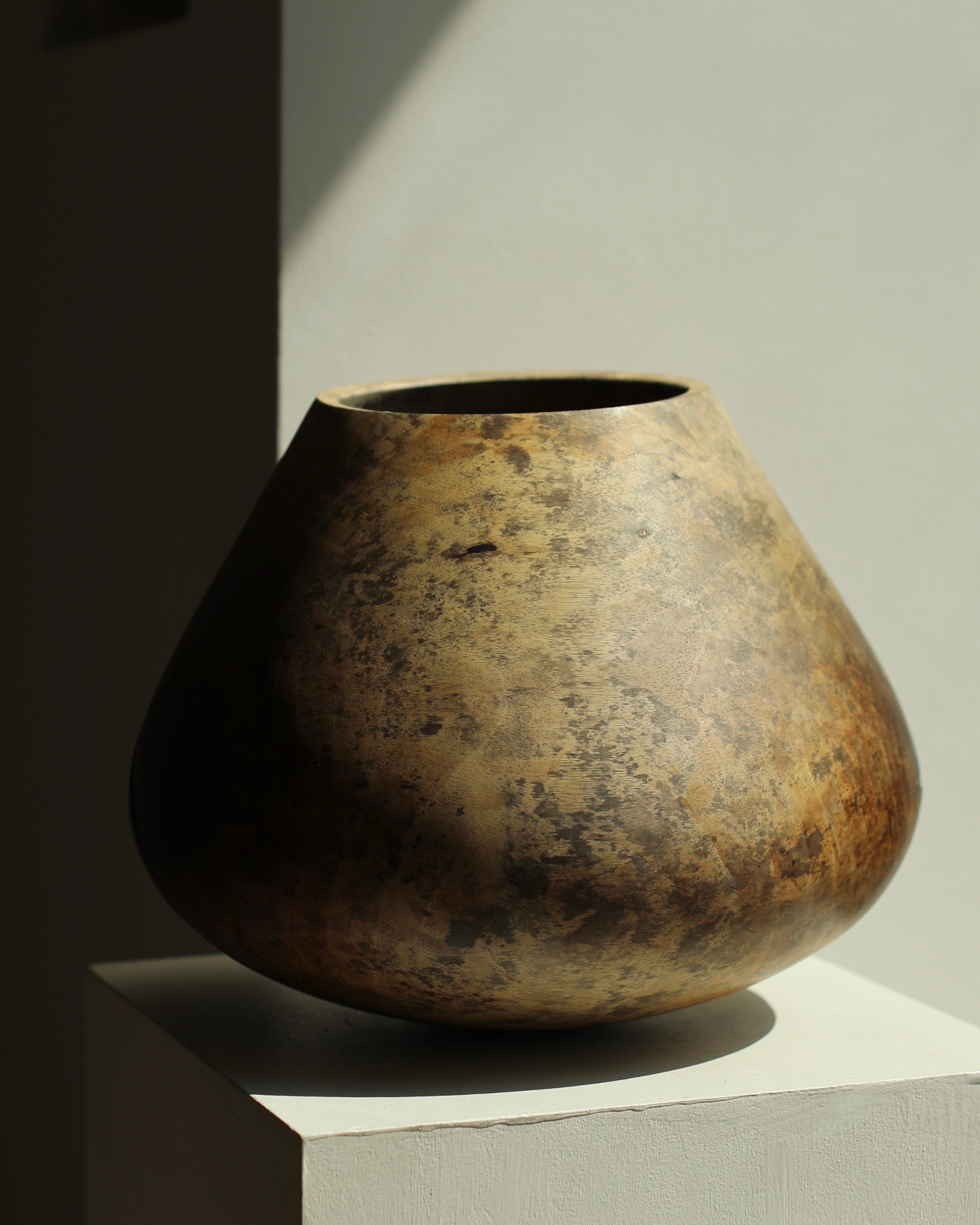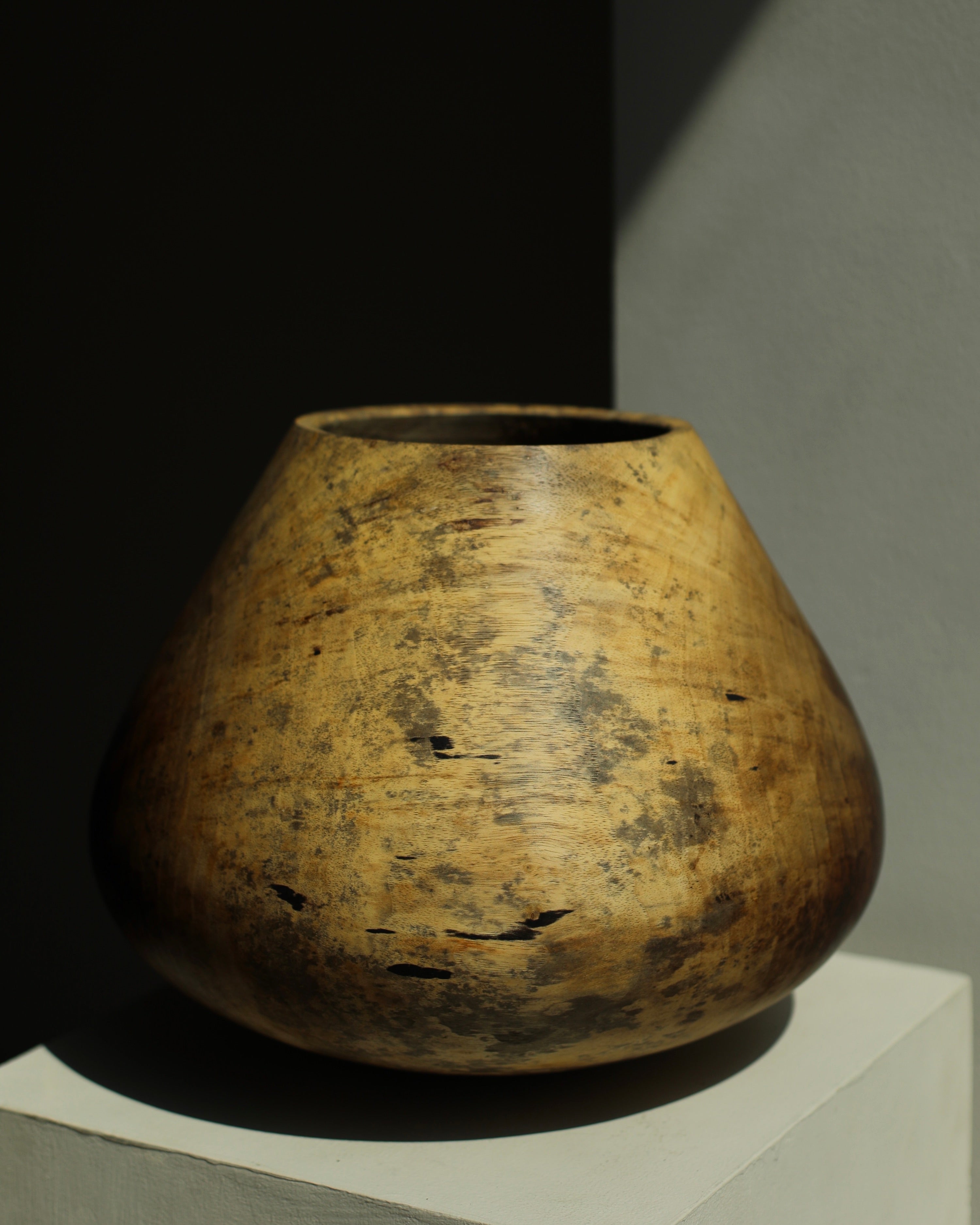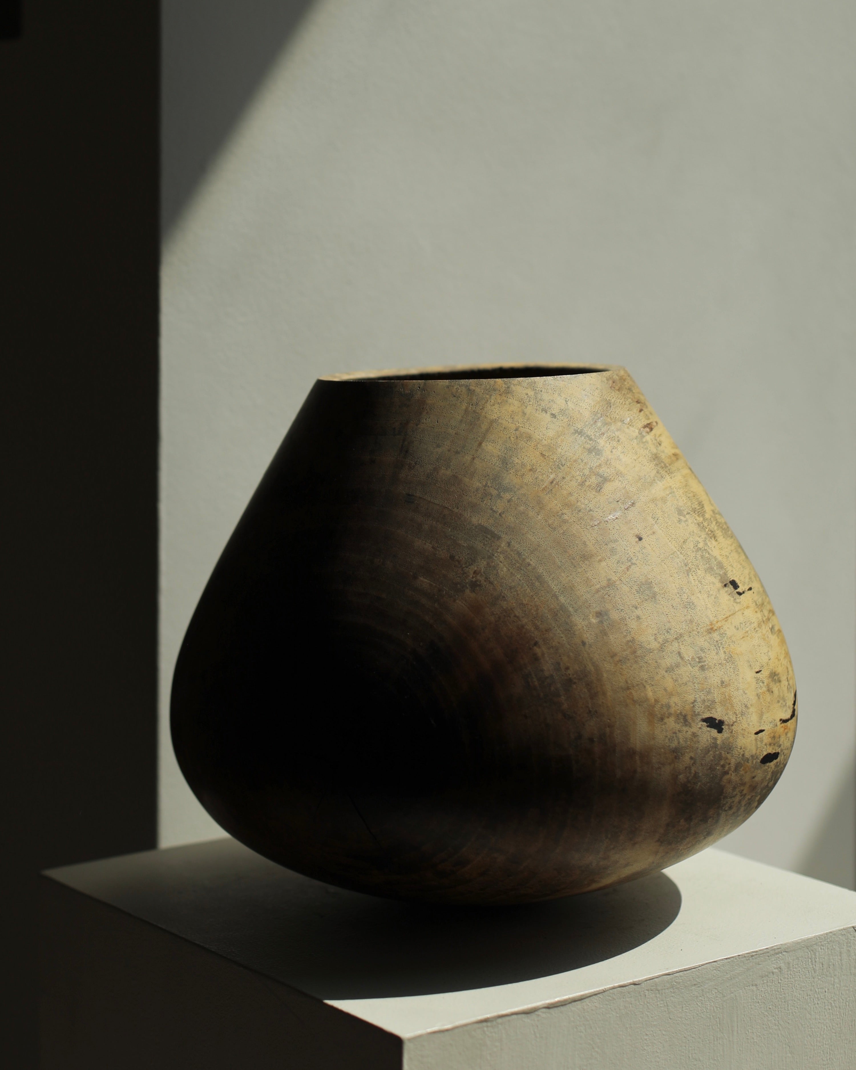 Method: Wood is hollowed out at the lathe, buried underground for 2-6 weeks with plats, ashes, acids and other elements. Once they are extracted, they are washed, sanded, sandblasted, bleached and partly finished with beeswax. As the process is complex, the artist decides which steps to skip depending on the character of each vessel after its burial.
