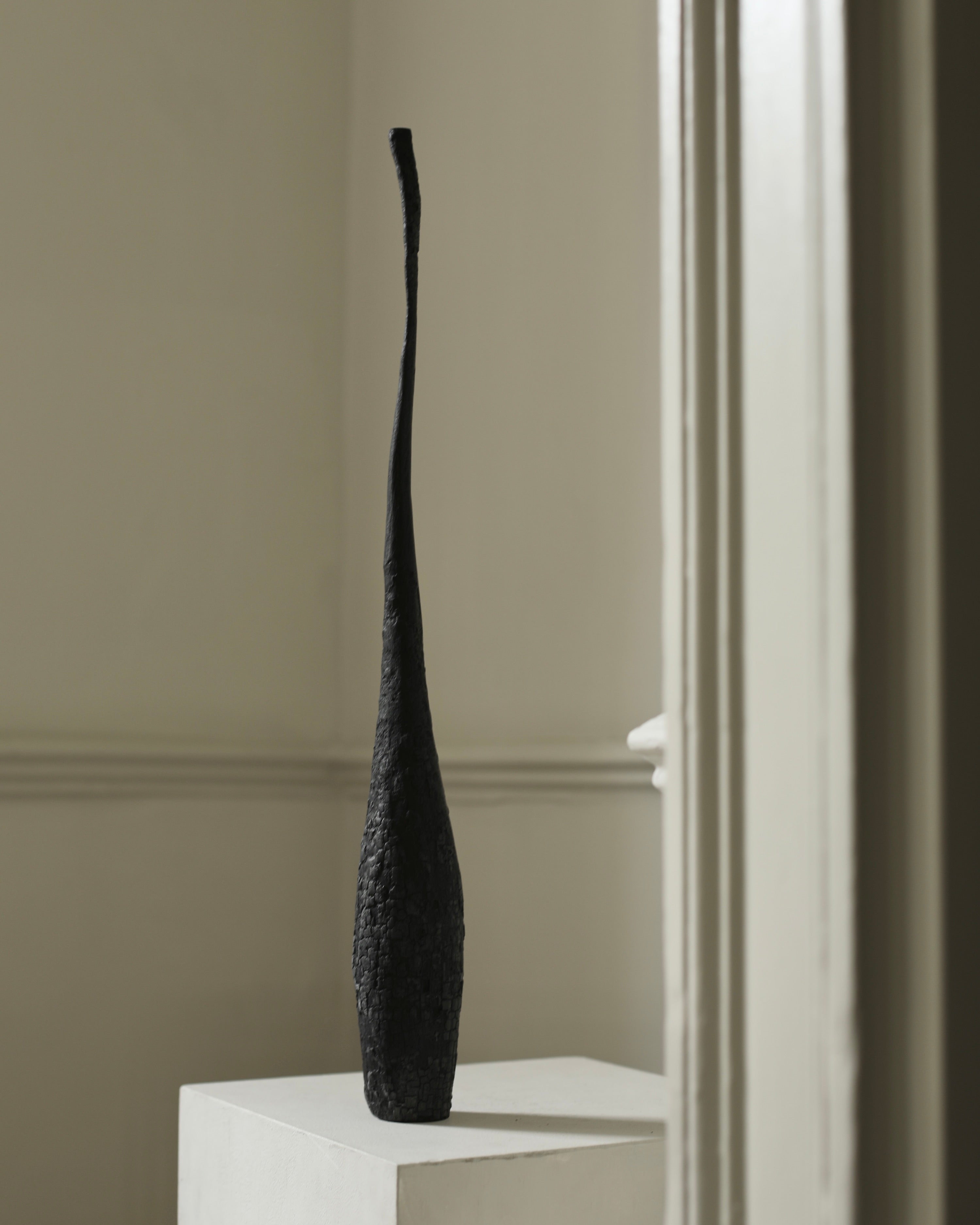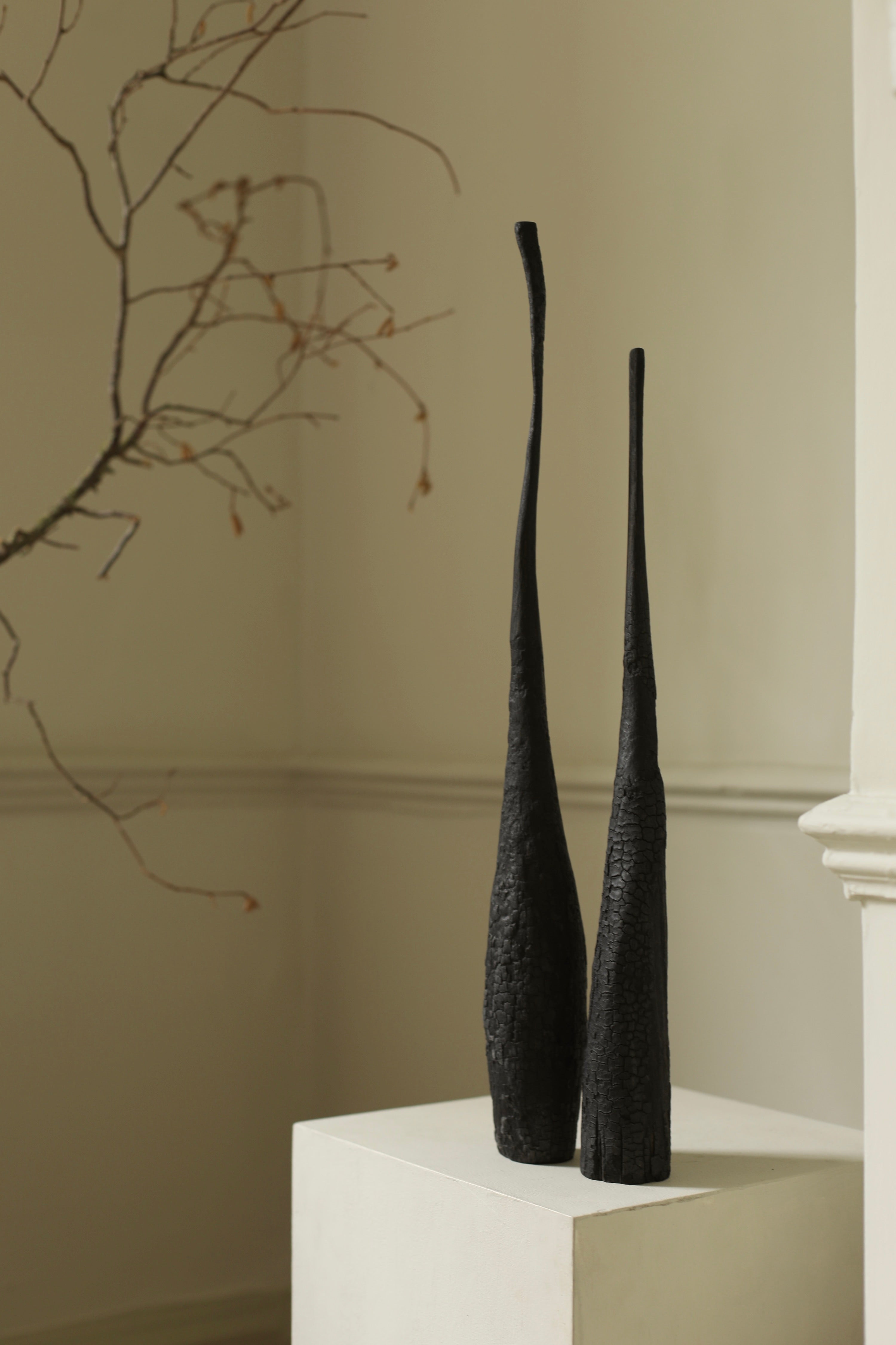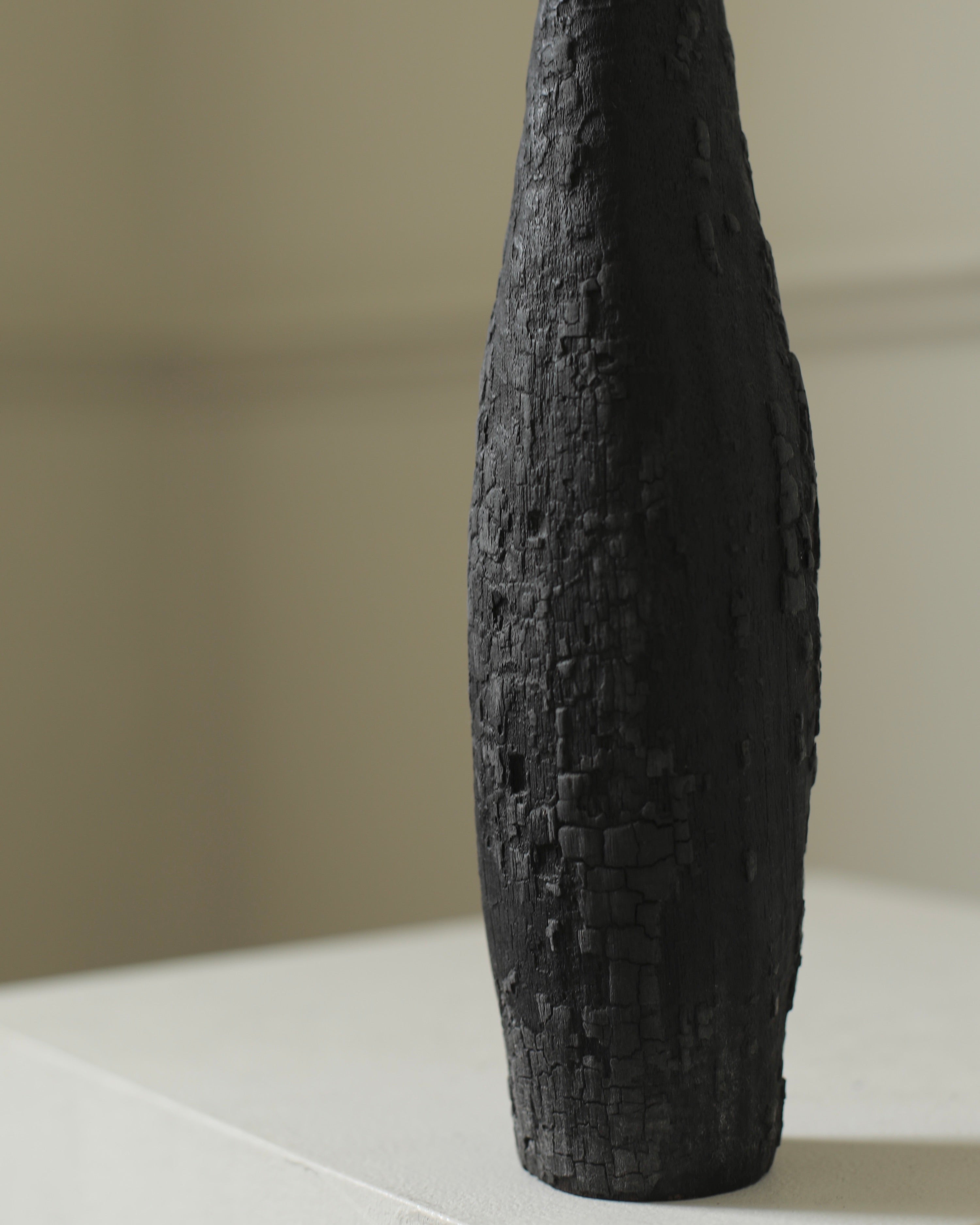 Engaging themes of destruction and transformation, Ferona is a series of charred wooden sculptures marked by burned, ashy surfaces. The wood appears fractured and brittle, partially consumed by fire, suggesting both decay and endurance. Named Ferona, these works carry a sense of sacred ruin. Here, fire is not only a destructive force but one that gives new meaning to the material, leaving behind forms that feel like remnants of a forgotten ritual. They evoke a distant past that is tactile and reverent.
