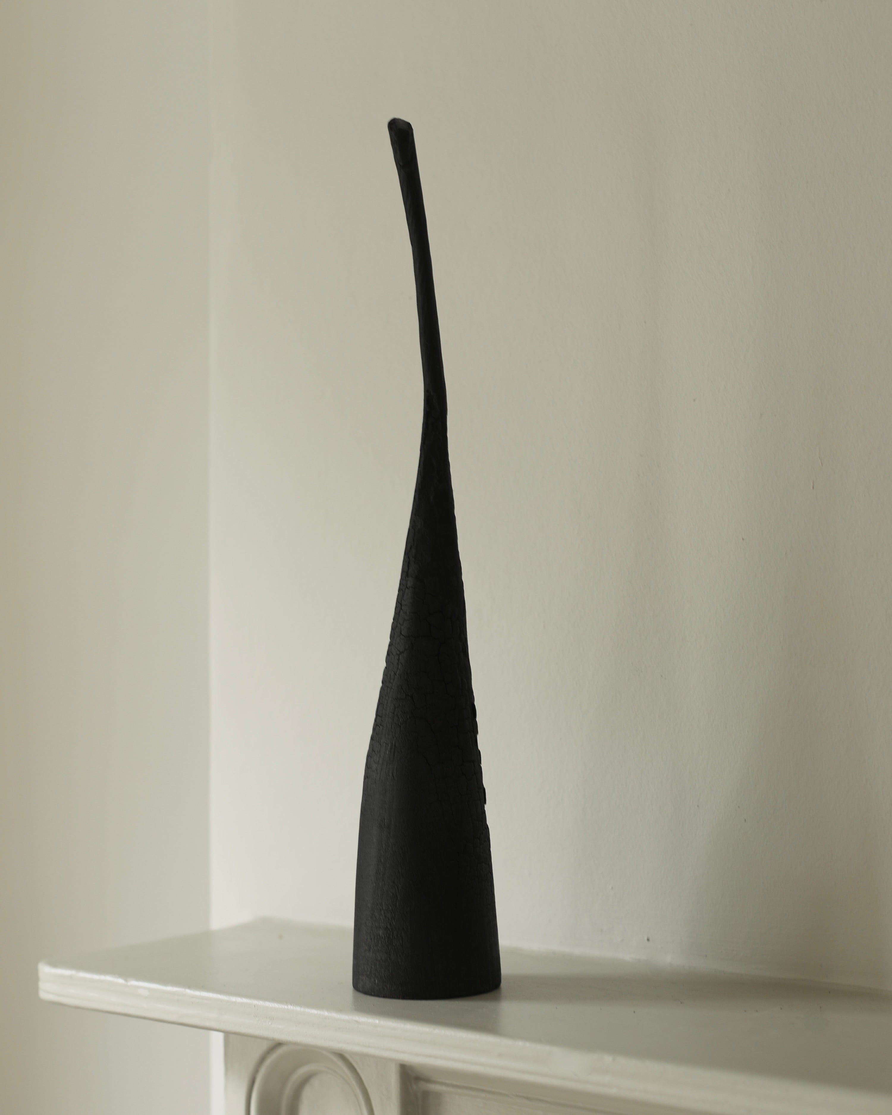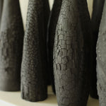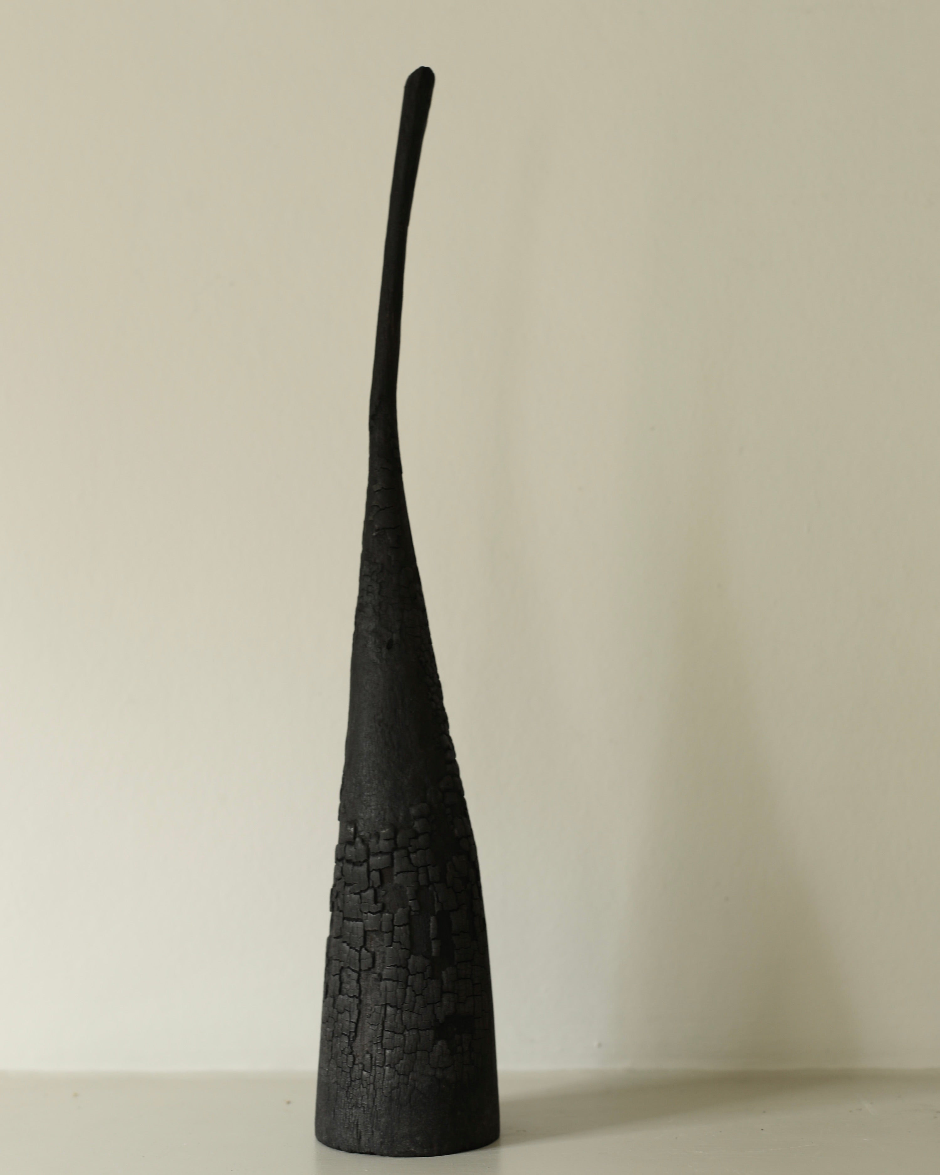 Engaging themes of destruction and transformation, Ferona is a series of charred wooden sculptures marked by burned, ashy surfaces. The wood appears fractured and brittle, partially consumed by fire, suggesting both decay and endurance. Named Ferona, these works carry a sense of sacred ruin. Here, fire is not only a destructive force but one that gives new meaning to the material, leaving behind forms that feel like remnants of a forgotten ritual. They evoke a distant past that is tactile and reverent.