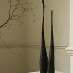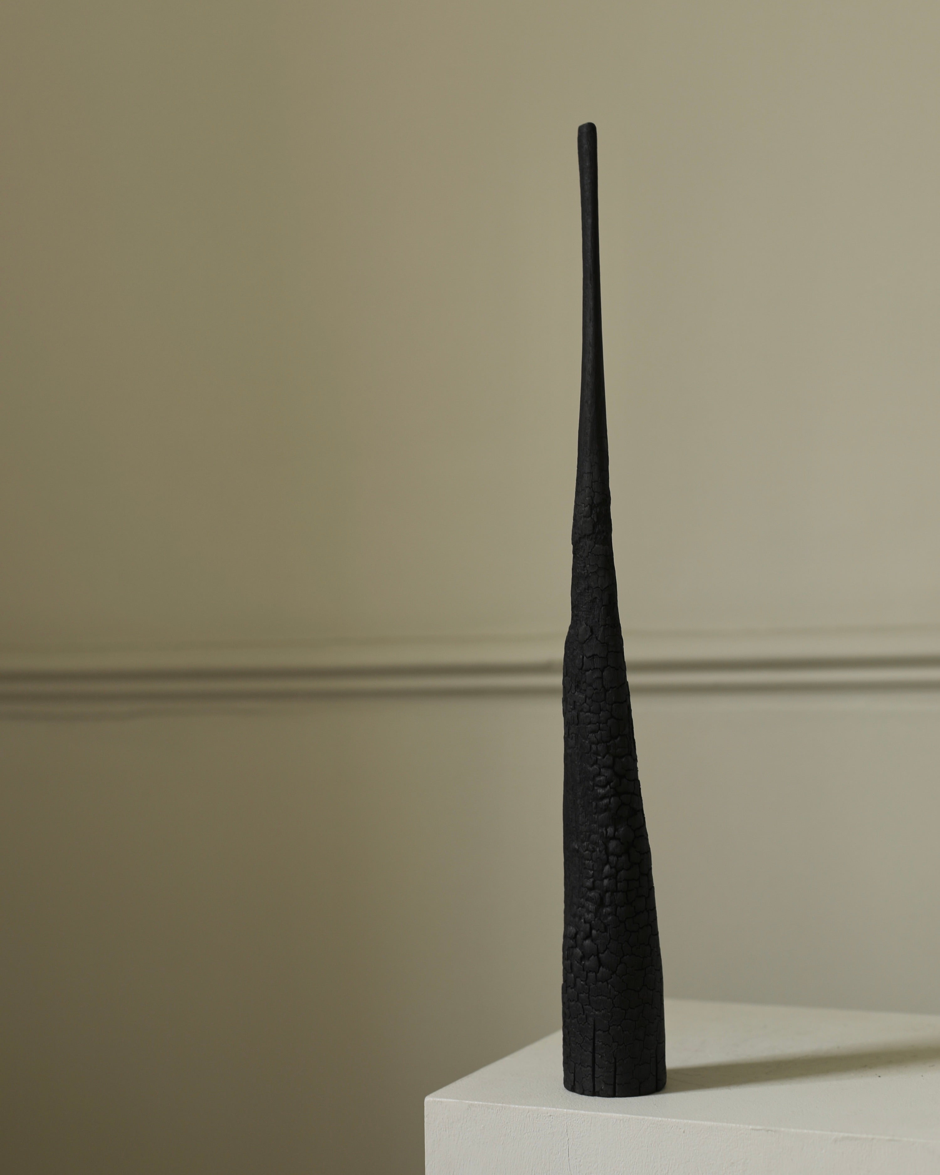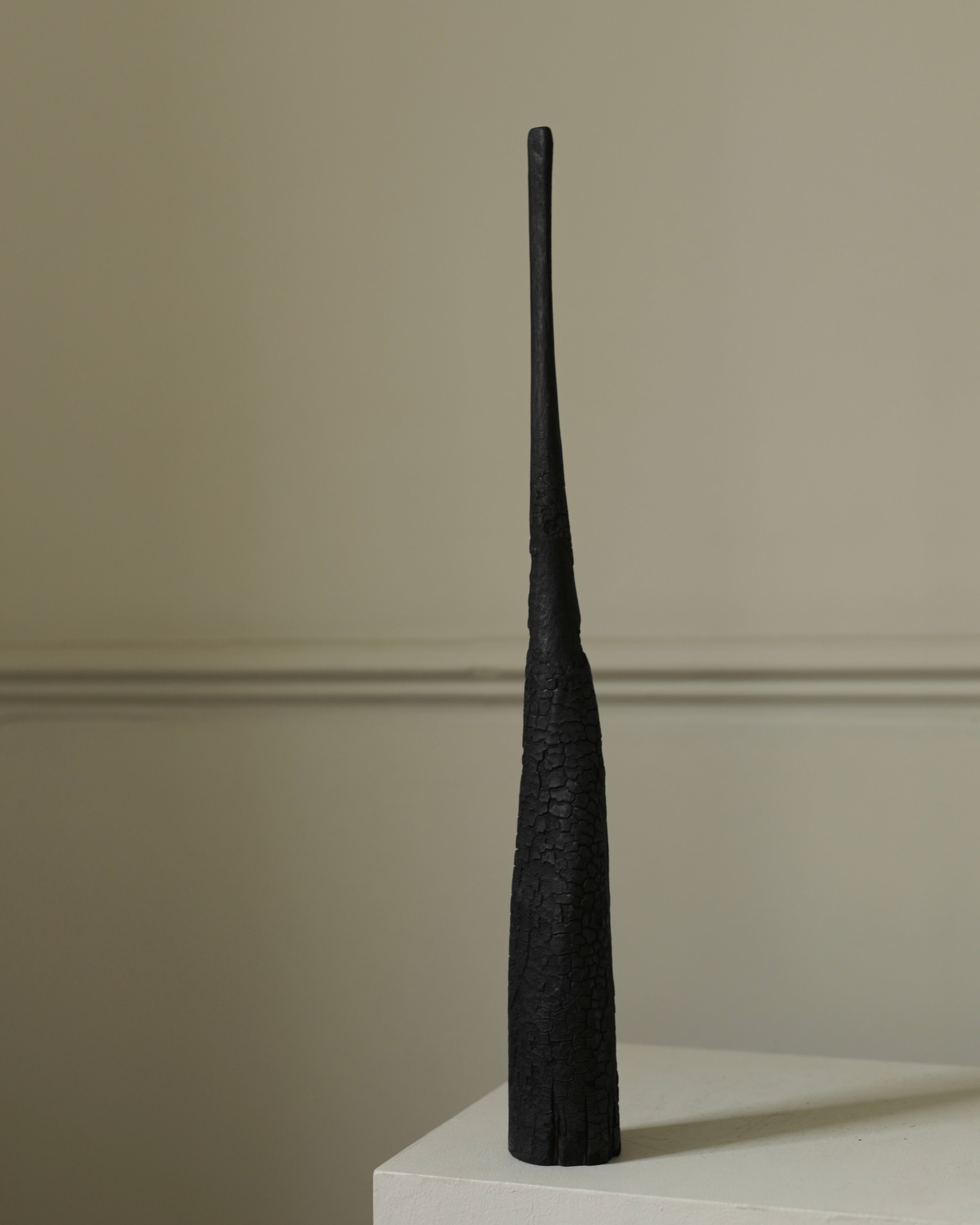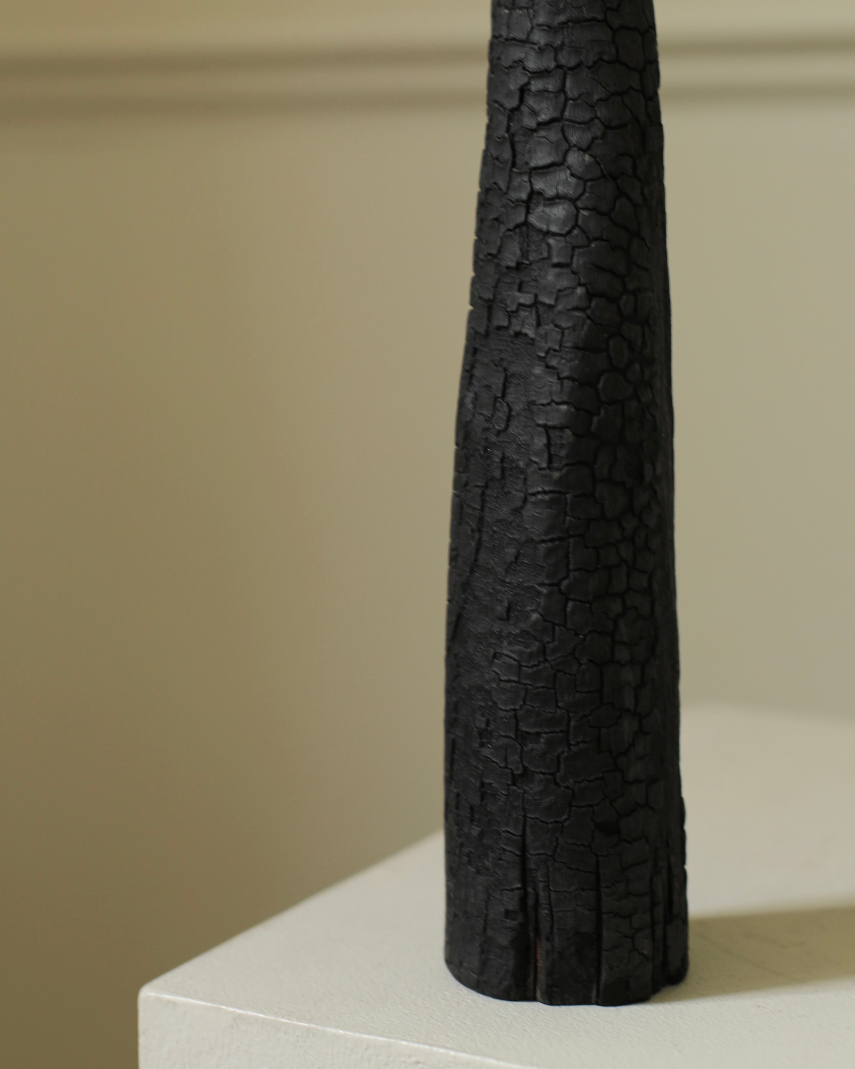 Engaging themes of destruction and transformation, Ferona is a series of charred wooden sculptures marked by burned, ashy surfaces. The wood appears fractured and brittle, partially consumed by fire, suggesting both decay and endurance. Named Ferona, these works carry a sense of sacred ruin. Here, fire is not only a destructive force but one that gives new meaning to the material, leaving behind forms that feel like remnants of a forgotten ritual. They evoke a distant past that is tactile and reverent.