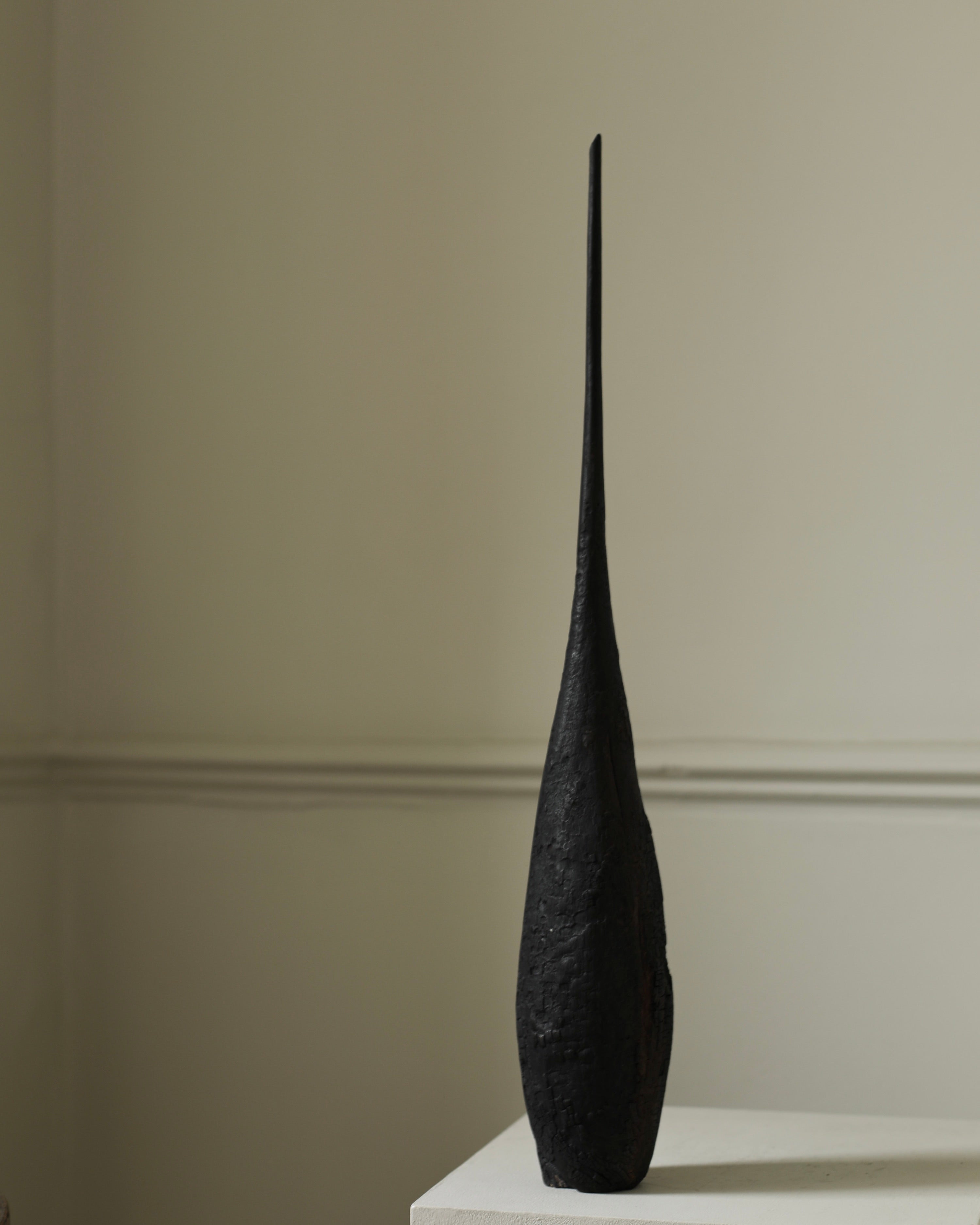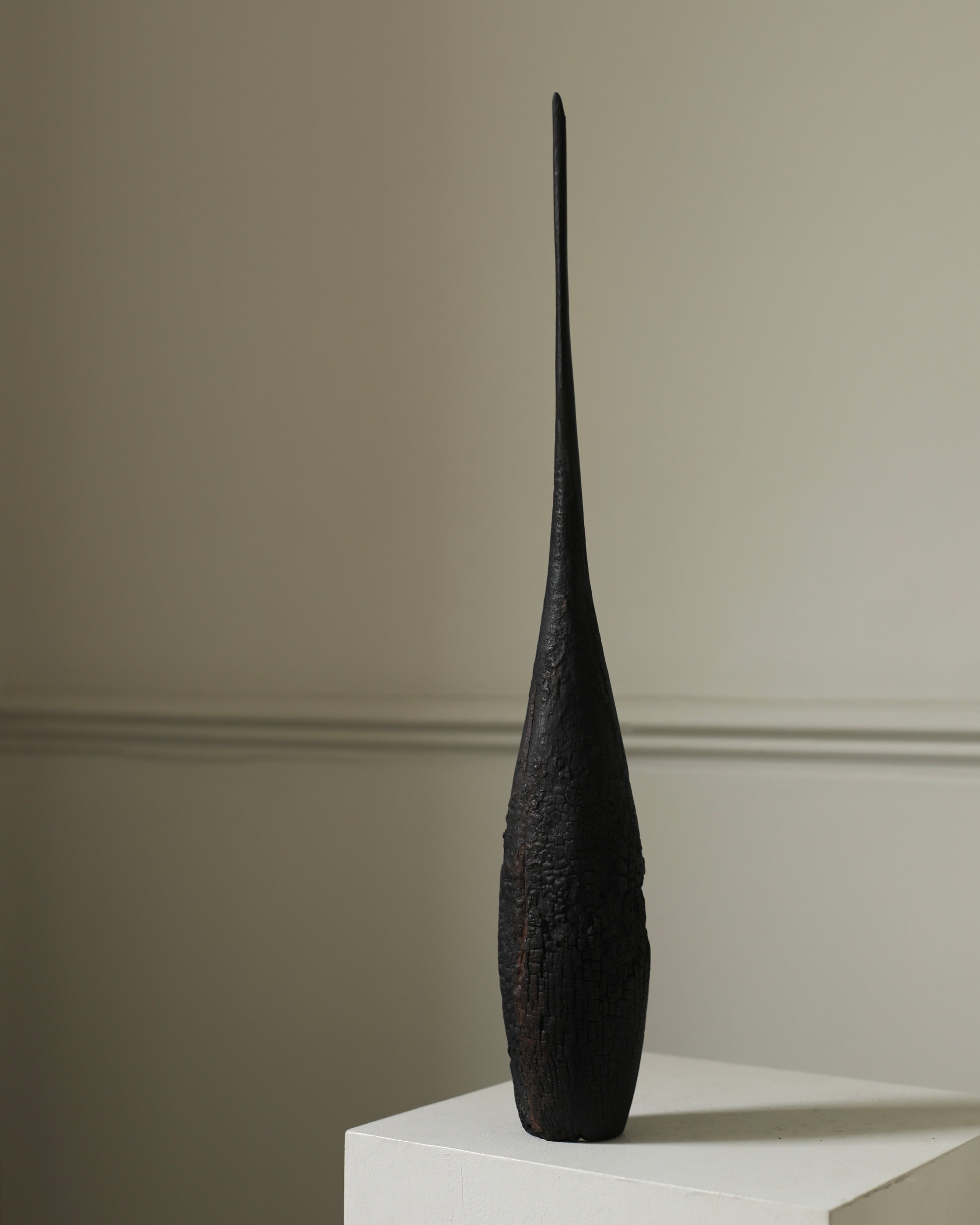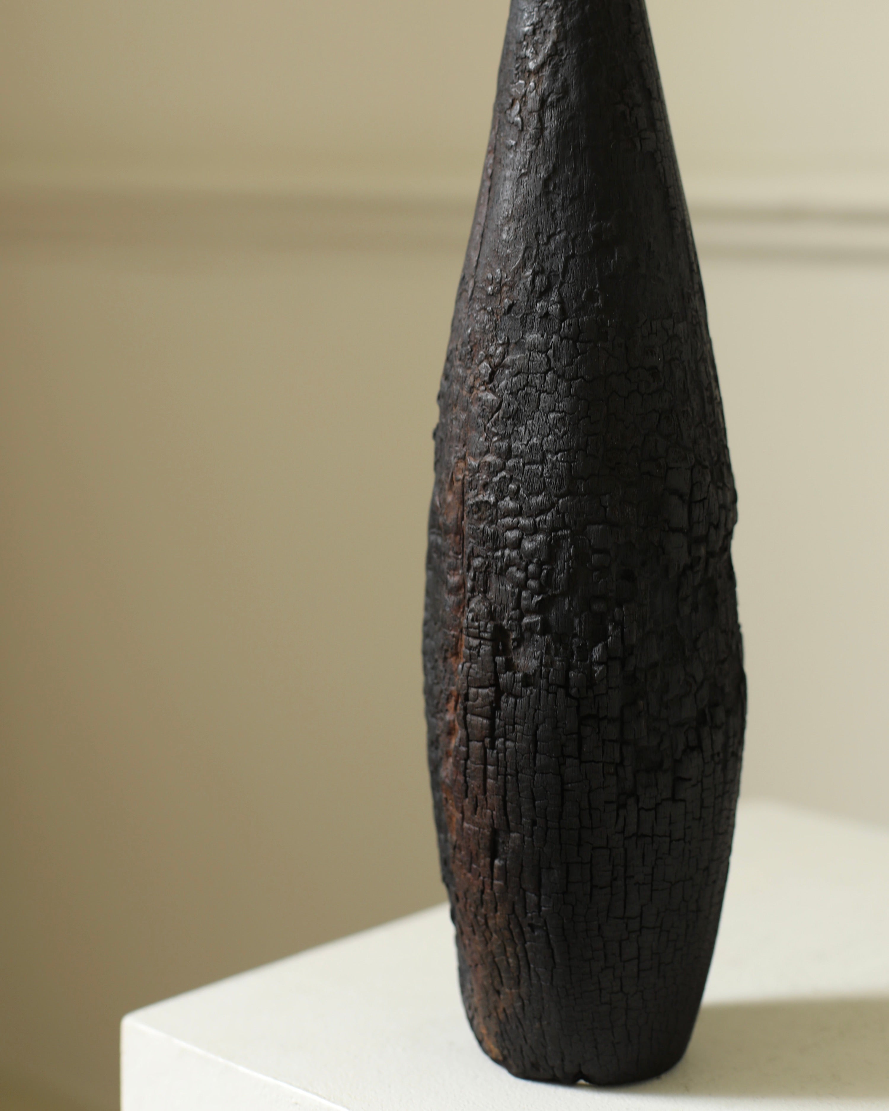 Engaging themes of destruction and transformation, Ferona is a series of charred wooden sculptures marked by burned, ashy surfaces. The wood appears fractured and brittle, partially consumed by fire, suggesting both decay and endurance. Named Ferona, these works carry a sense of sacred ruin. Here, fire is not only a destructive force but one that gives new meaning to the material, leaving behind forms that feel like remnants of a forgotten ritual. They evoke a distant past that is tactile and reverent.