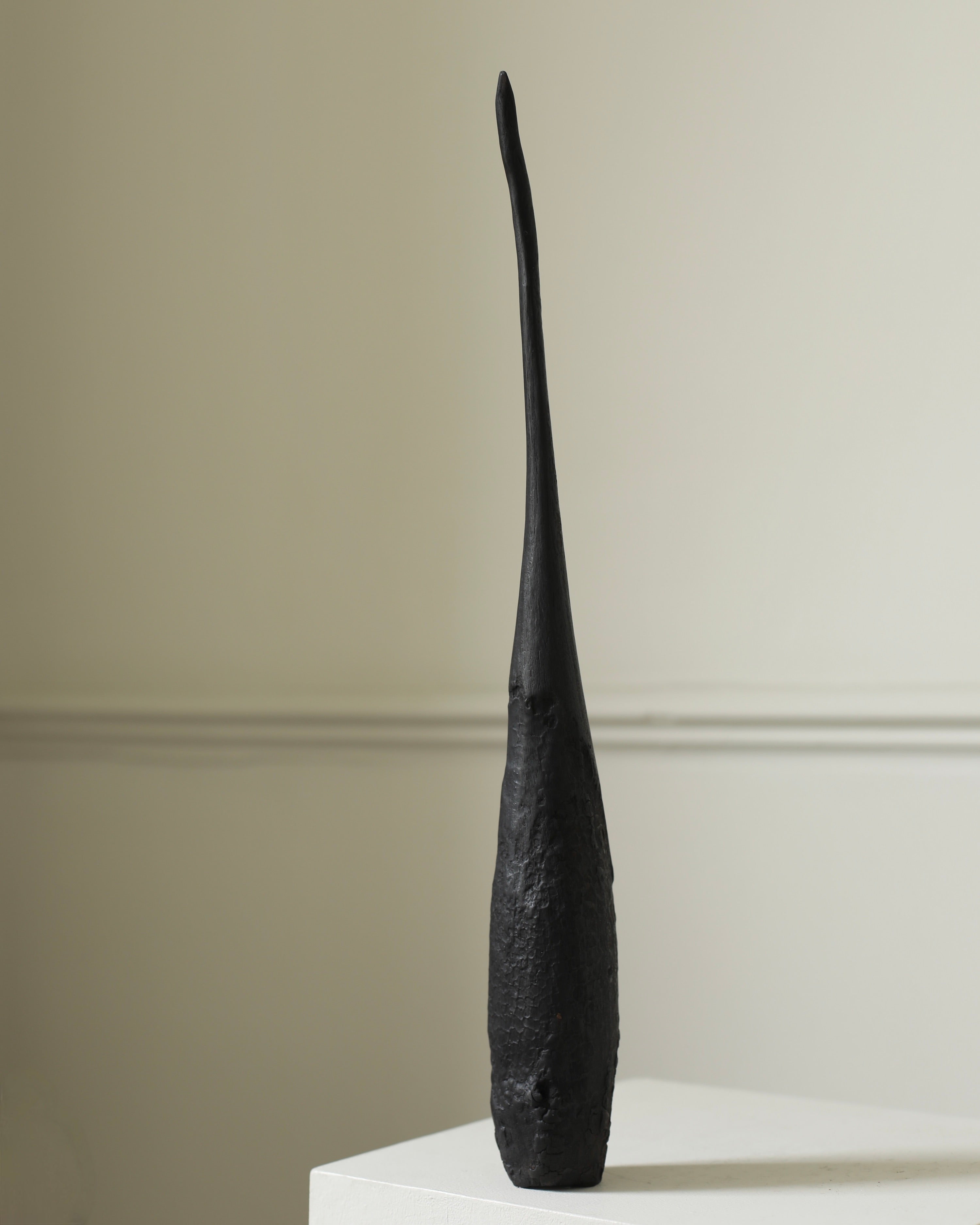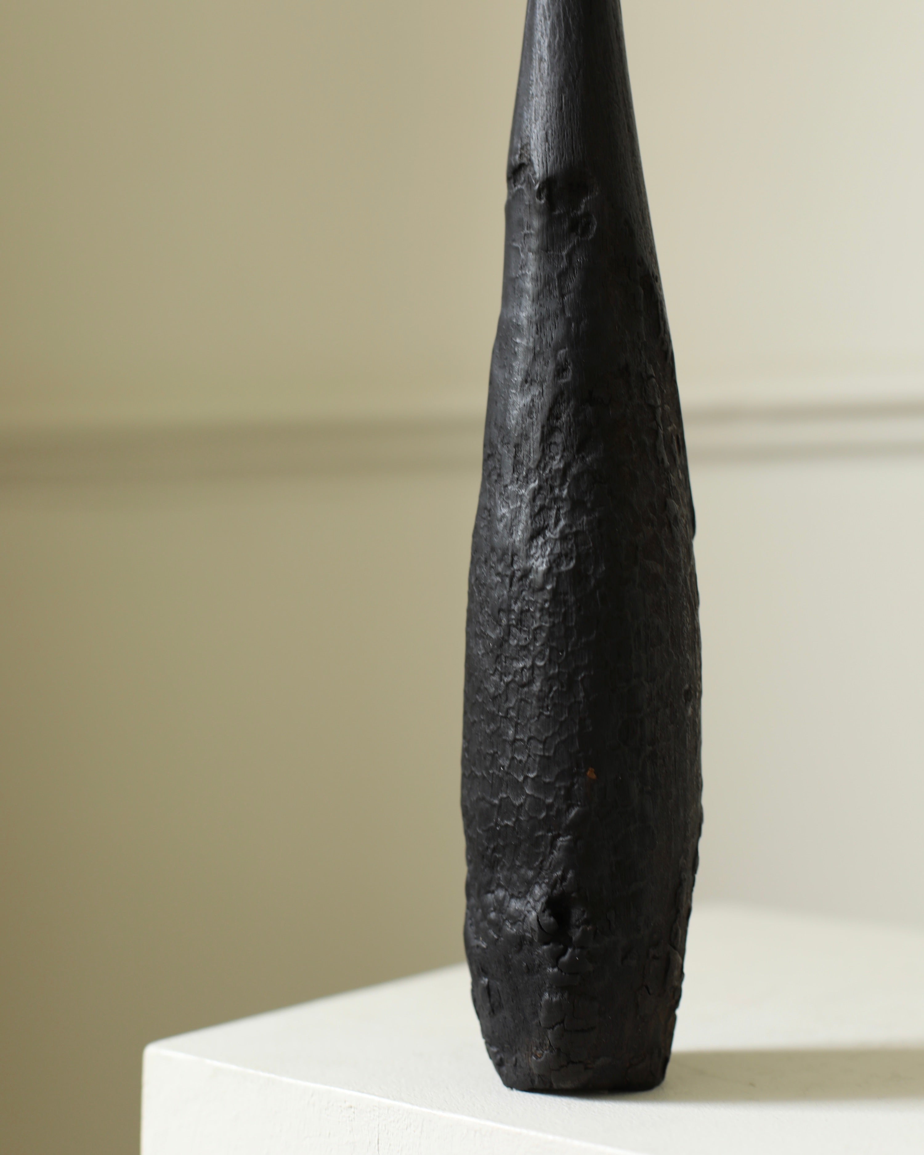 Engaging themes of destruction and transformation, Ferona is a series of charred wooden sculptures marked by burned, ashy surfaces. The wood appears fractured and brittle, partially consumed by fire, suggesting both decay and endurance. Named Ferona, these works carry a sense of sacred ruin. Here, fire is not only a destructive force but one that gives new meaning to the material, leaving behind forms that feel like remnants of a forgotten ritual. They evoke a distant past that is tactile and reverent.