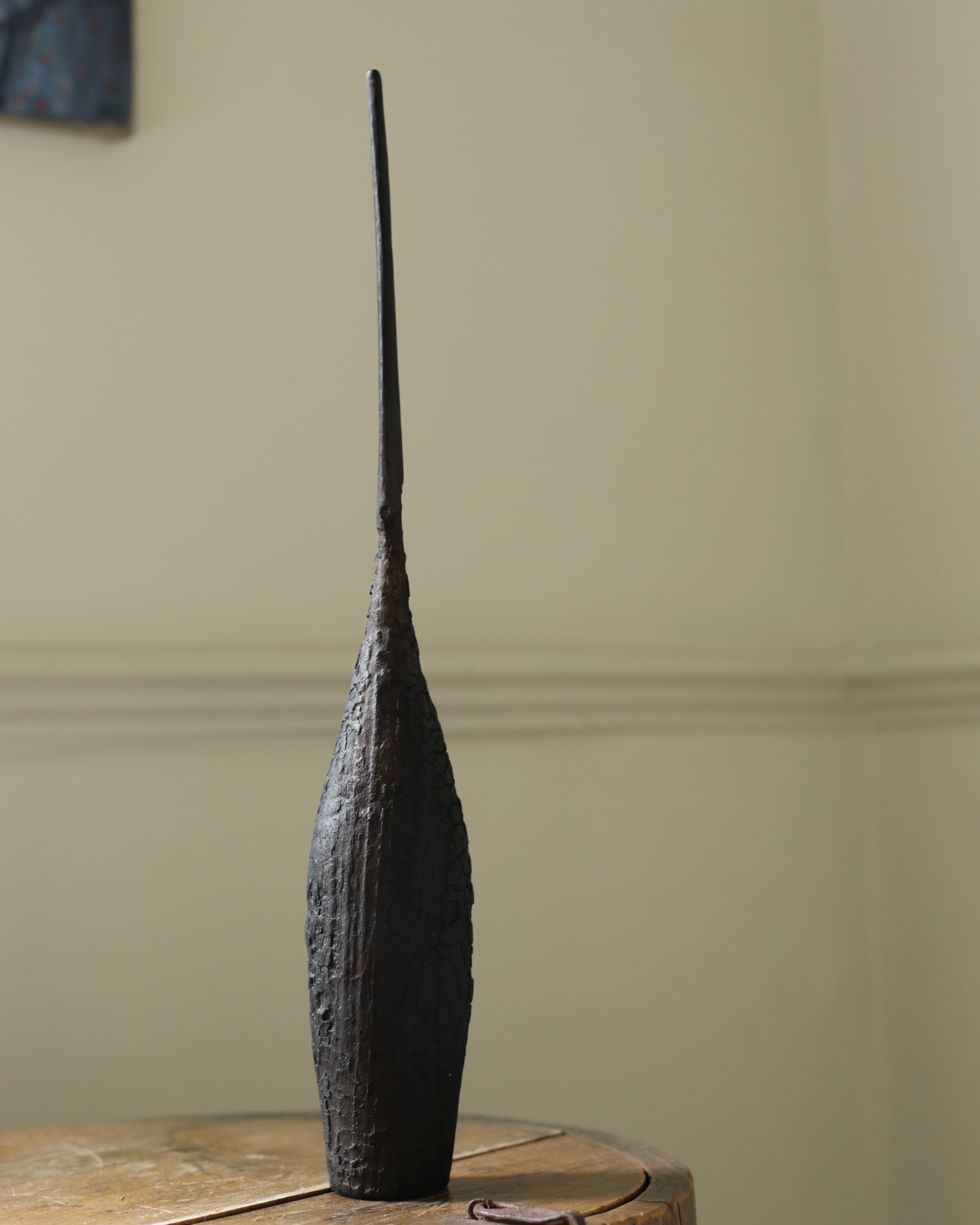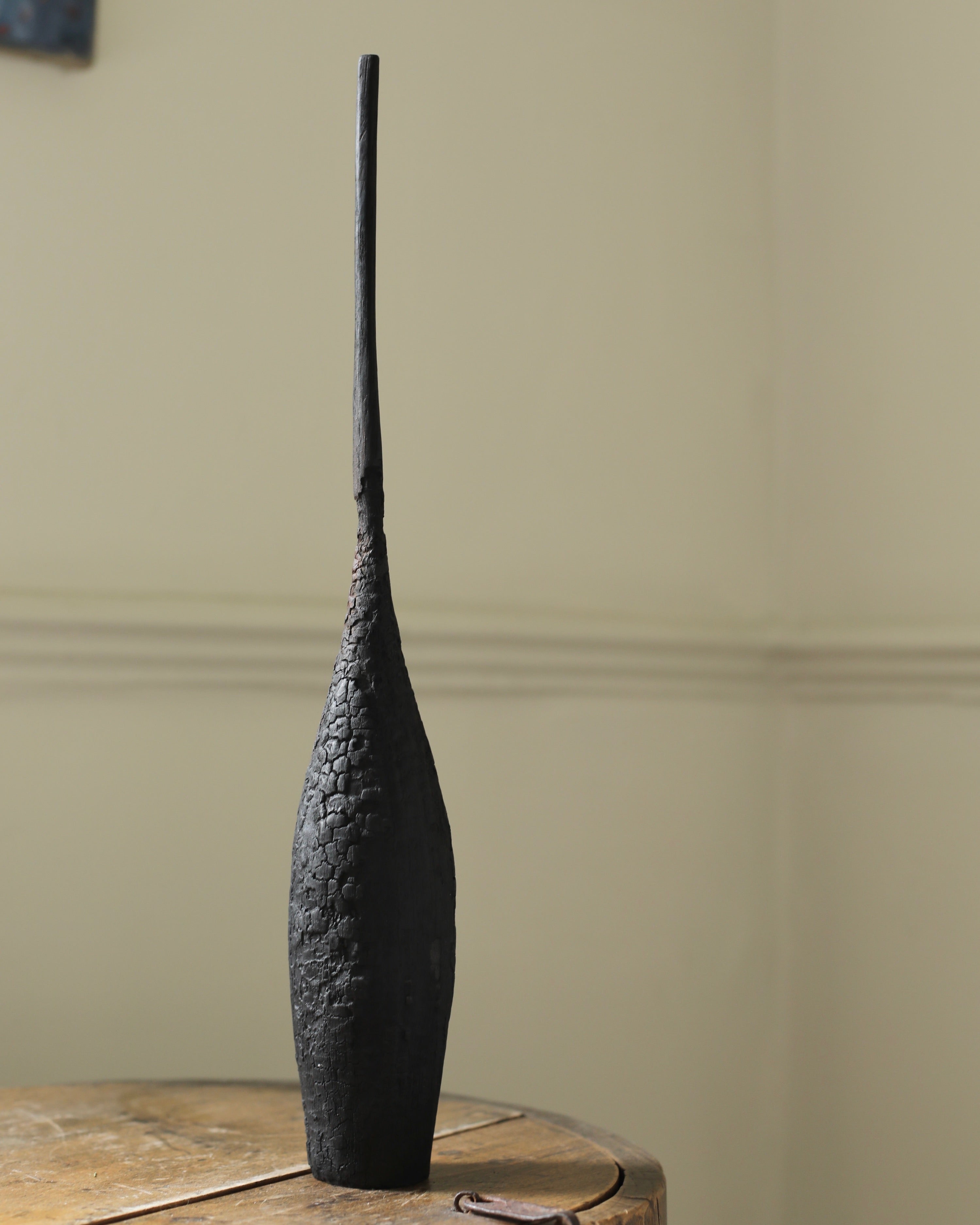 Method: Turned on a lathe and hand carved, the pieces are burnt using fire and compressed air. A compound with an iron base is then added and the pieces are finished using a combination of artist's fixatives, spray varnishes and beeswax and then left outside in the sun for at least 2-3 weeks