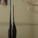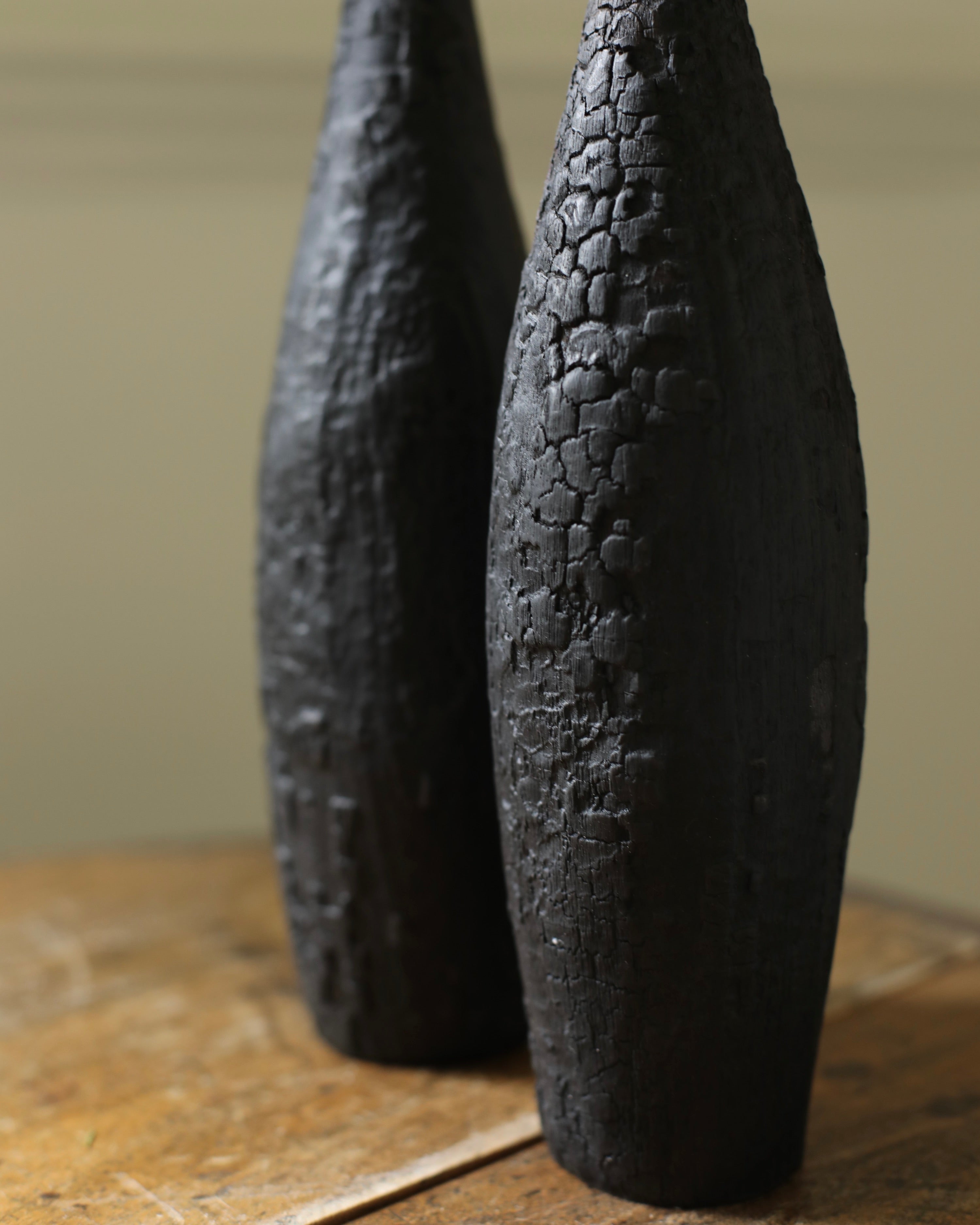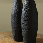 Engaging themes of destruction and transformation, Ferona is a series of charred wooden sculptures marked by burned, ashy surfaces. The wood appears fractured and brittle, partially consumed by fire, suggesting both decay and endurance. Named Ferona, these works carry a sense of sacred ruin. Here, fire is not only a destructive force but one that gives new meaning to the material, leaving behind forms that feel like remnants of a forgotten ritual. They evoke a distant past that is tactile and reverent.