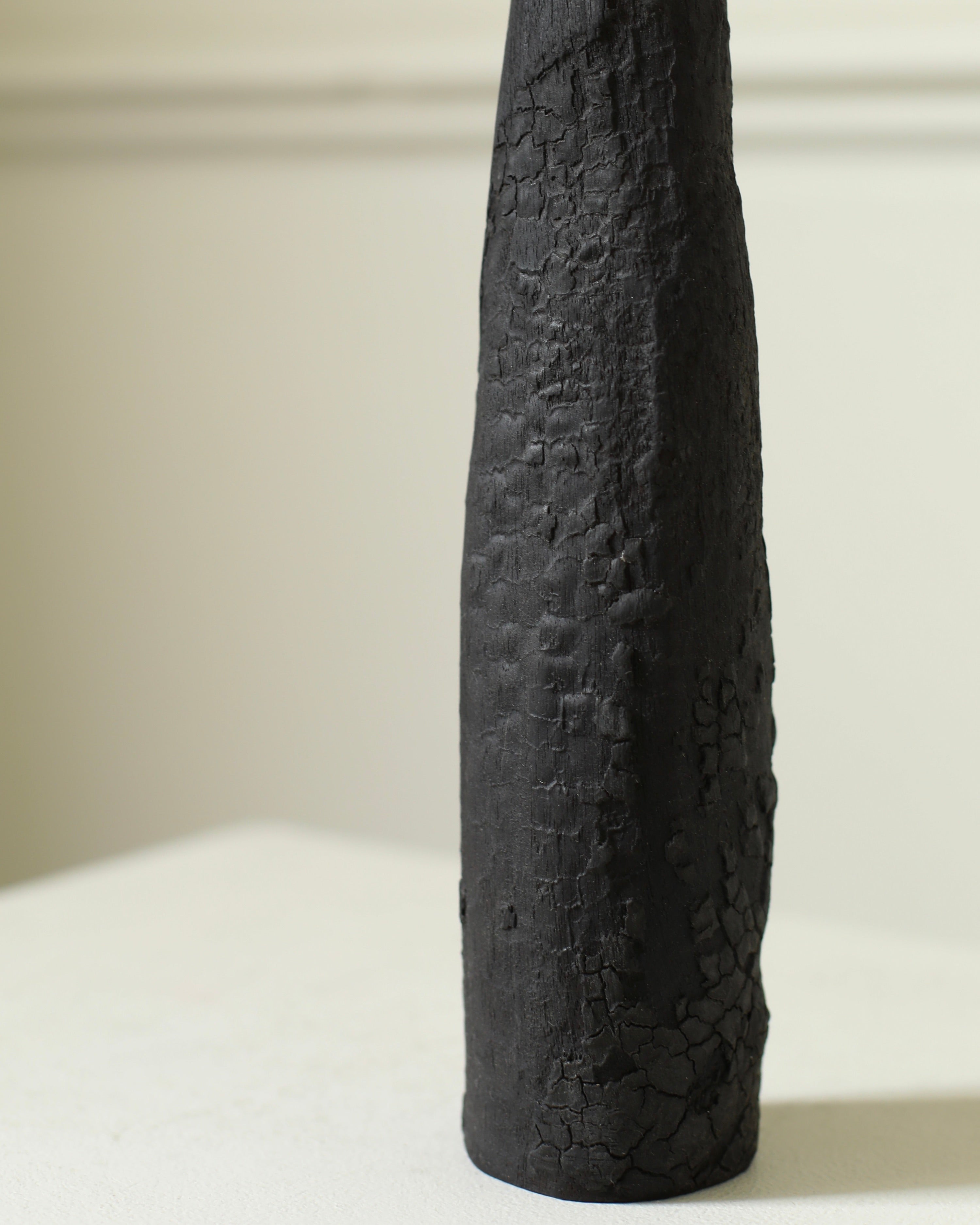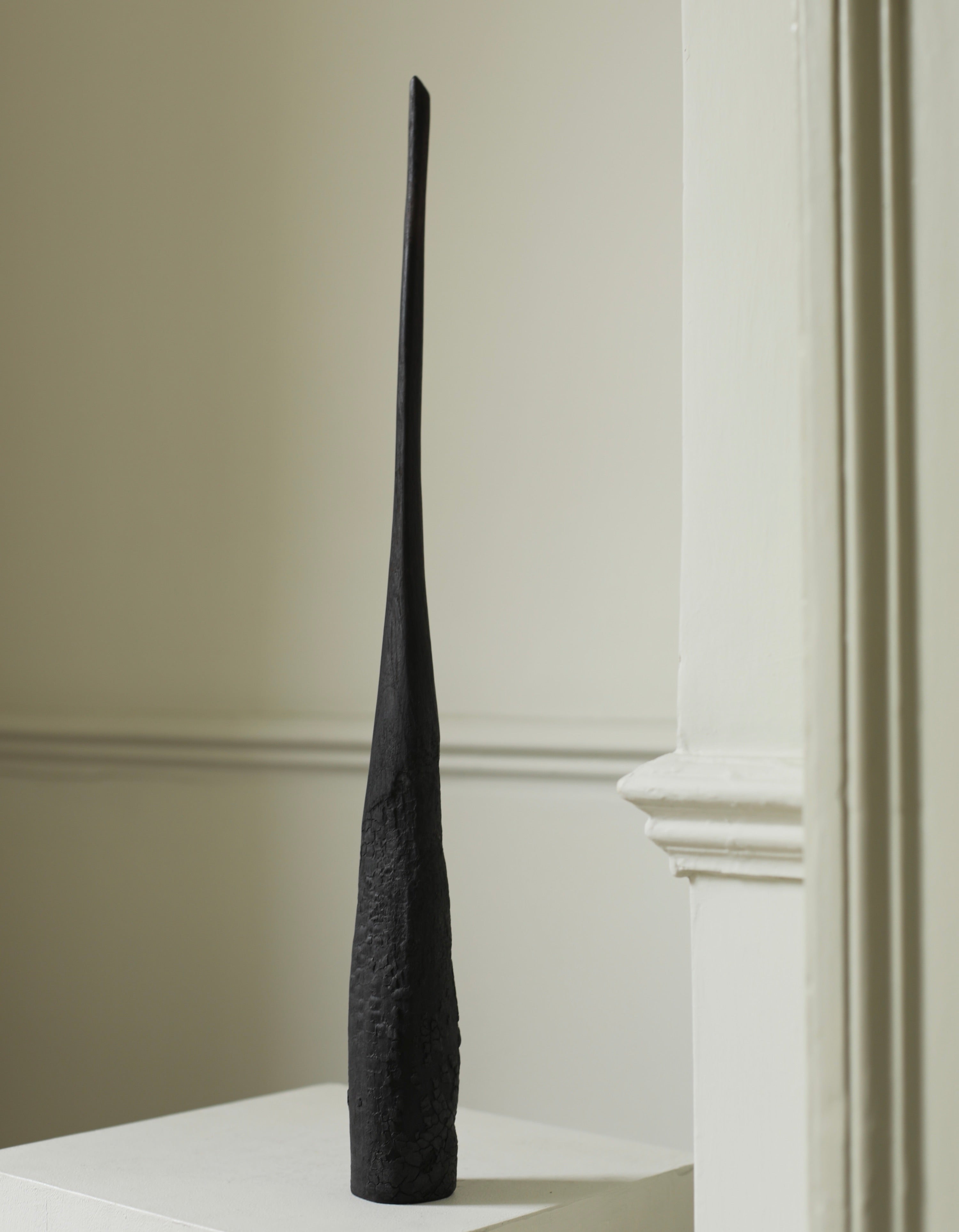 Engaging themes of destruction and transformation, Ferona is a series of charred wooden sculptures marked by burned, ashy surfaces. The wood appears fractured and brittle, partially consumed by fire, suggesting both decay and endurance. Named Ferona, these works carry a sense of sacred ruin. Here, fire is not only a destructive force but one that gives new meaning to the material, leaving behind forms that feel like remnants of a forgotten ritual. They evoke a distant past that is tactile and reverent.