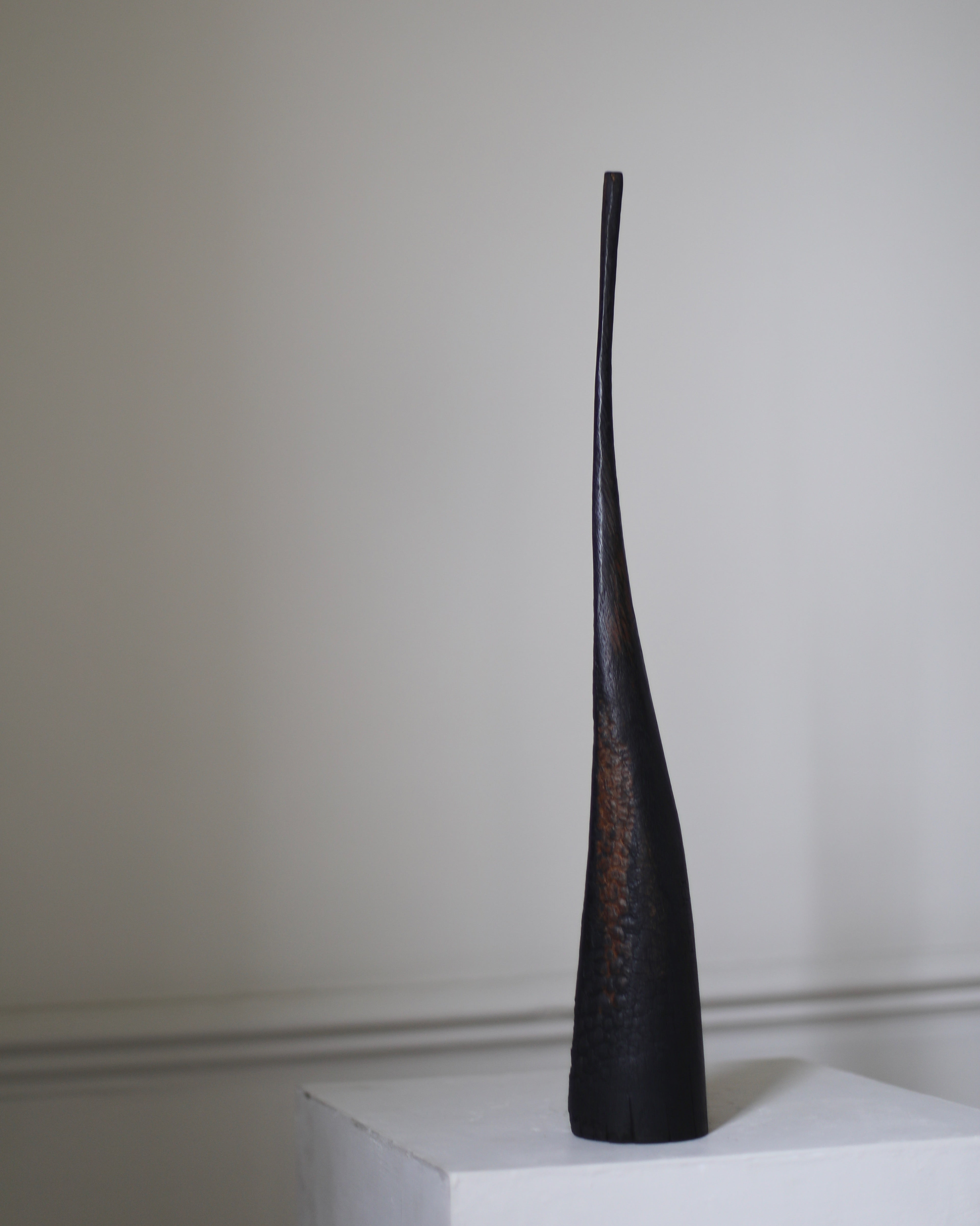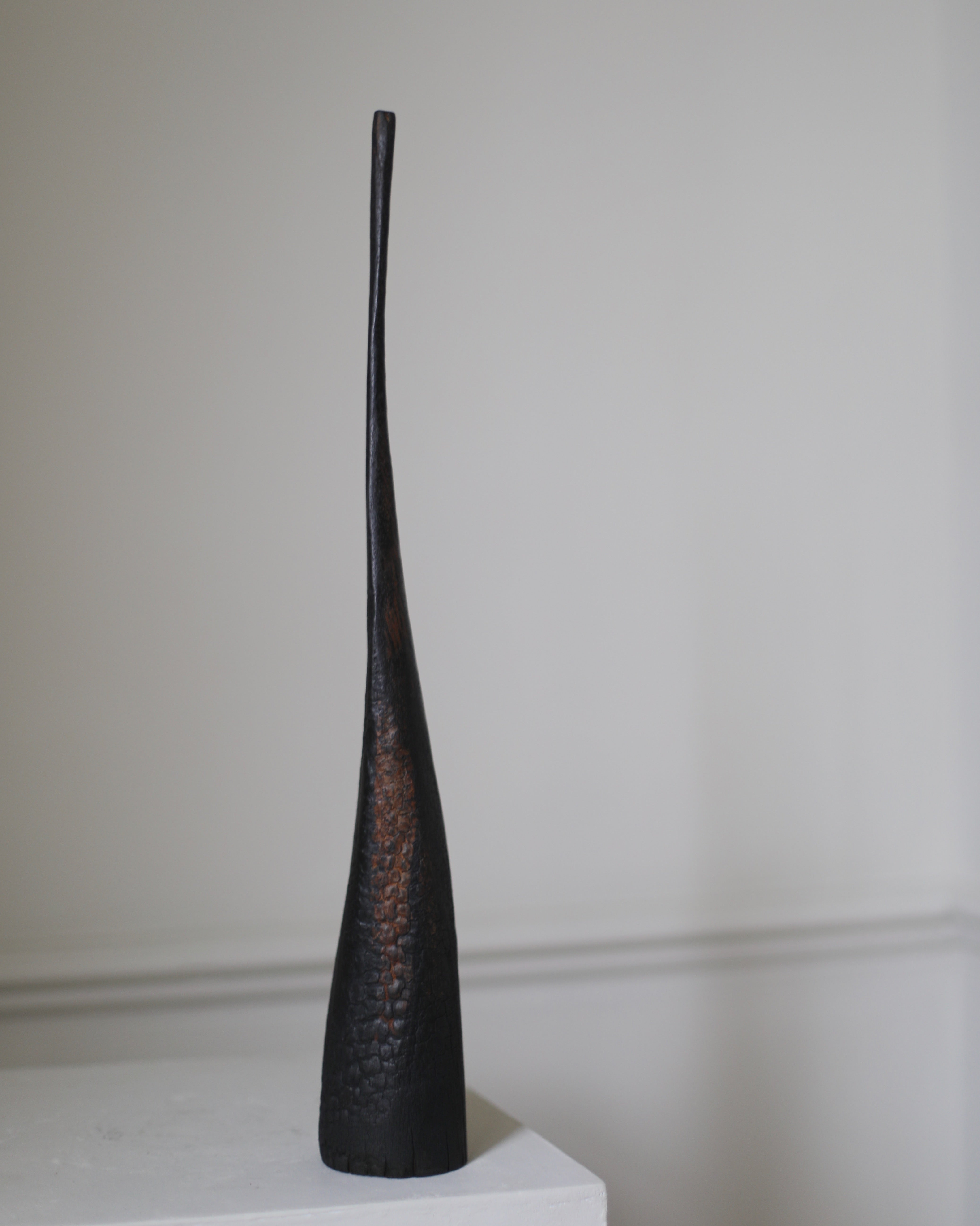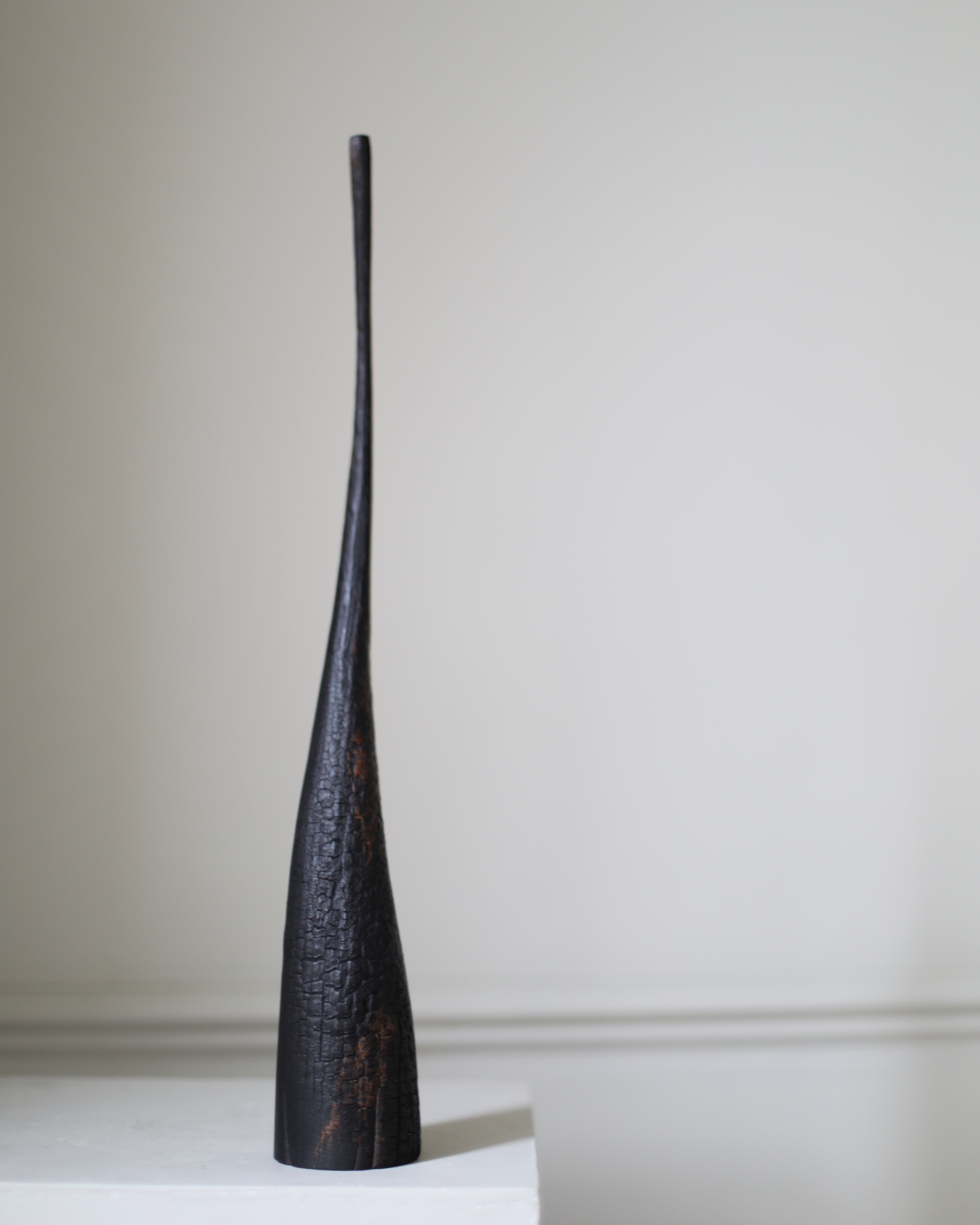 Concerned with portraying a sense of the sacred, this conical wooden sculpture features a rich, charred textured surface, red stains and a long neck gracefully stretching upwards evoking natural forms such as a sprouting plant. Titled “Muluvenice” from the Etruscan word meaning "(has been) dedicated to” this series draws inspiration from a distant, even ancient, past.